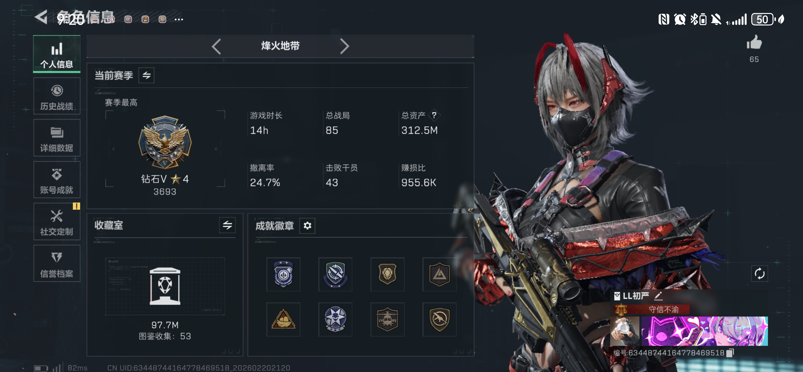 190M,现金68m,北极星,4传送干员皮肤,19传说枪械,9仓,7体,部门全3级。