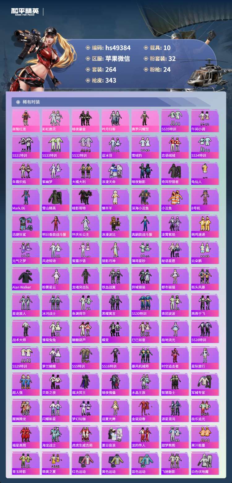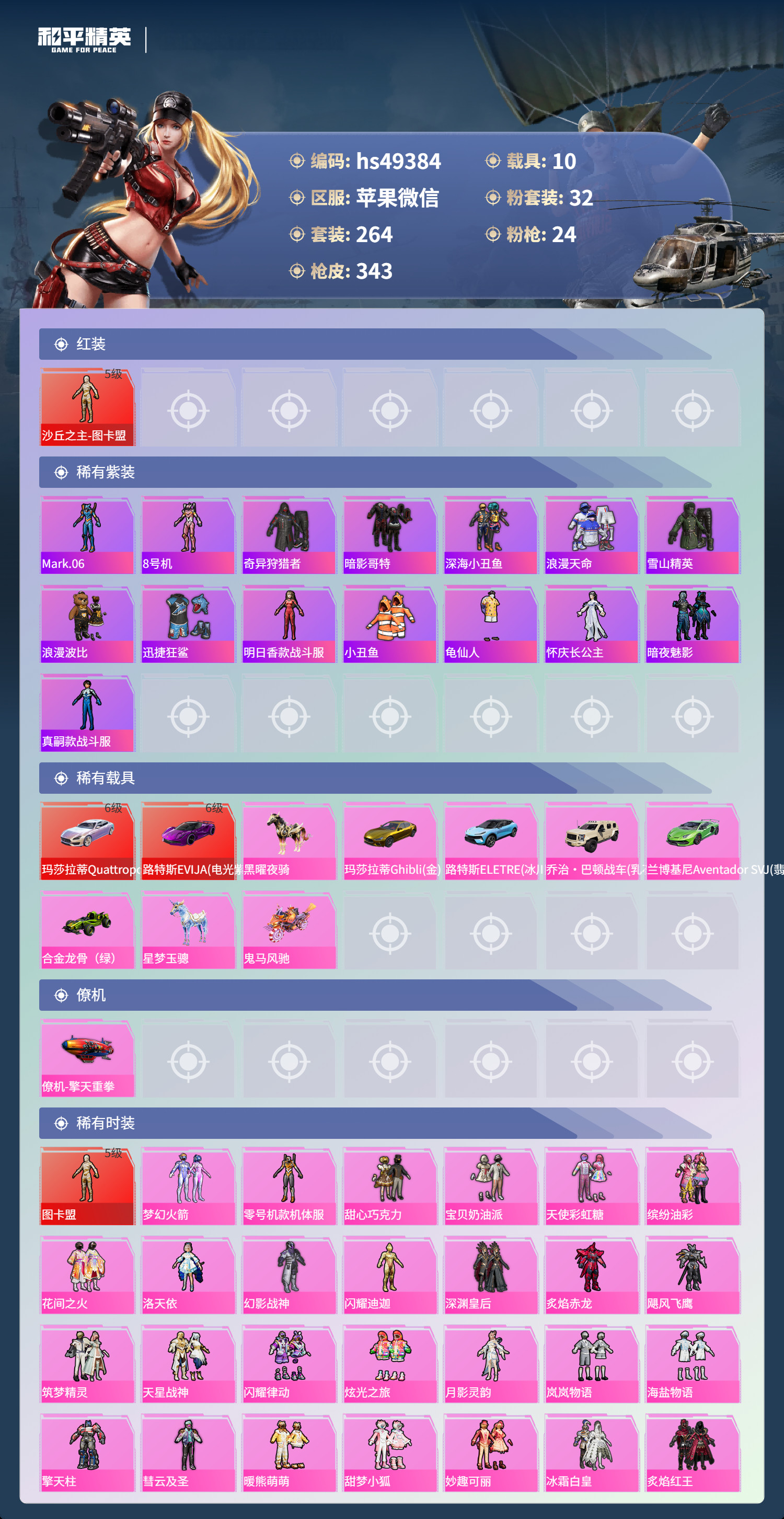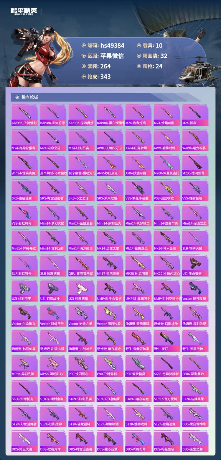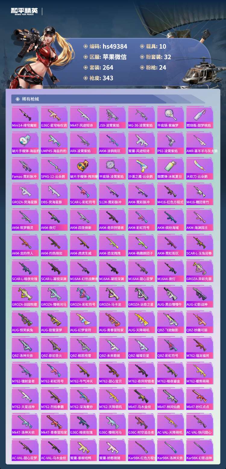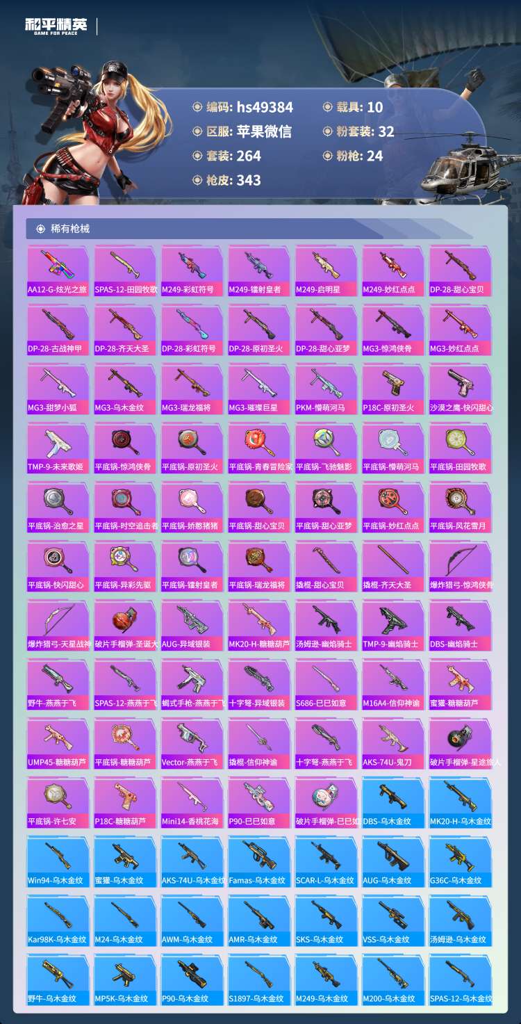 hs49384 苹果微-18王牌印记-有战神框-1红装-32粉装-24特效枪-10载具-17097