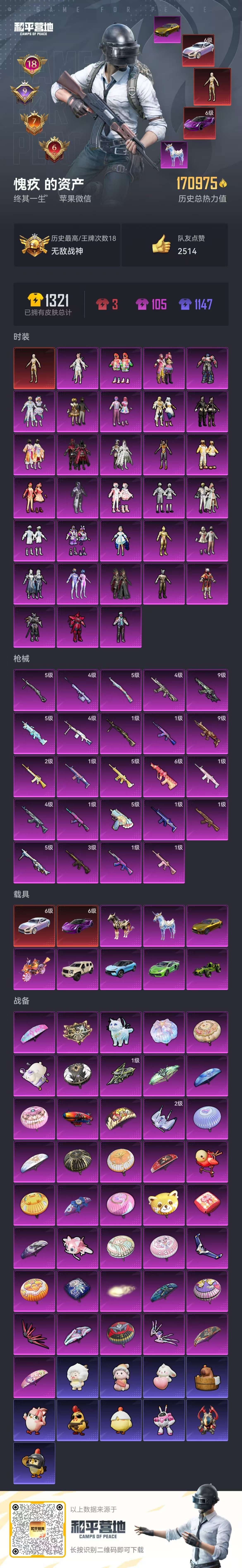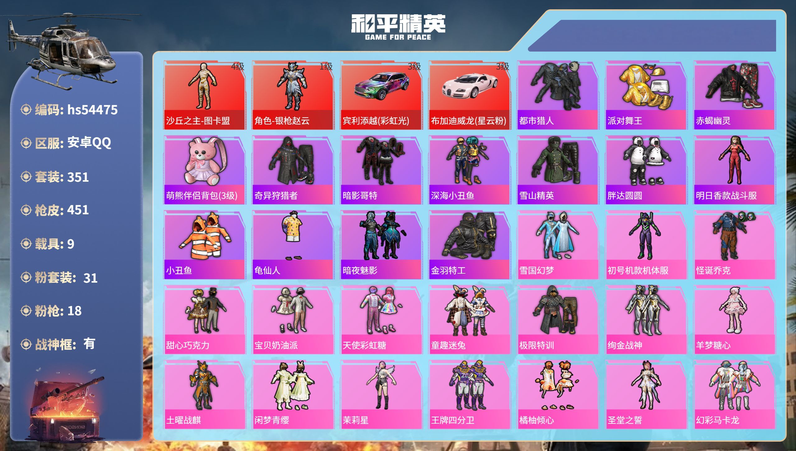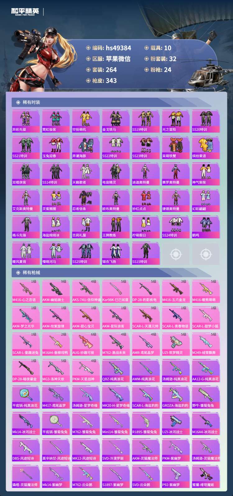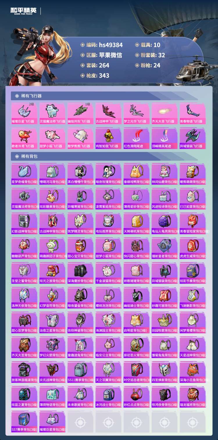 hs49384 苹果微-18王牌印记-有战神框-1红装-32粉装-24特效枪-10载具-17097