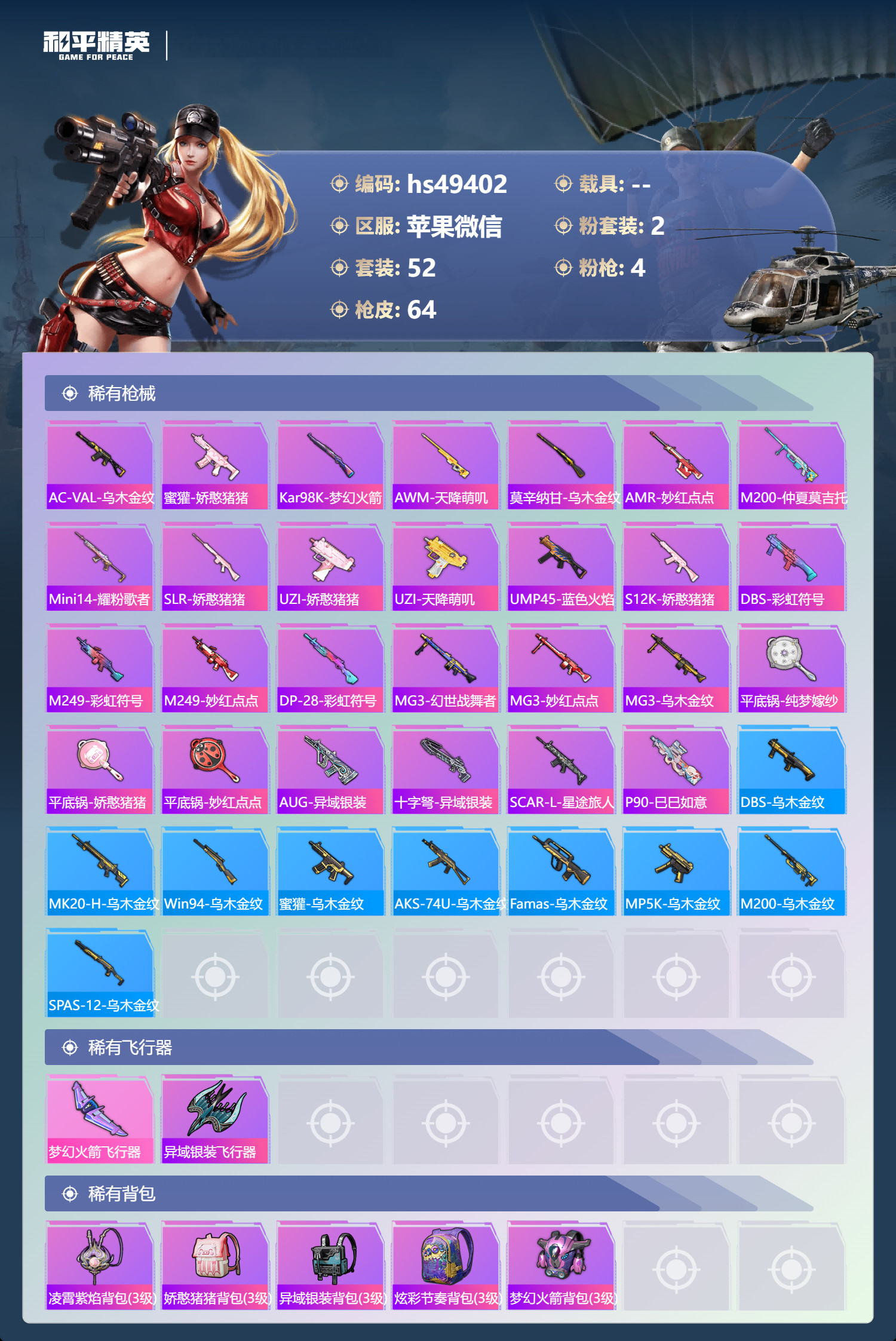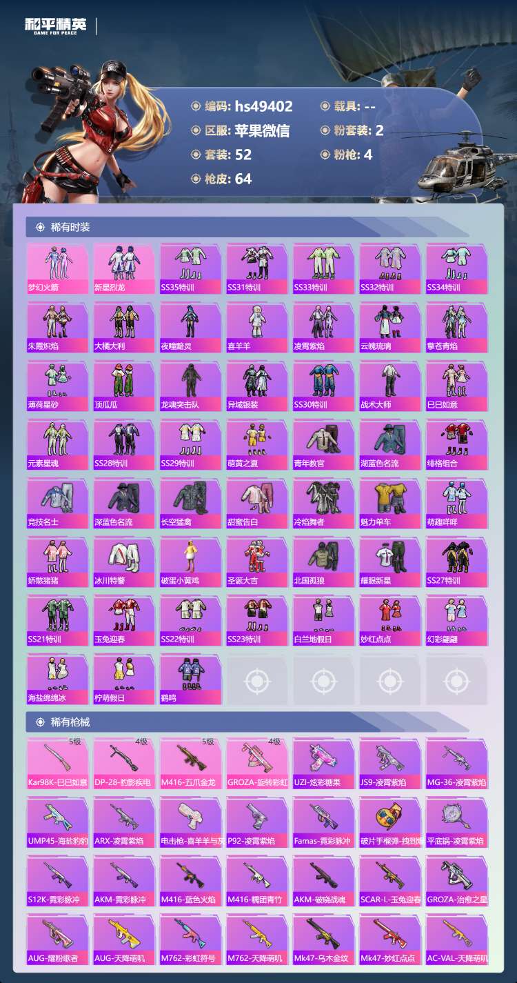 hs49402 苹果微-6王牌印记-2粉装-4特效枪-22041热力值-52套装-64枪皮-3卓越