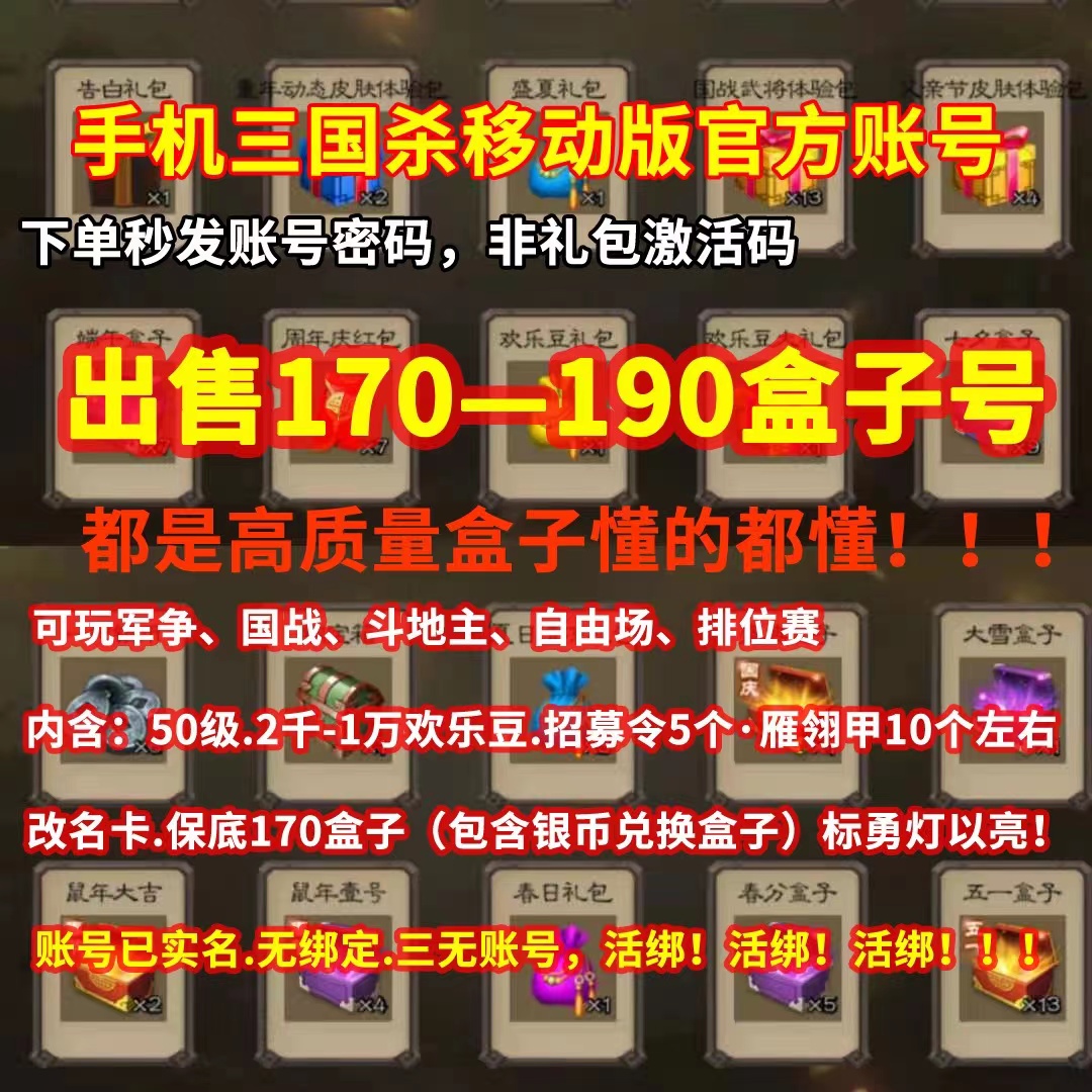 手机三国杀 移动版账号带若干盒子4级树元宝号开局号盒子号追梦