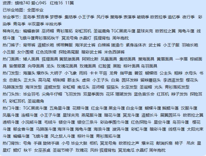 稀有礼包:蝙蝠套装 巫师帽 青衫落拓 彩虹耳机 圣诞鹿角 TGC黑底斗篷 星球夹克 欧若拉之翼 海龟斗篷 线框斗篷 飞蛾斗篷青衫落拓秋千 冥龙号角 水晶灯 狐狸背包 周年抱枕