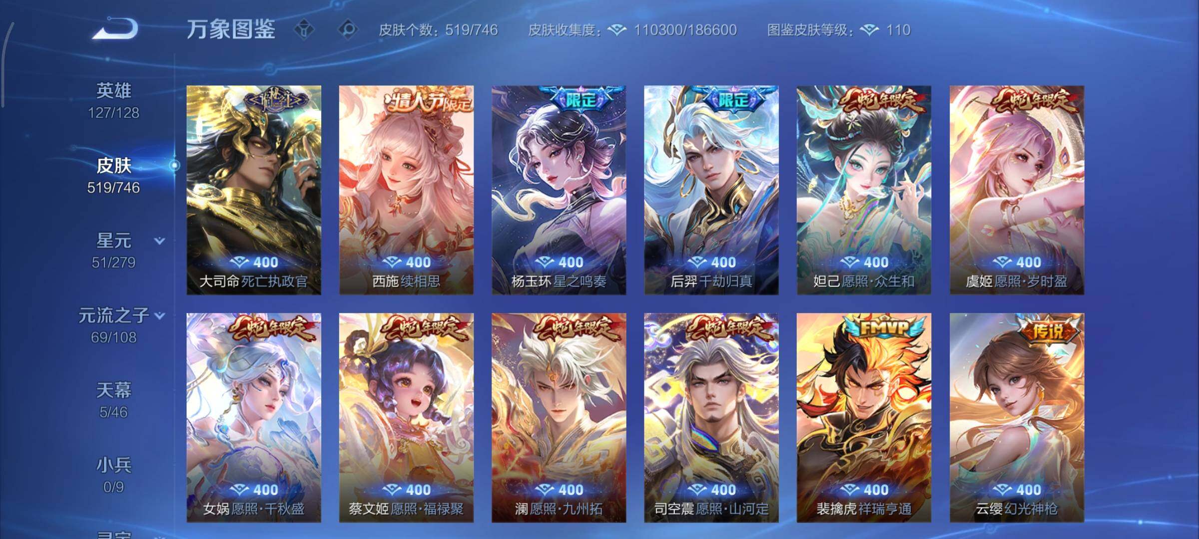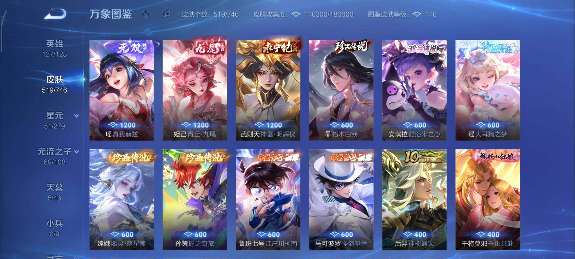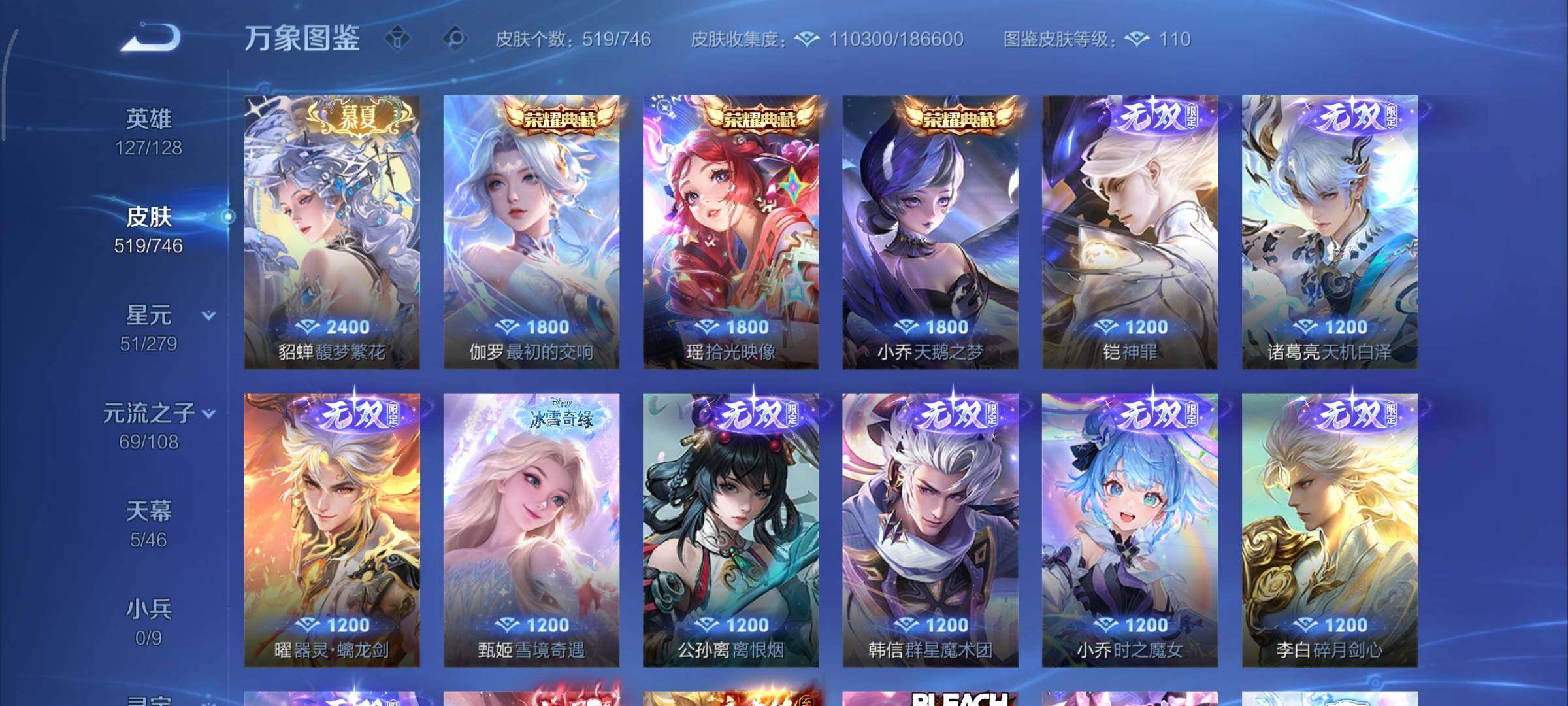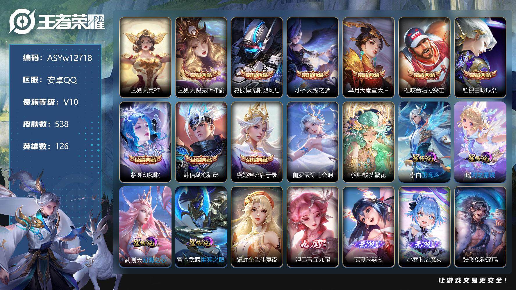可换绑【无双V10精品女号 贵族积分29万 貂蝉慕夏全皮 妲己西施王昭君甄姬嫦