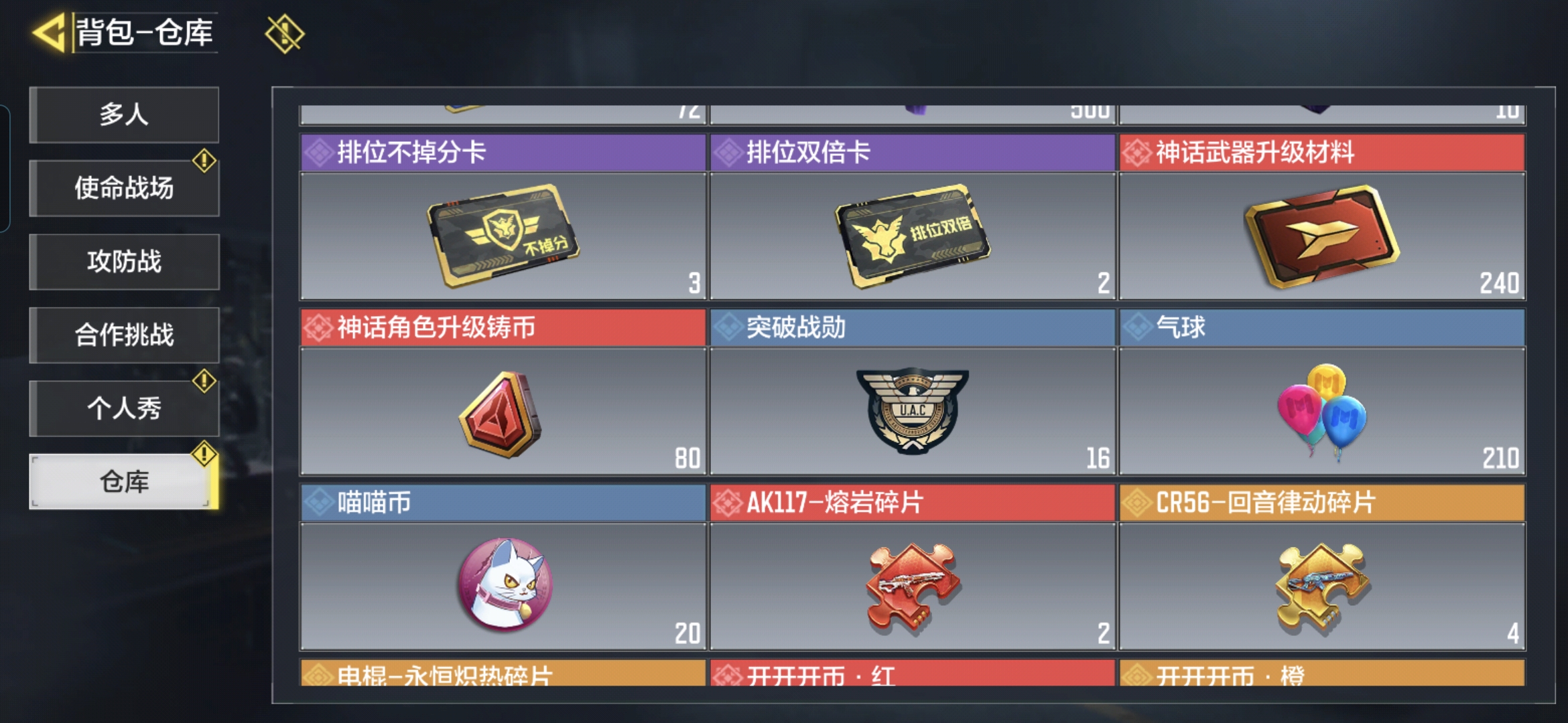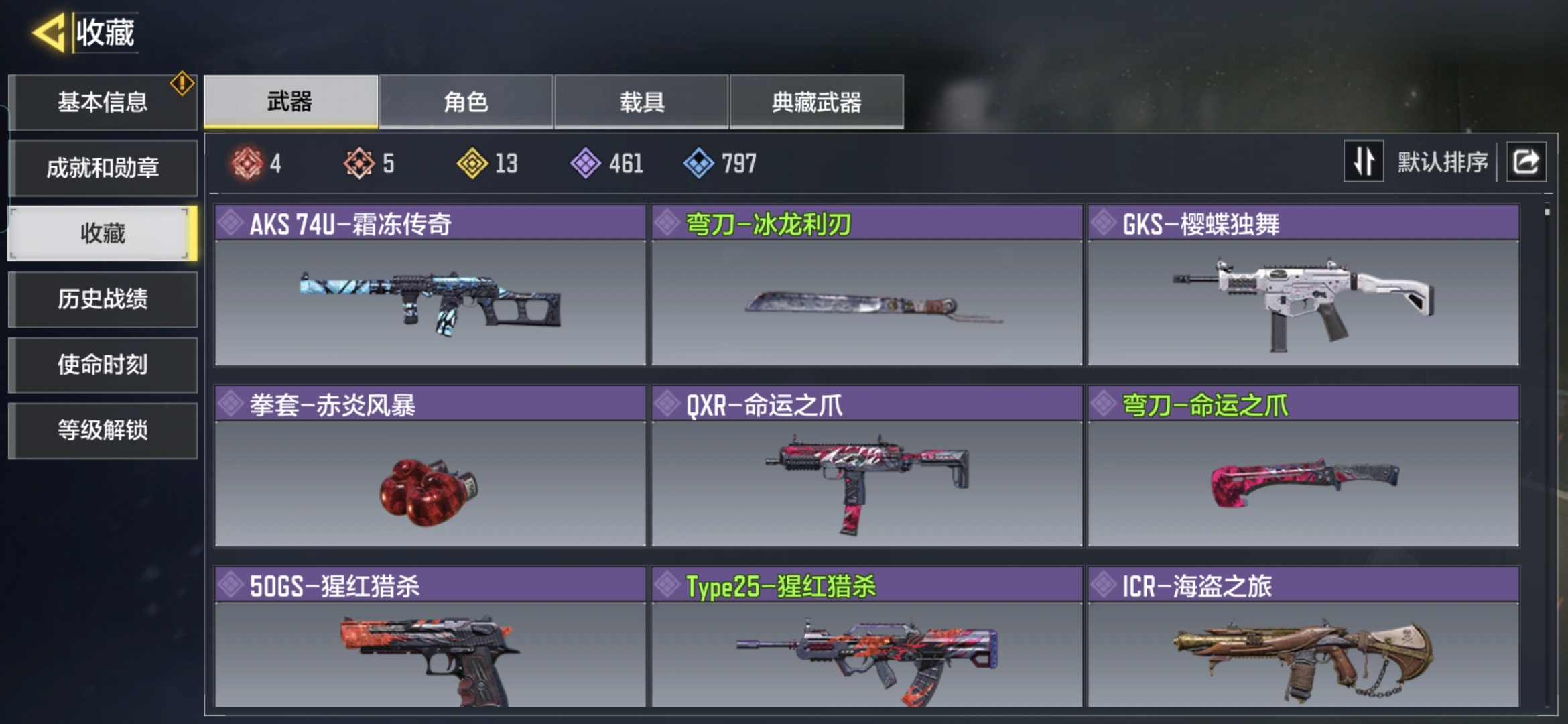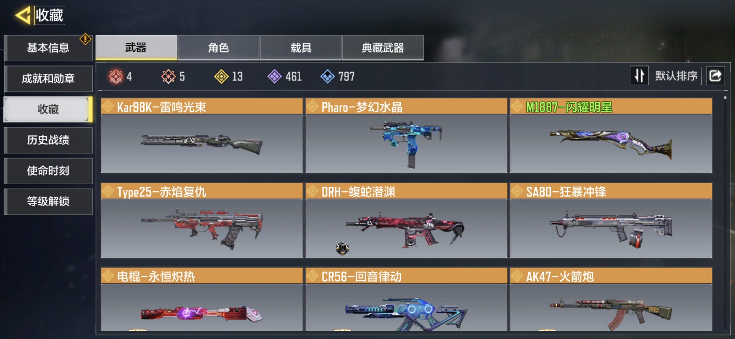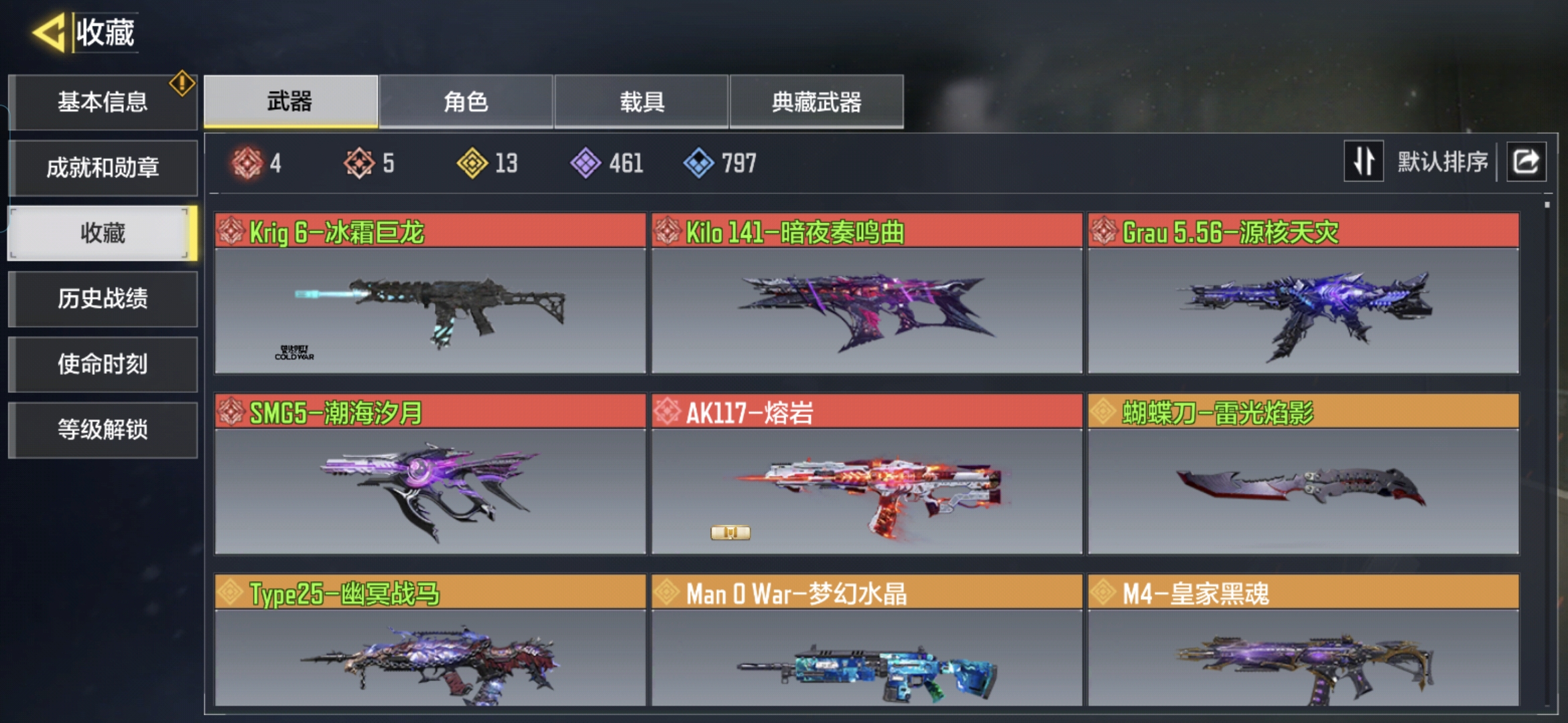 MHZ1648【5红4满14金】安卓Q-等级377-史诗枪械461 【5神话】 Grau 5.56-源核天灾 SMG5-潮海汐月 Krig 6-冰霜巨龙 Kilo 141-暗夜奏鸣曲 AK117-熔岩 【13传说】 CR56-回音律动 电棍-永恒炽热 SA80-狂暴冲锋 M1887-闪耀明星 Kar98K-雷鸣光束 Type25-幽冥战马 蝴蝶刀-雷光焰影 AK47-火箭炮 ORH-蝮蛇潜渊 Type25-赤焰复仇 Pharo-梦幻水晶 M4-皇家黑魂 Man0 War-梦幻水晶 【1传说角色】