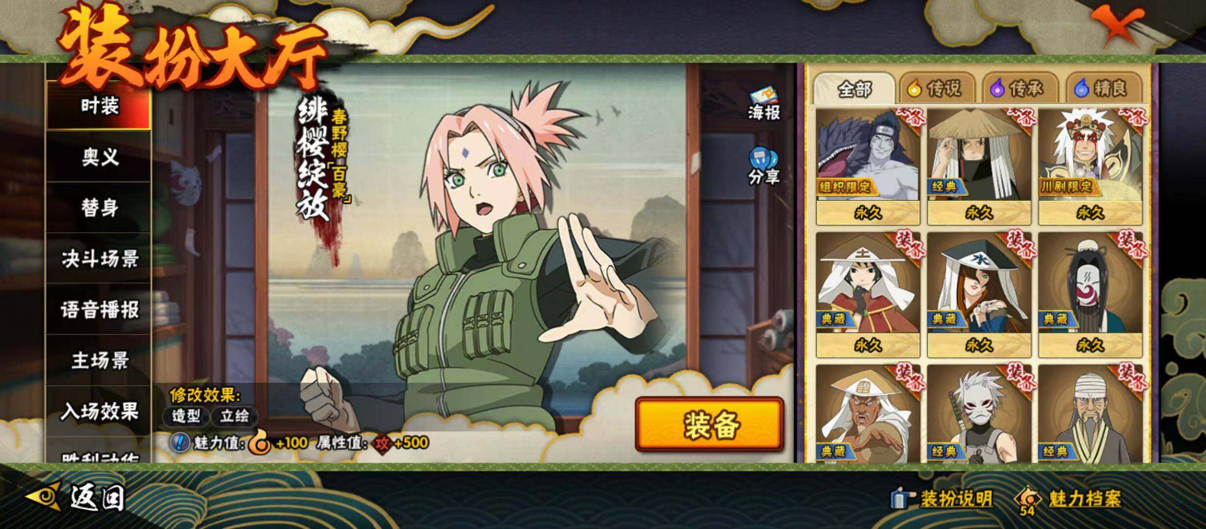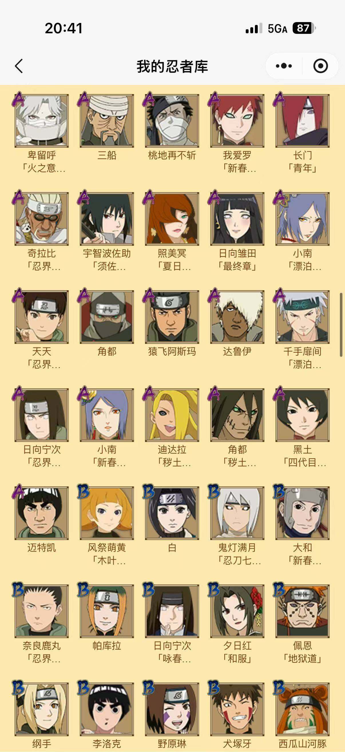 【S级忍者】:长门「秽土转生」(3星),三代目风影「秽土转生」(3星),半藏「秽土转生」(3星),金角·银角「秽土转生」(3星),猿飞日斩「秽土转生」(3星),波风水门「秽土转生」(3星),千手扉间「秽土转生」(3星),千手柱间「秽土转生」(3星),宇智波鼬「秽土转生」(3星),宇智波斑「秽土转生」(3星),宇智波斑「秽土转生·解」(3星),大野木「忍界大战」(3