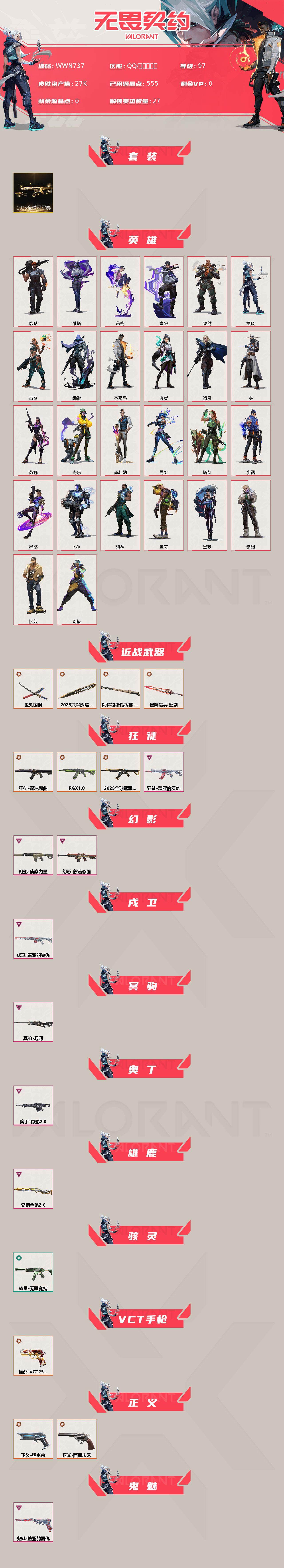 【WWN737】终极*10/卓越*8/皮肤*51/等级*97/段位:铂金/2025全球冠军赛套装/幻棱/炼狱/维斯/暮蝶/钛狐/壹决/铁臂/捷风/雷兹/幽影/不死鸟/贤者/猎枭/零/芮娜/奇乐/尚勃勒/霓虹/斯凯/夜露/星礈/K/O/海神/盖可/黑梦/钢锁/近战武器-2025全球冠军赛 蝴蝶刀/近战武器-鬼丸国纲/近战武器-阿特拉斯指挥部 甩棍/近战武器-星际猎兵 短剑/狂徒-2025全球冠军赛/狂徒-混沌序曲/狂徒-RGX 11z Pro/狂徒-盖亚的复仇/幻影-般若假面/幻影-侦察力量/戍卫