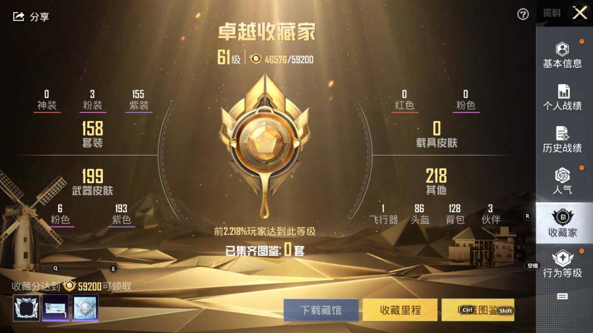3粉装-6特效枪-0载具-0粉色飞行器-65327热力值-6王牌印记-158套装-218枪皮