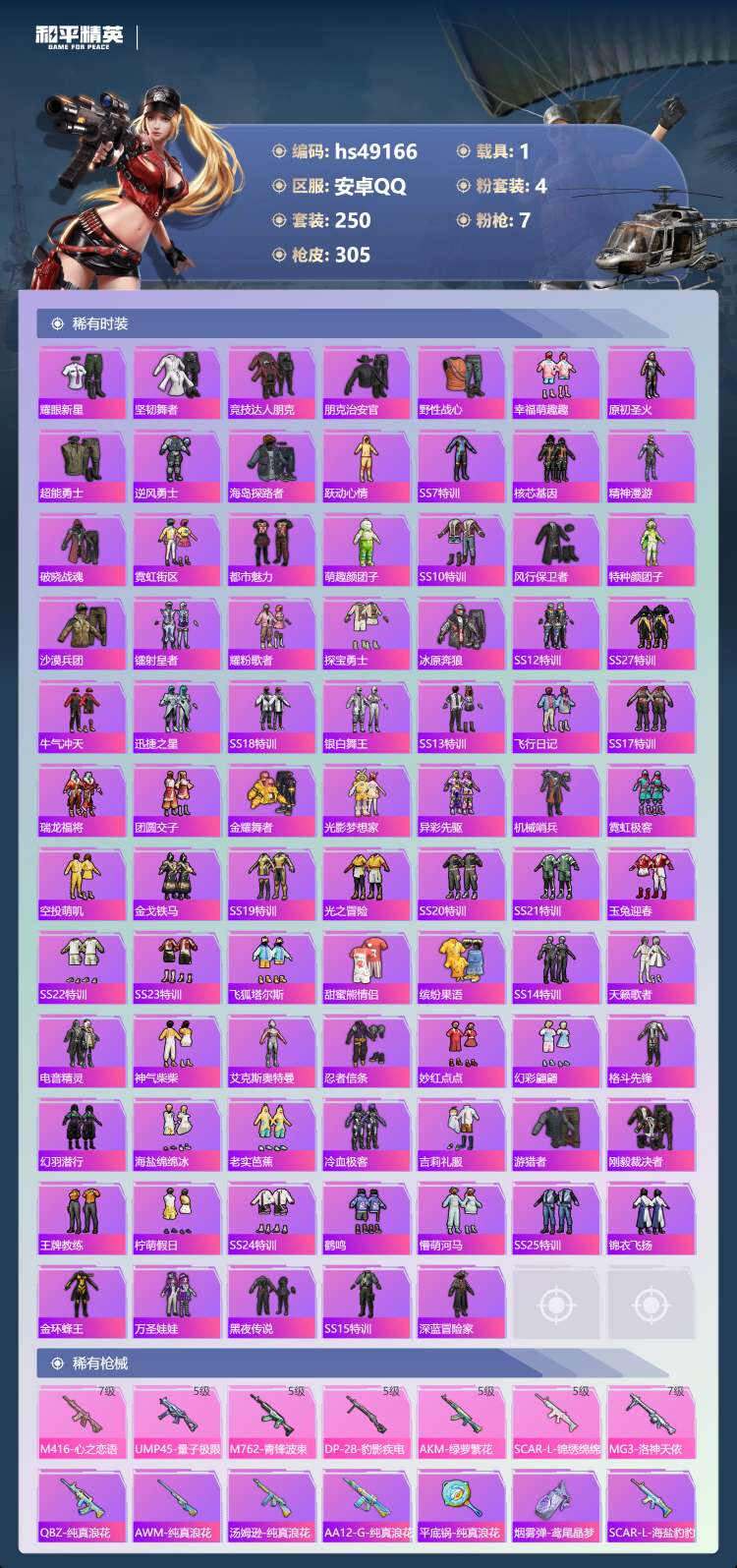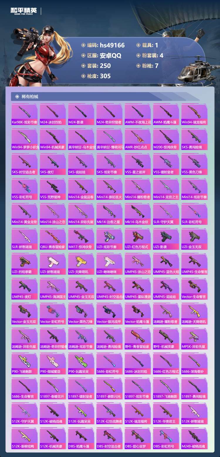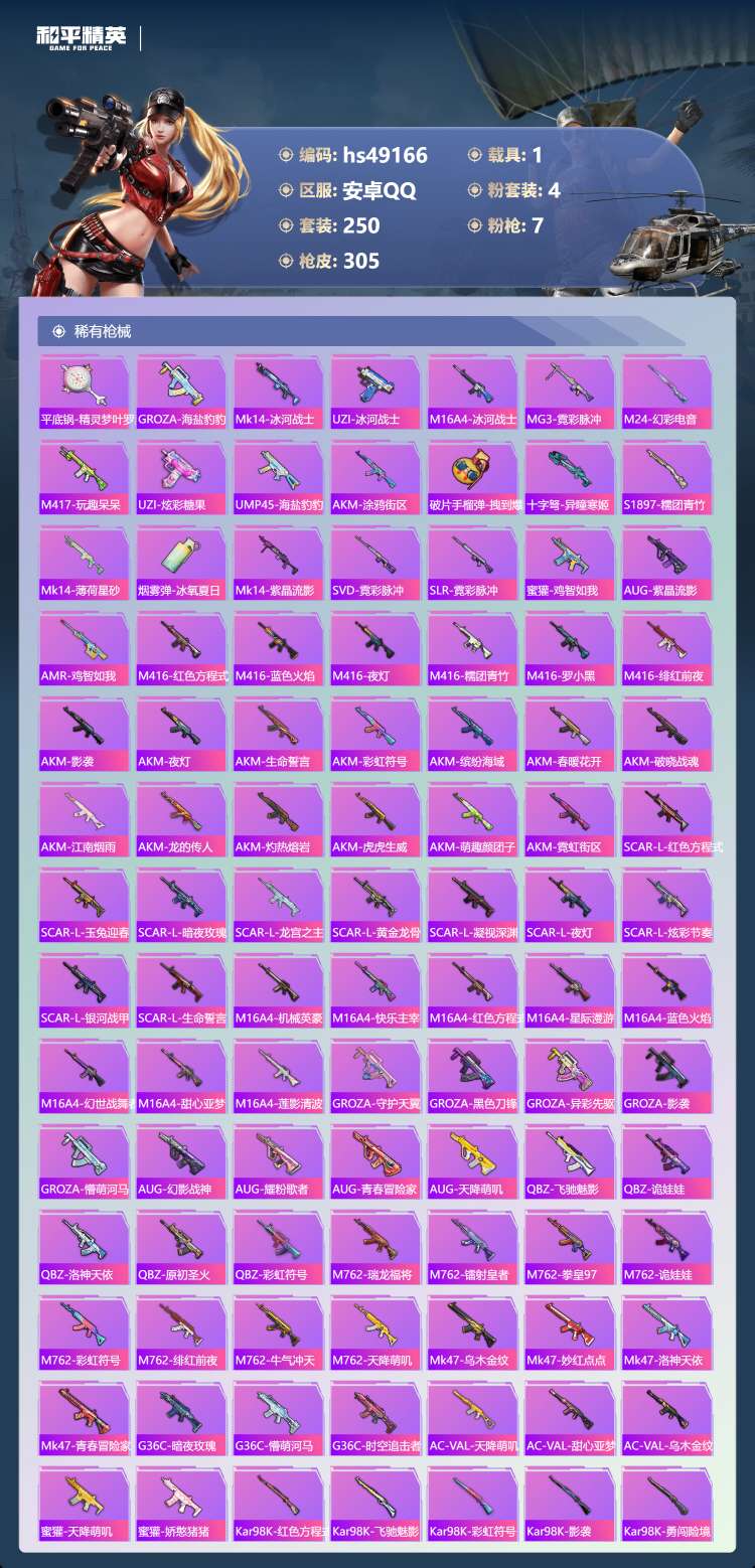 hs49166 安卓手Q-12王牌印记-4粉装-7特效枪-1载具-93137热力值-250套装-30