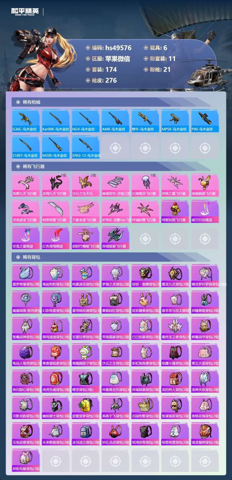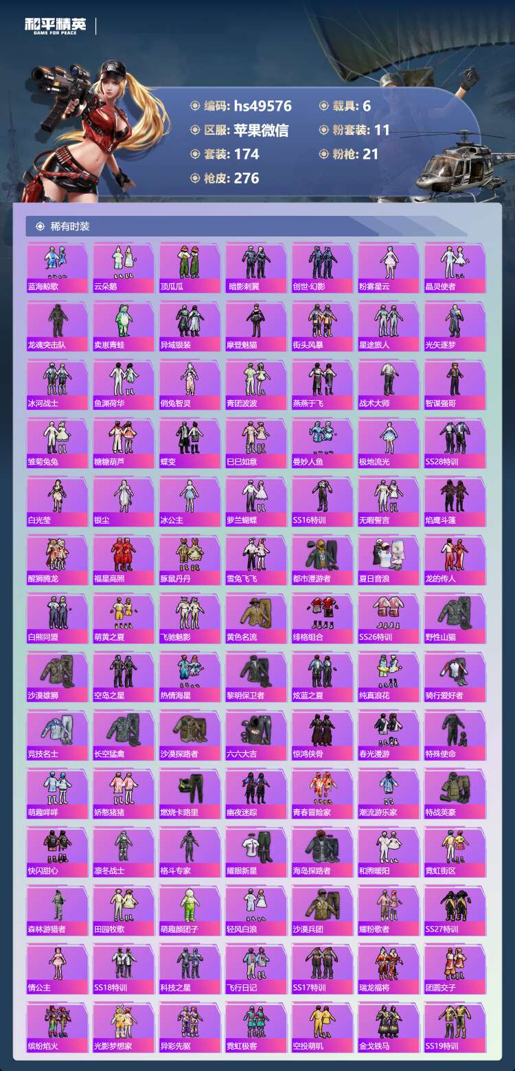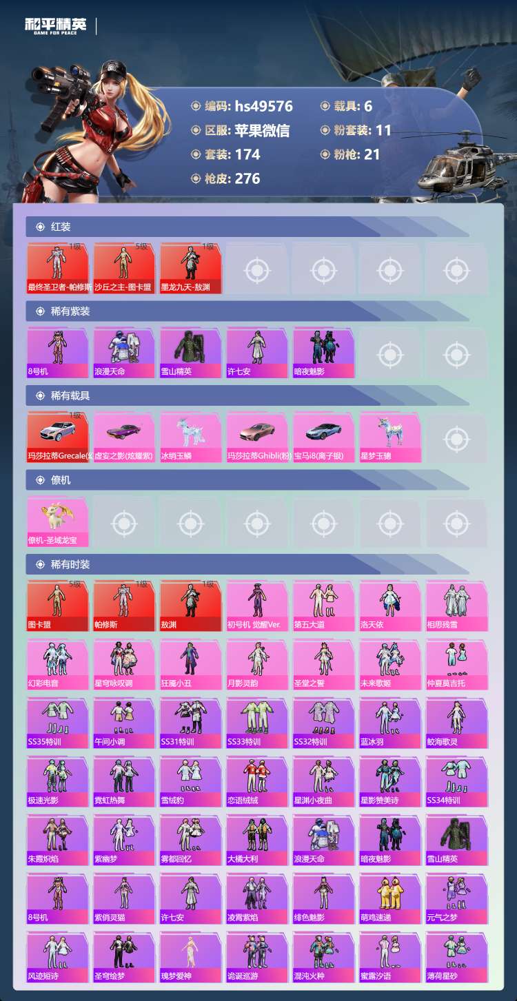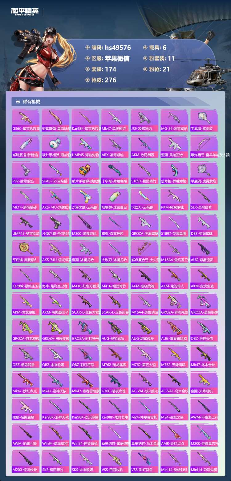 hs49576 苹果v-14王牌印记-3红装-11粉装-21特效枪-6载具-113253热力值-1