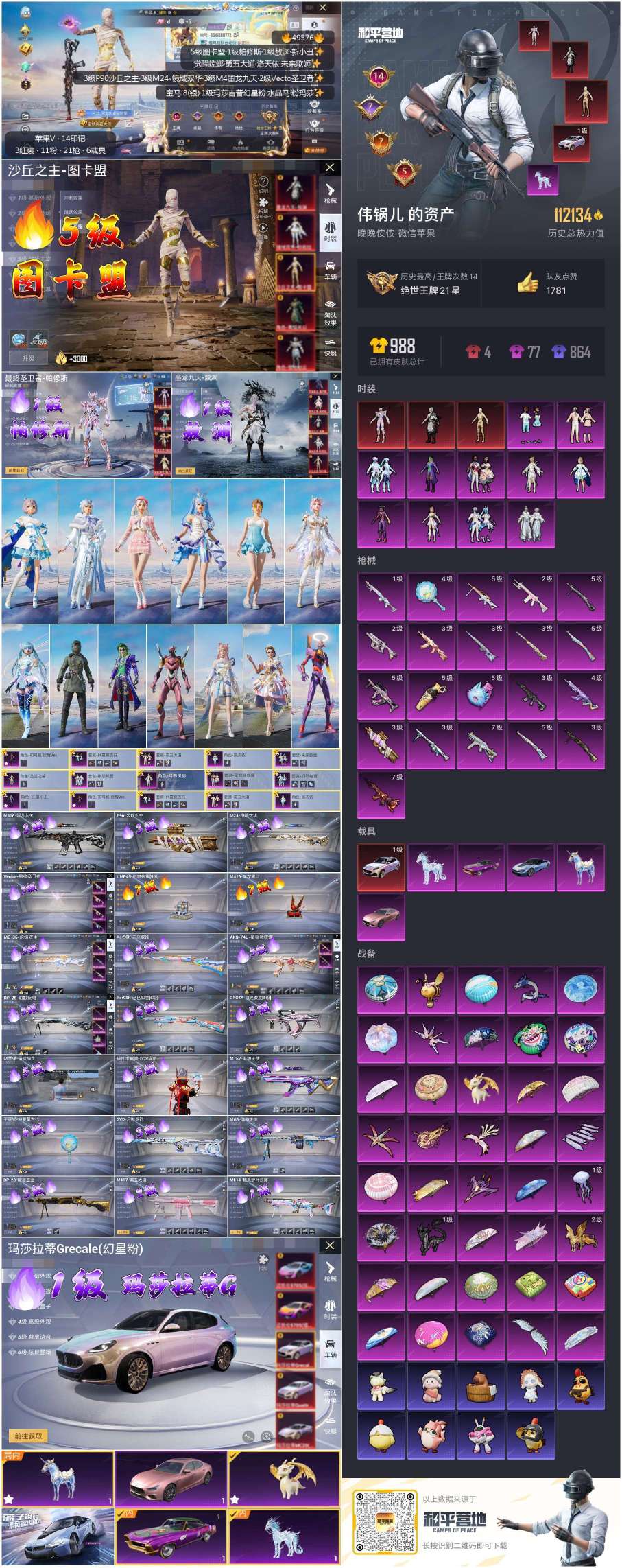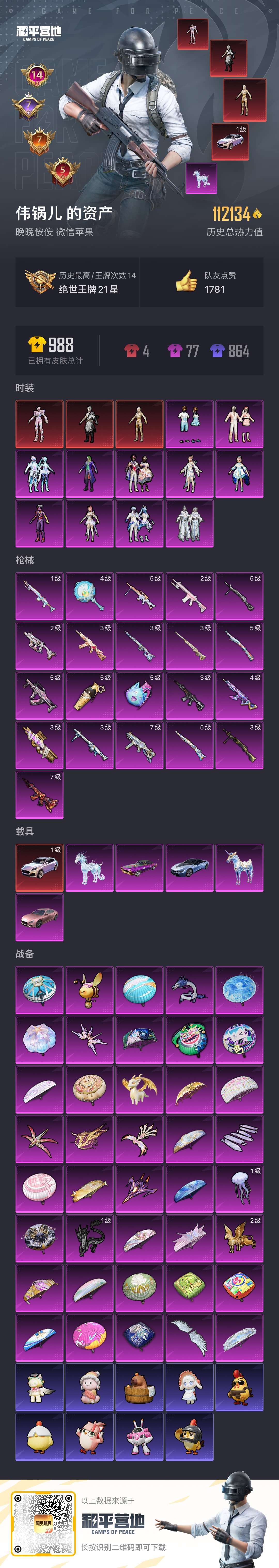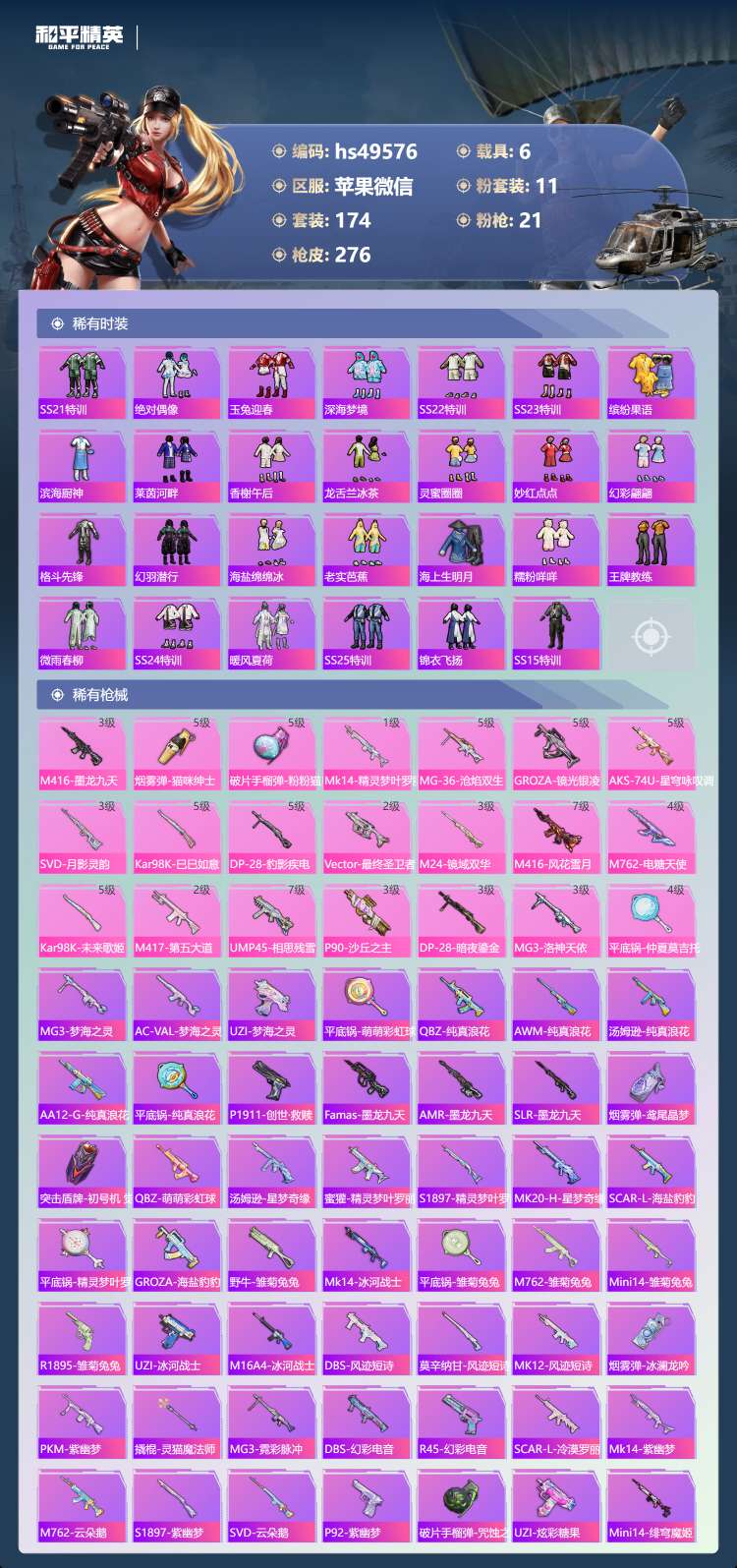 hs49576 苹果v-14王牌印记-3红装-11粉装-21特效枪-6载具-113253热力值-1