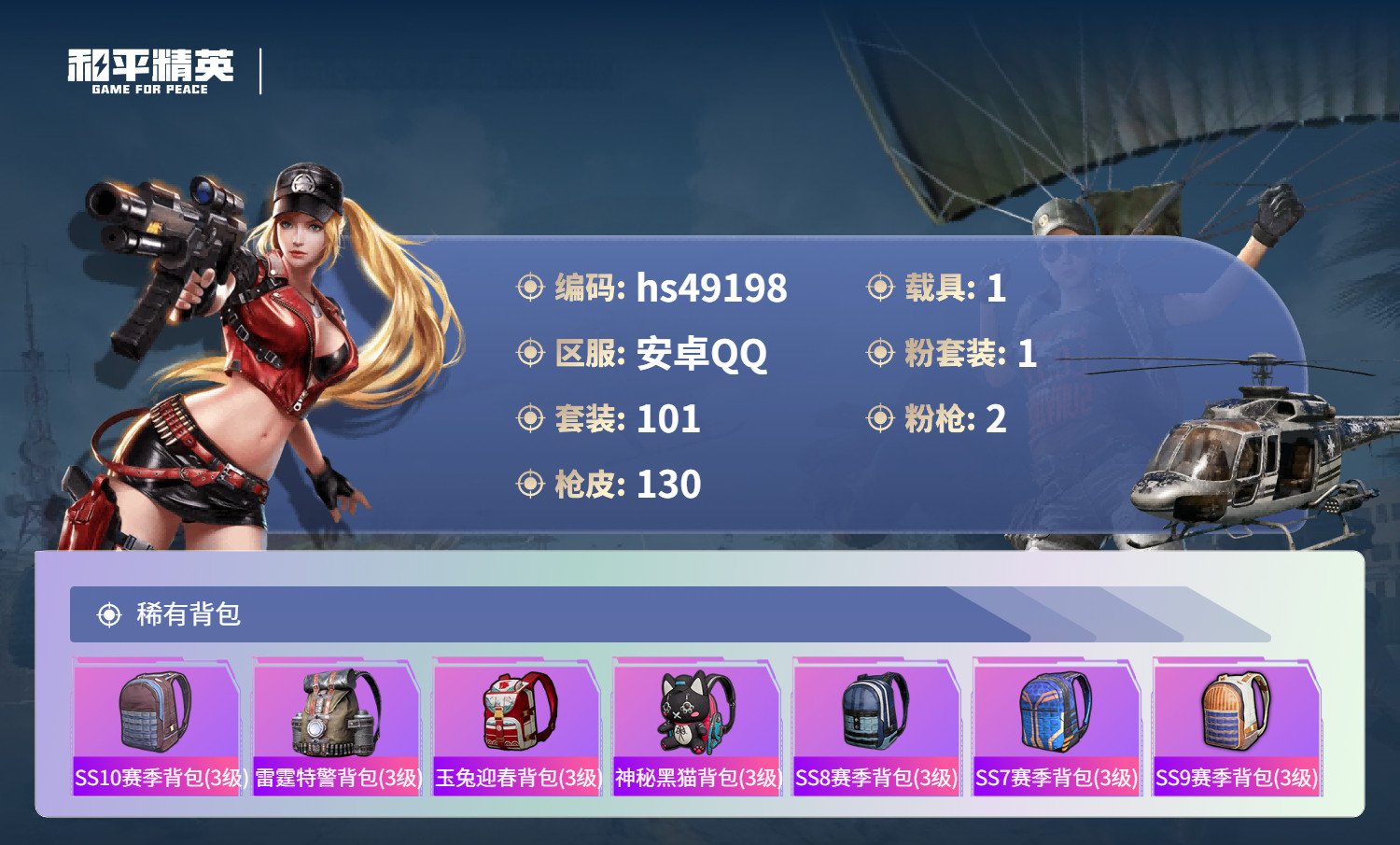 hs49198 安卓手Q-2王牌印记-1粉装-2特效枪-1载具-44799热力值-101套装-130