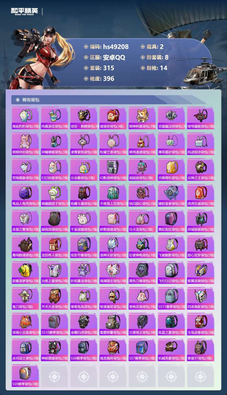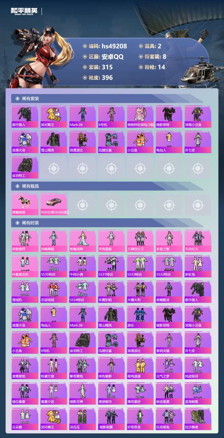 hs49208 安卓手Q-13王牌印记-8粉装-14特效枪-2载具-132821热力值-315套装-