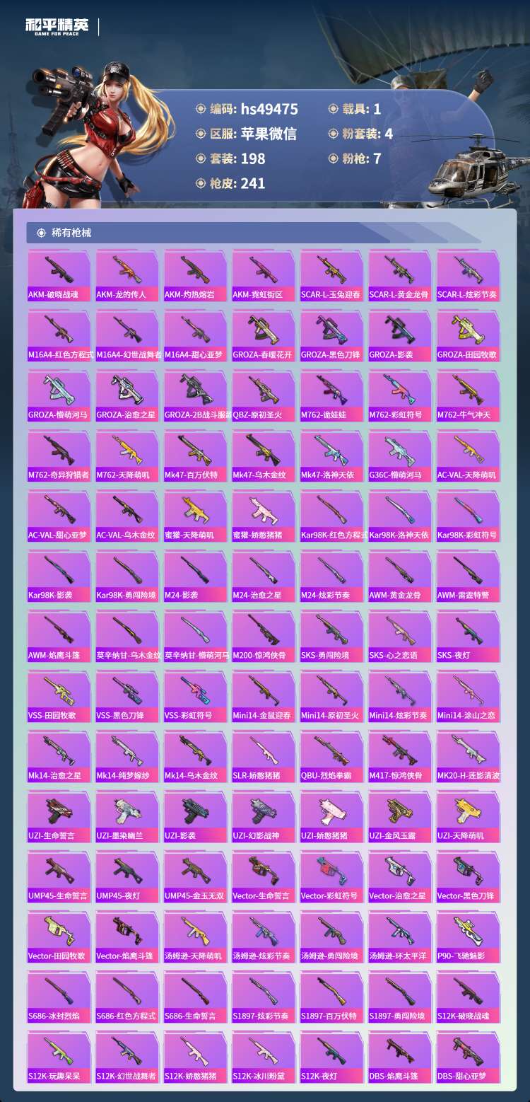 hs49475 苹果微-20王牌印记-有战神框-4粉装-7特效枪-1载具-75953热力值-198