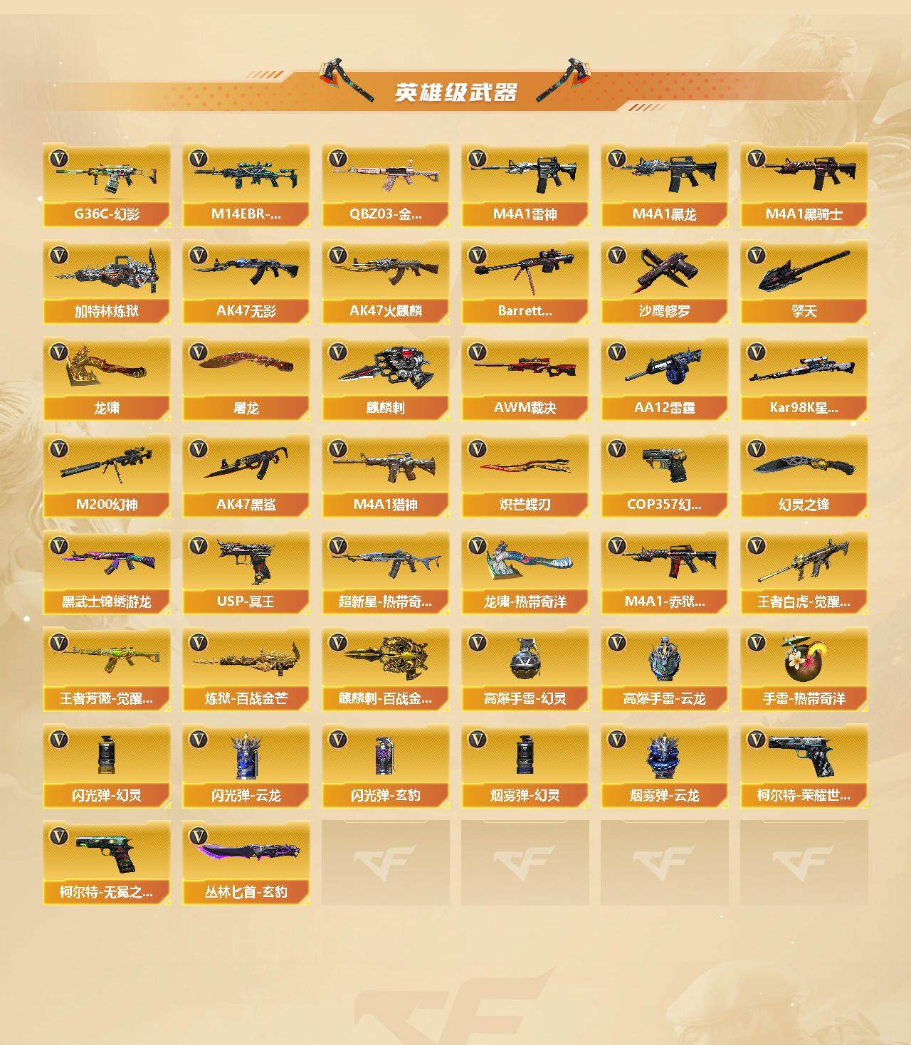 【热门武器】:传说梦魇(序列号版),传说灵眸,G36C-幻影,QBZ03-金色蔷薇,M14EBR-玄武,M200-幻神,柯尔特-荣耀世冠白鲨2023*2,Kar98K-星神,M4A1-黑骑士*2,加特林-炼狱,COP 357-幻灵,沙鹰-修罗*6,Knife-冠军之刃*4,炽芒蝶刃*