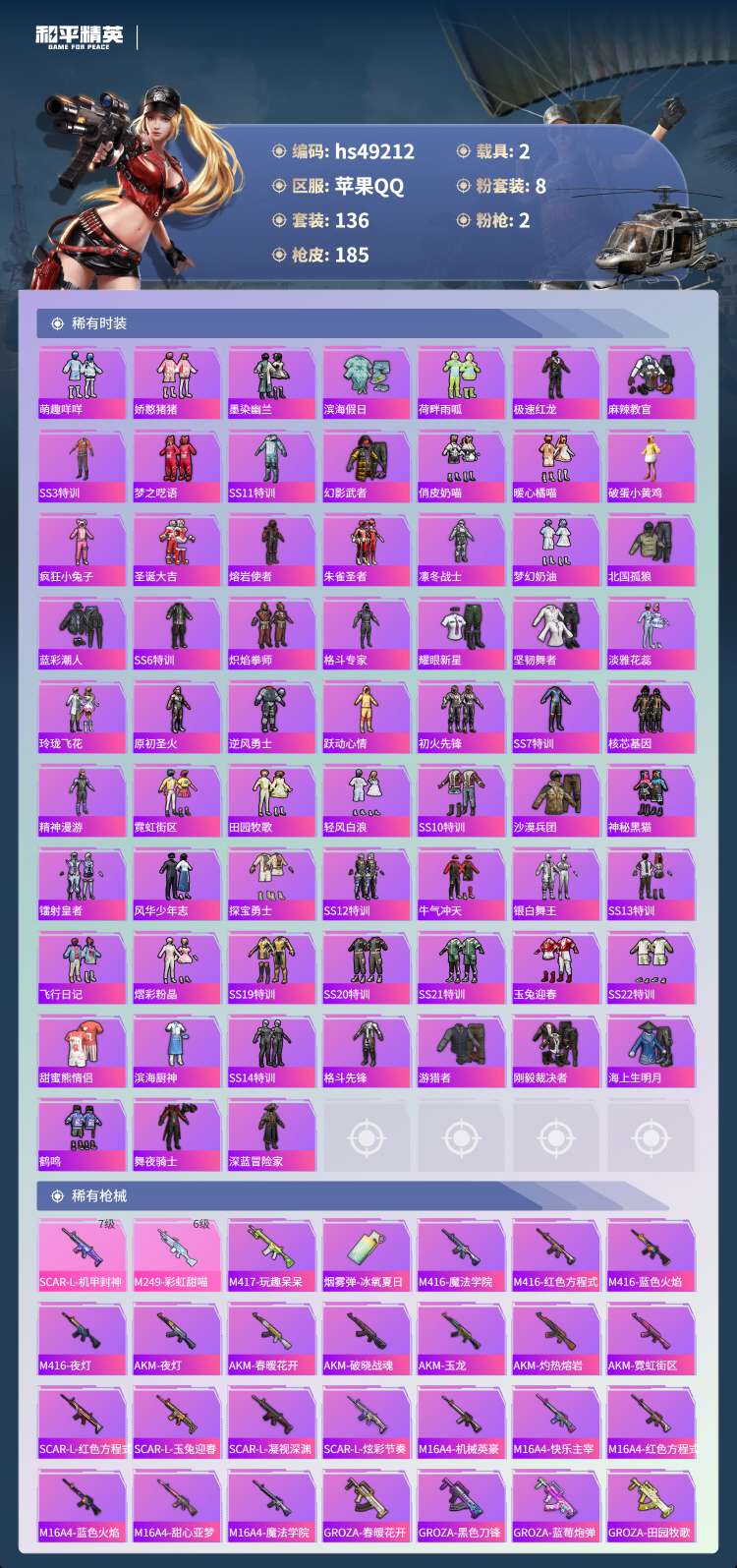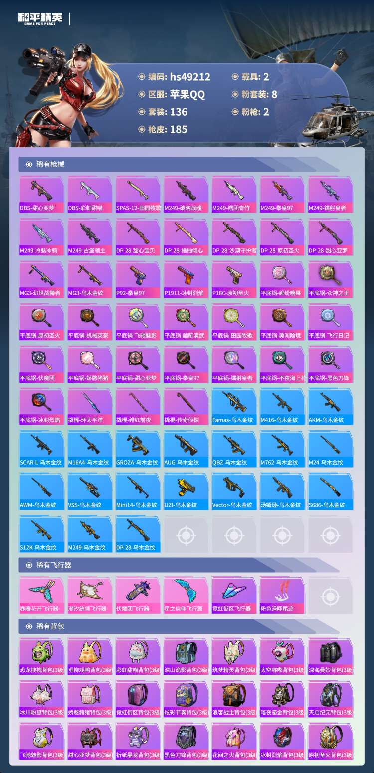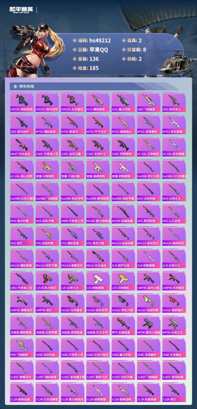 hs49212 苹果手Q-3王牌印记-8粉装-2特效枪-2载具-68546热力值-136套装-185