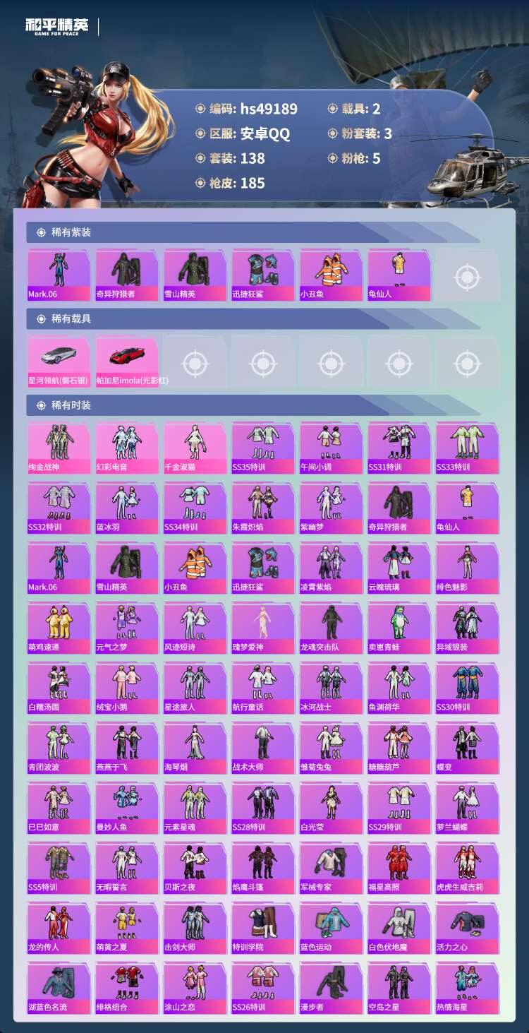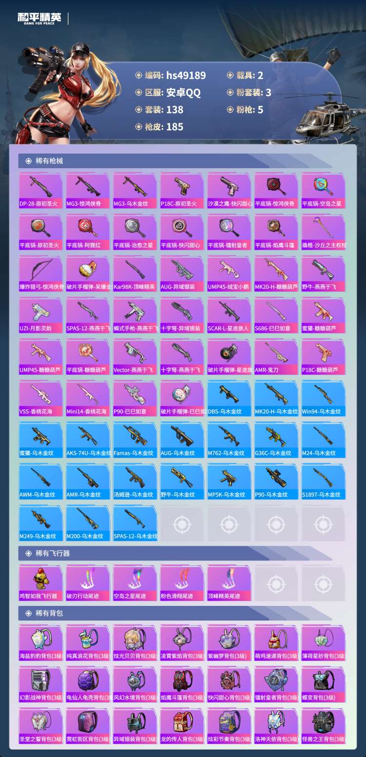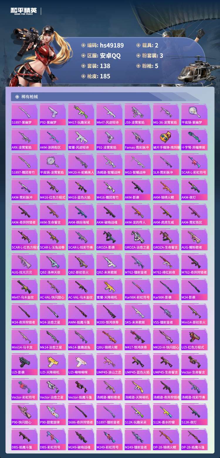 hs49189 安卓手Q-11王牌印记-3粉装-5特效枪-2载具-61772热力值-138套装-18
