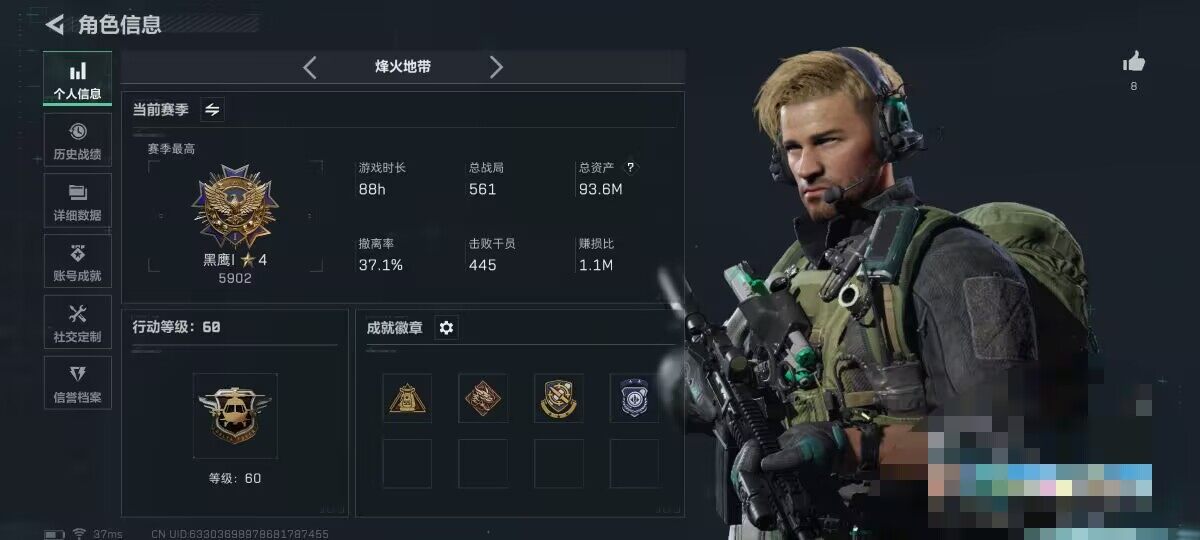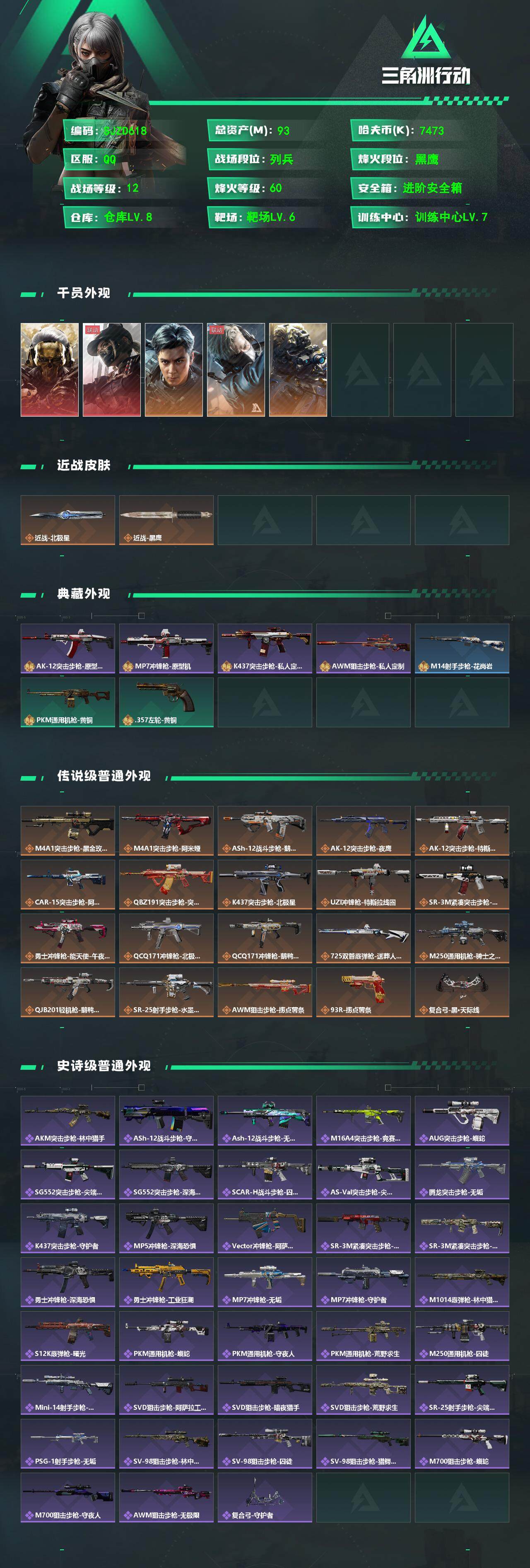 【SJZD618】总资产(M):93M/哈夫币(K):7473K/哈夫币(K):7473K/传说枪皮数:21/全面战场等级:12_段位:列兵/烽火地带等级:60_段位:黑鹰/红狼-蚀金玫瑰/露娜-黑·天际线/威龙-飞虎/蜂医-送葬人·无题密令/无名-夜鹰/近战-北极星/近战-黑鹰/AK-12突击步枪-原型机/MP7冲锋枪-原型机/K437突击步枪-私人定制/AWM狙击步枪-私人定制/M14射手步枪-花岗岩/PKM通用机枪-黄铜/.357左轮-黄铜/M4A1突击步枪-蚀金玫瑰/M4A1突击步枪-阿