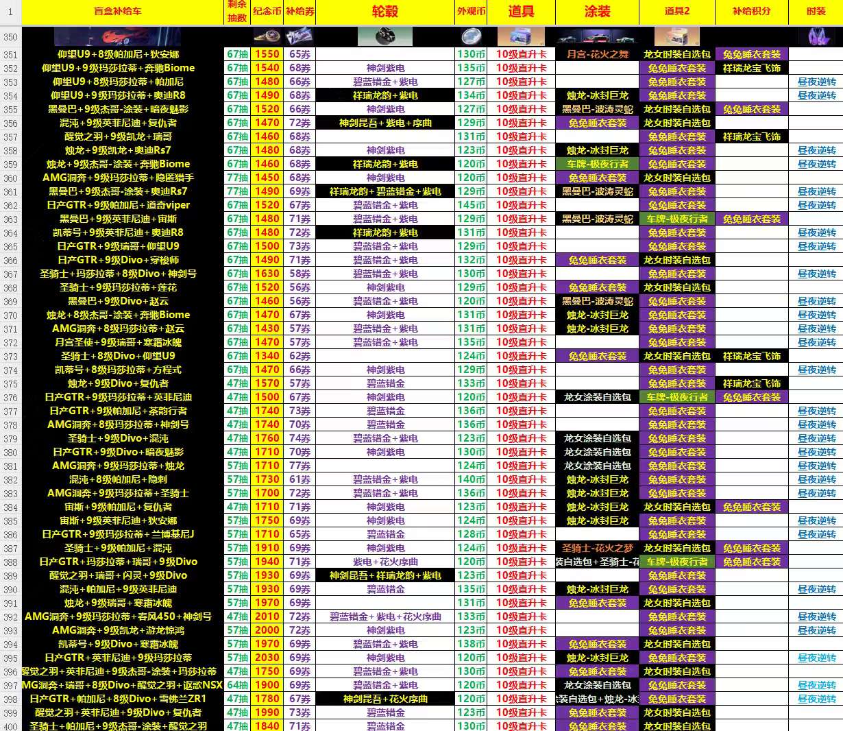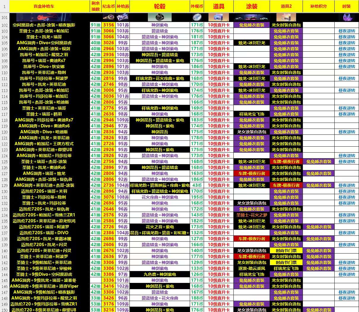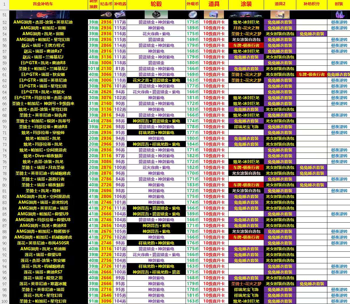一行一个号,拍前先咨询我,绿色是王牌补给剩余多少抽出车,紫字是补给券数量,黄红字是纪念币数量