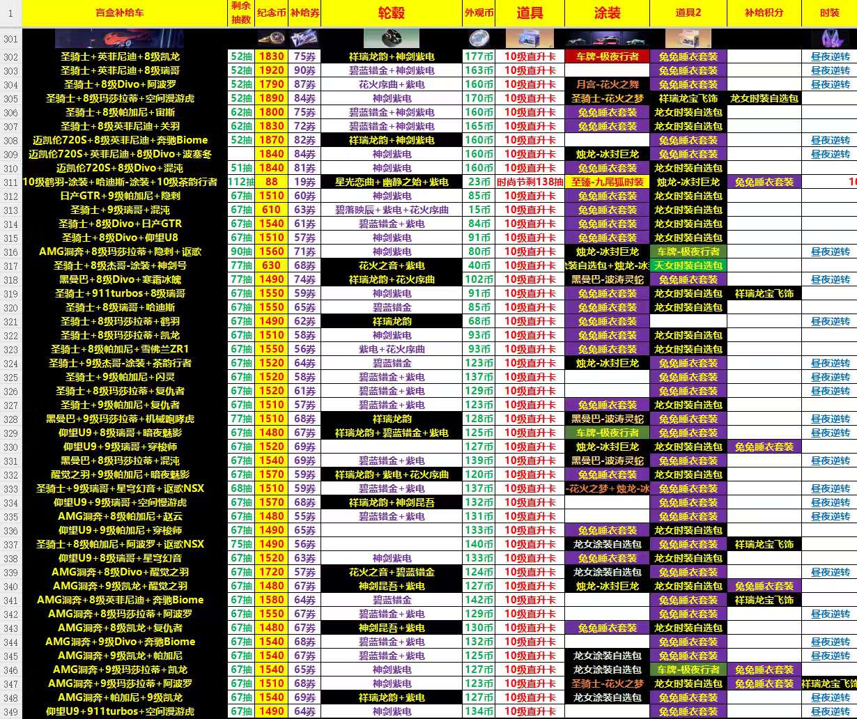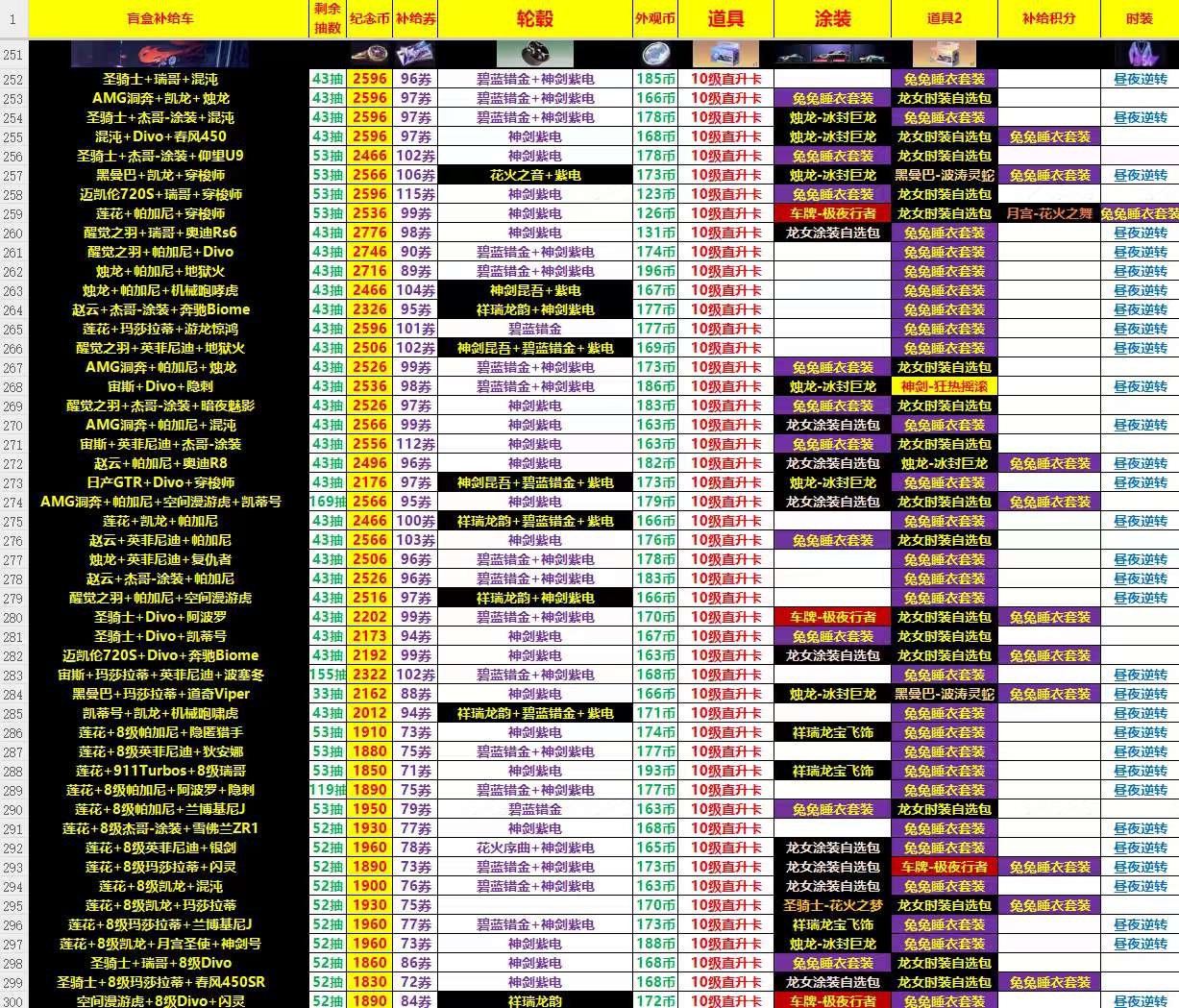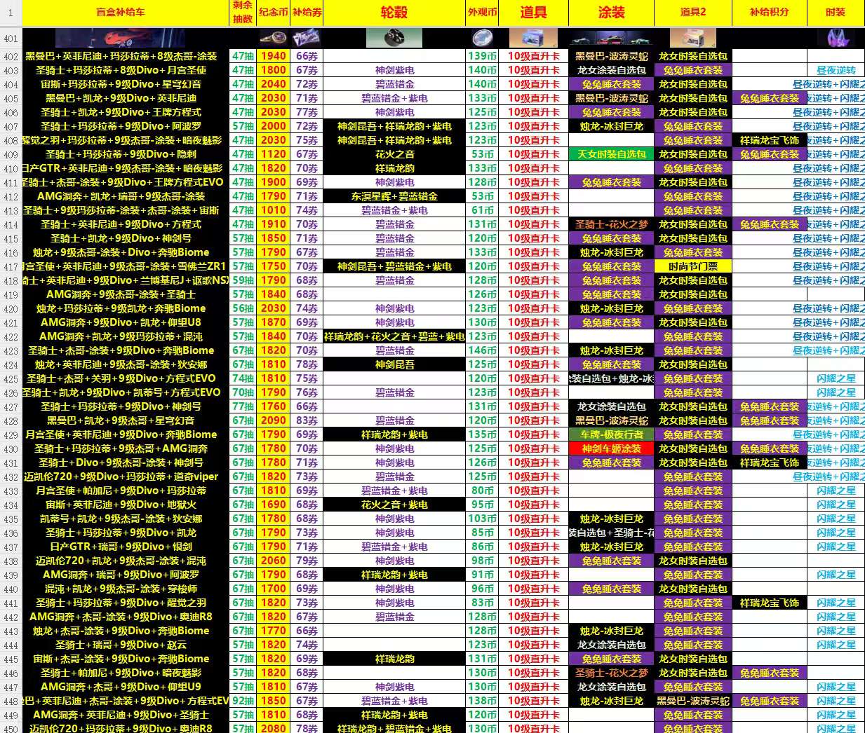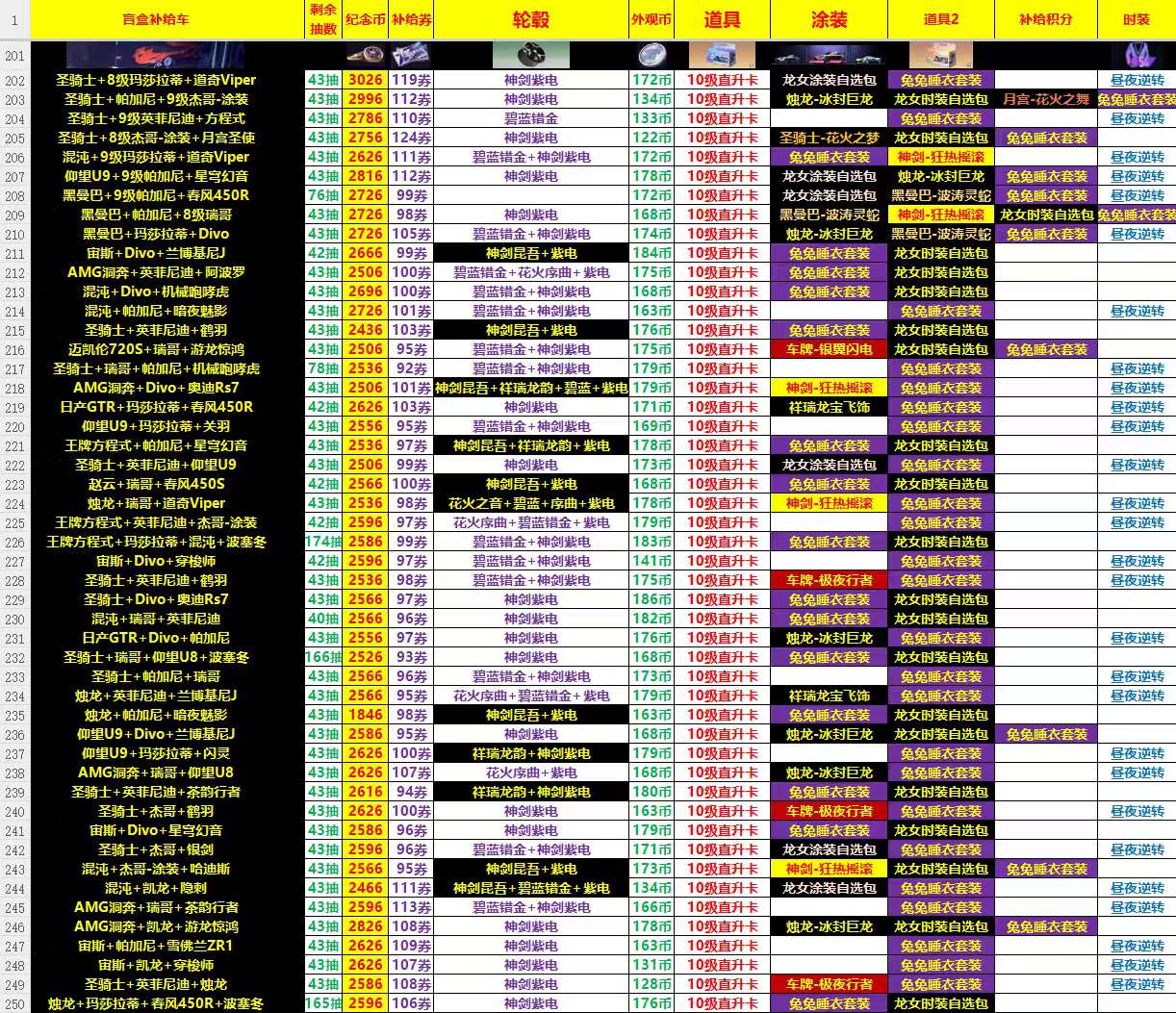 一行一个号,拍前先咨询我,绿色是王牌补给剩余多少抽出车,紫字是补给券数量,黄红字是纪念币数量