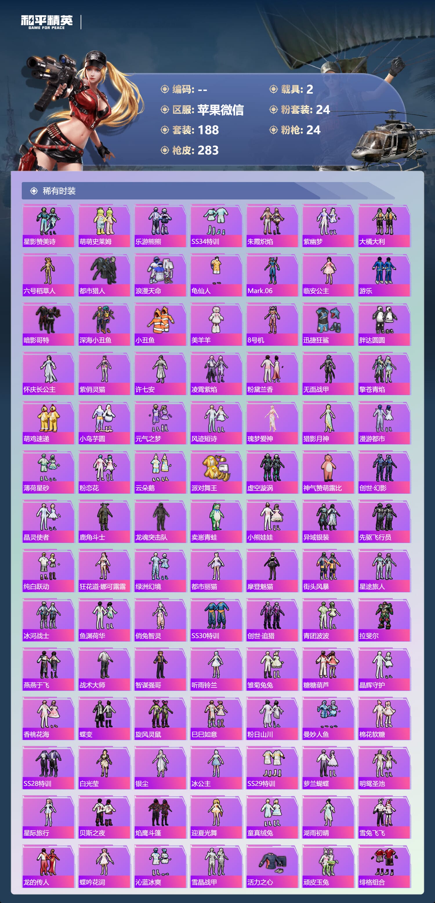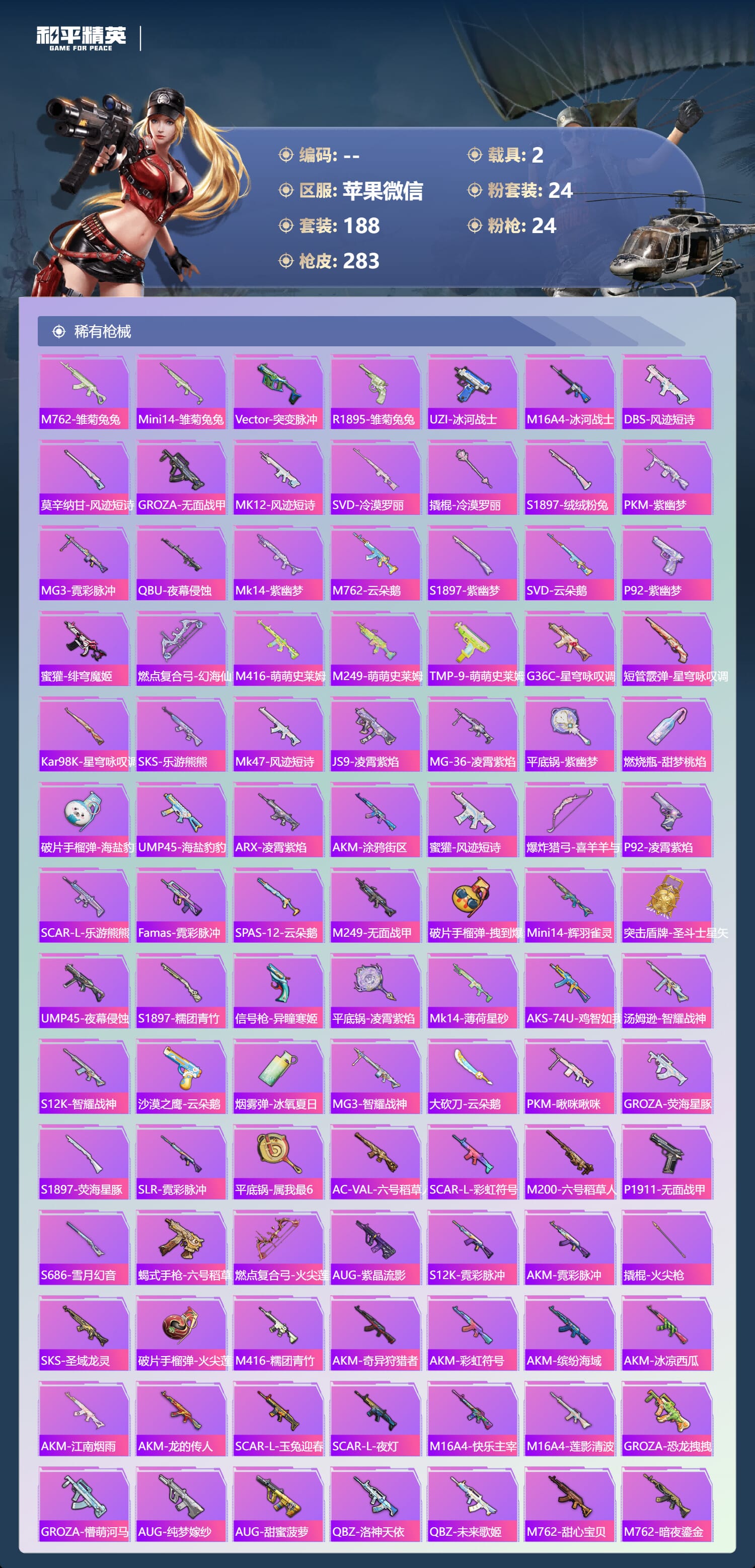 a4071/苹果微-12王牌印记-有战神框-3红装-24粉装-24特效枪-2载具-124627热