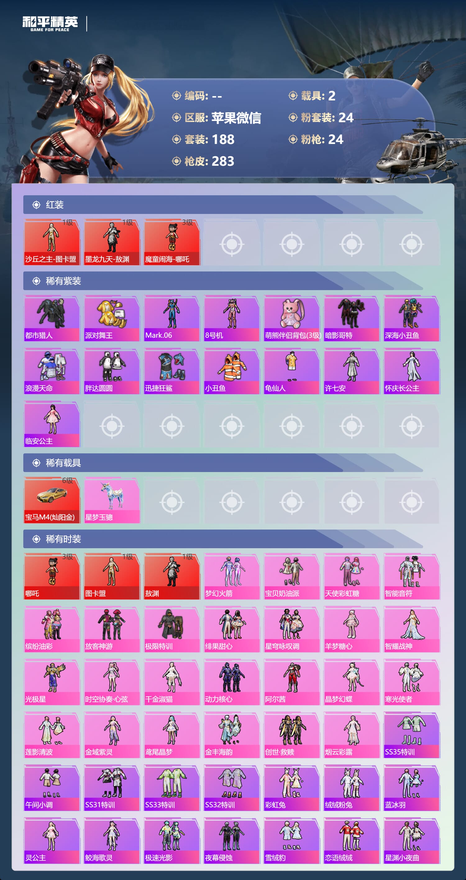 a4071/苹果微/-12王牌印记-有战神框-3红装-24粉装-24特效枪-2载具-124627热