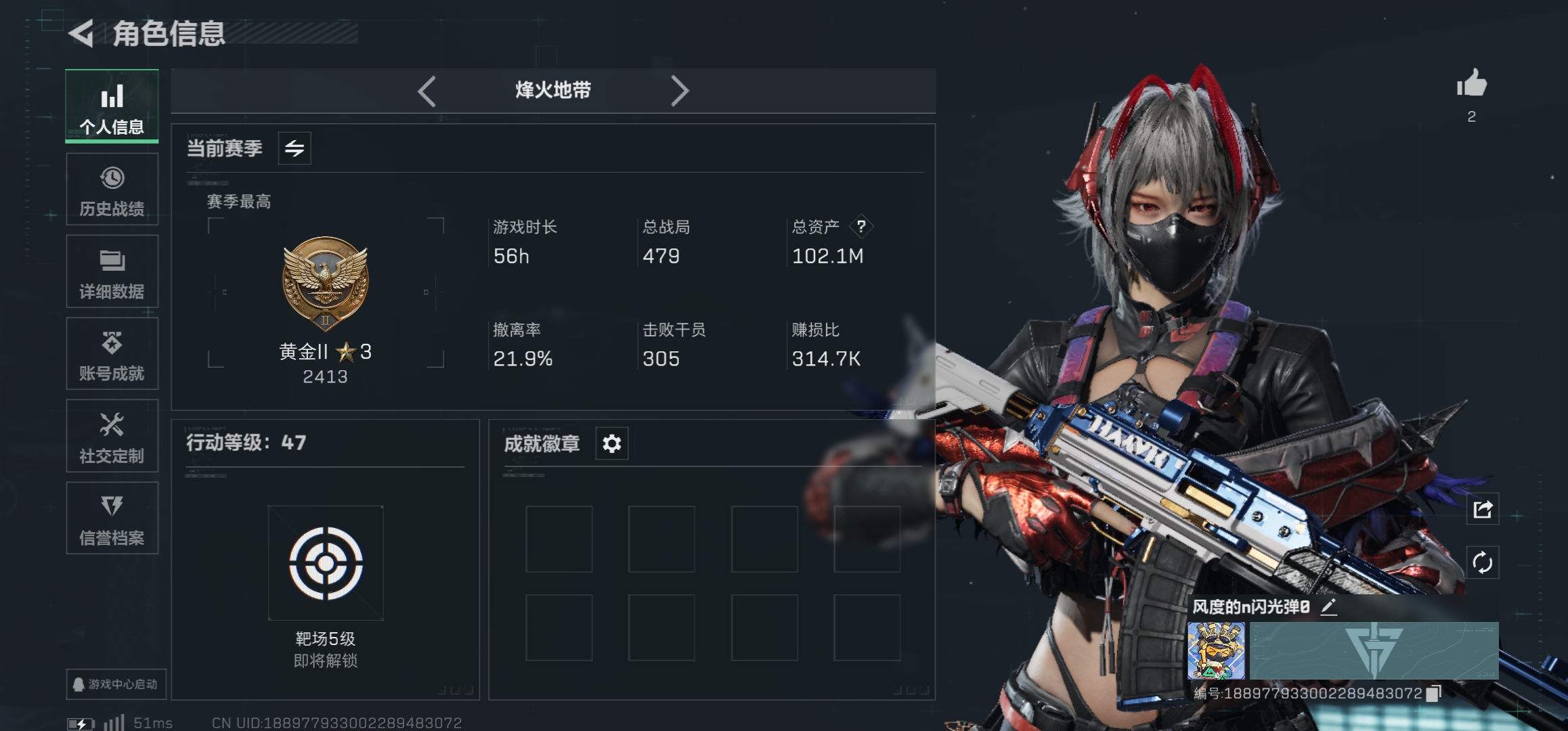 总资产:103M,哈夫币:9164W,武器皮肤33,烽火47级:黄金,战场1级:无段位,通行证180