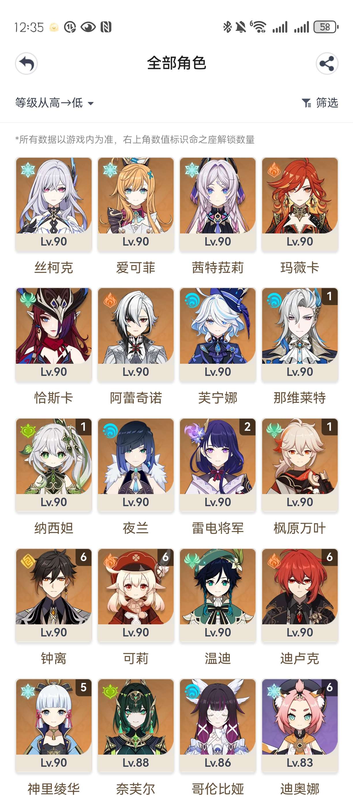 【YSF1243】60级/男主/26个五星角色/0命奈芙尔/0命菲林斯/0命菈乌玛/梦见月瑞希/1命玛薇卡/2命希诺宁/闲云/满命芙宁娜/3命流浪者/纳西妲/2命赛诺/3命提纳里/满命夜兰/满命荒泷一斗/神里绫华/2命枫原万叶/满命魈/钟离/4命可莉/满命琴/5命刻晴/1命迪卢克/满命莫娜/2命七七/裁断/静水流涌之辉/金流监督/图莱杜拉的回忆/若水/波乱月白经津/精5赤角石溃杵/薙草之稻光/苍古自由之誓/护摩之杖/尘世之锁/天空之傲/和璞鸢/天空之卷/四风原典/精2狼的末路/阿莫斯之弓/风鹰剑
