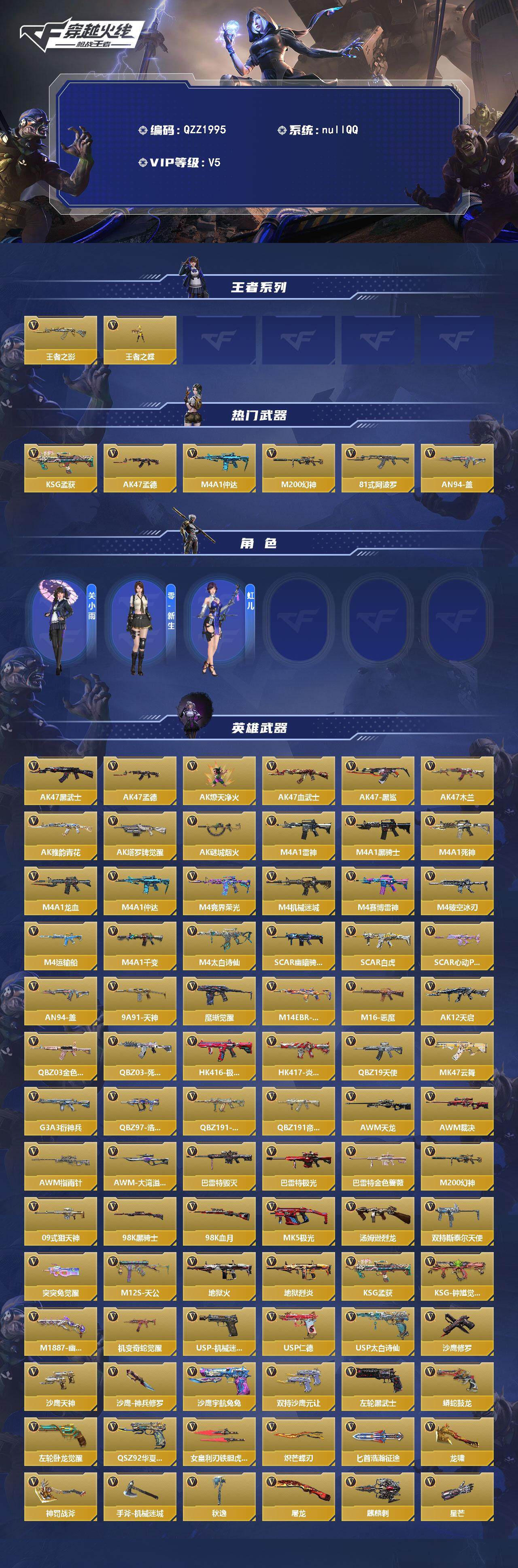 【QZZ1995】VIP5/189V/2王者/王者之影/王者之蝶/KSG-孟获/AK47-孟德/M4A1-仲达/M200-幻神/81式-阿波罗/AN94-盖/关小雨/零-新生/虹儿/AK47-黑武士/AK47孟德/AK47-燎天净火/AK47-血武士/AK47-黑鲨/AK47-木兰/AK47-雅韵青花/AK47-塔罗牌觉醒/AK47-谜城烟火/M4A1-雷神/M4A1-黑骑士/M4A1-死神/M4A1-龙血/M4A1仲达/M4A1竞界荣光/M4A1-机械迷城/M4A1-赛博雷神/M4A1-破空冰