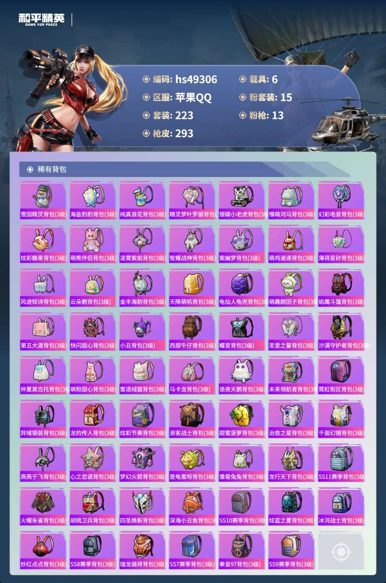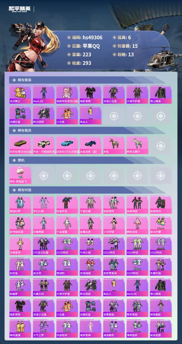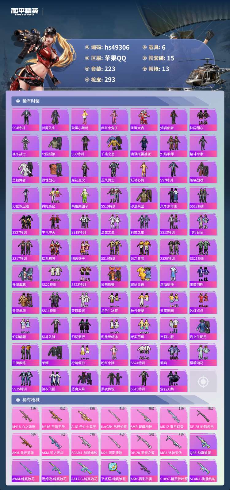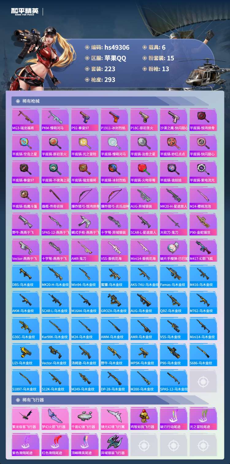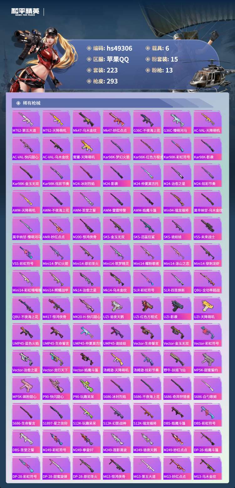 hs49306 苹果手Q-18王牌印记-有战神框-15粉装-13特效枪-6载具-111804热力值-