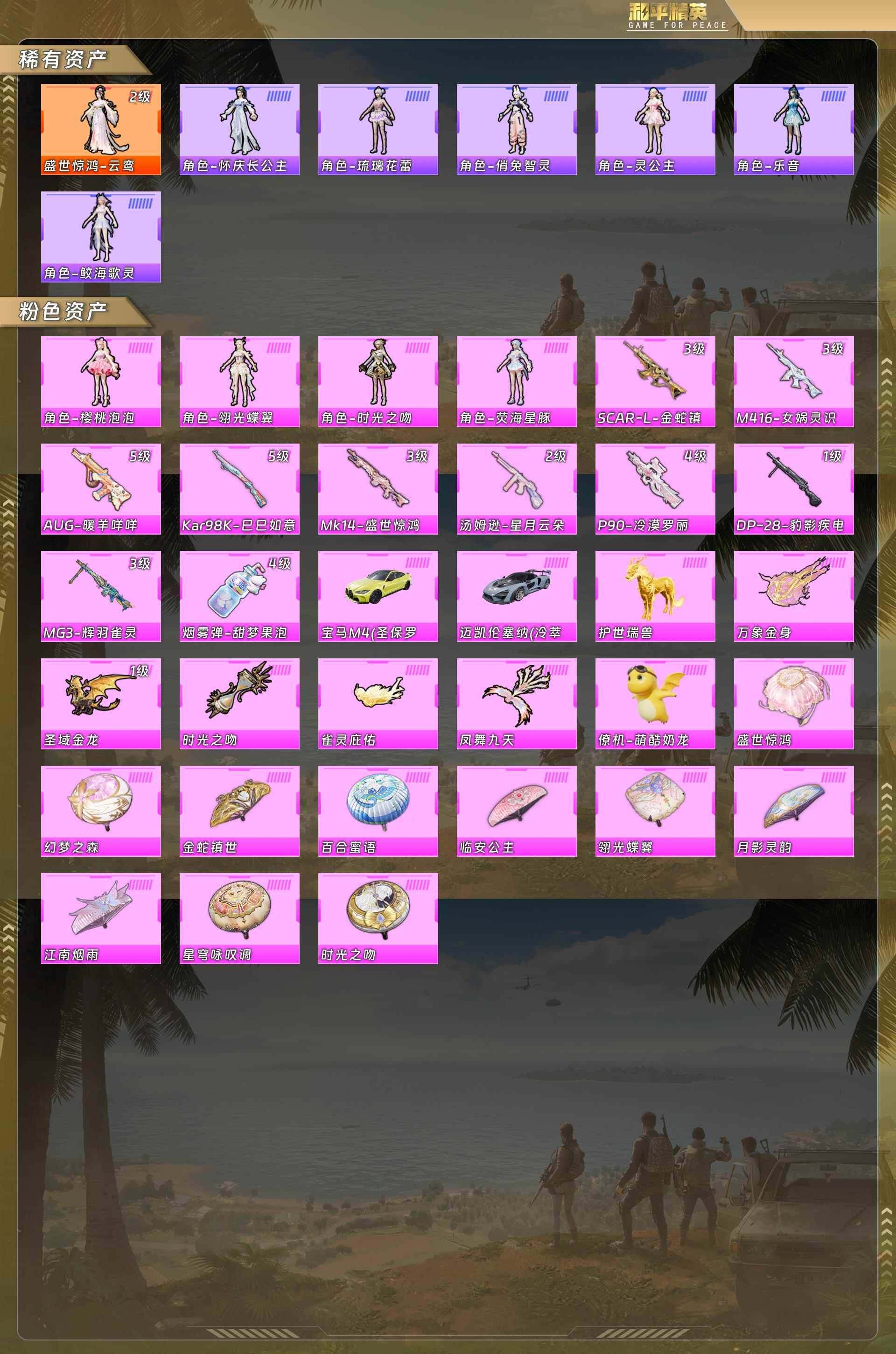 公主号-2级神装云鸾/怀庆长公主/琉璃花蕾/俏兔智灵/鲛海歌灵/樱桃泡泡/翎光蝶翼/时光之吻/荧海星豚【粉色枪皮】SCARL金蛇镇世3级/M416女娲灵识3级/Mk14盛世惊鸿3级/汤姆逊星月云朵2级/MG3辉羽雀灵3级/烟雾弹甜梦果泡4级【载具】宝马M4/迈凯伦塞纳/护世瑞兽/萌酷奶龙 没战神框(1神装3载具1僚机4粉套10粉枪)HP2609