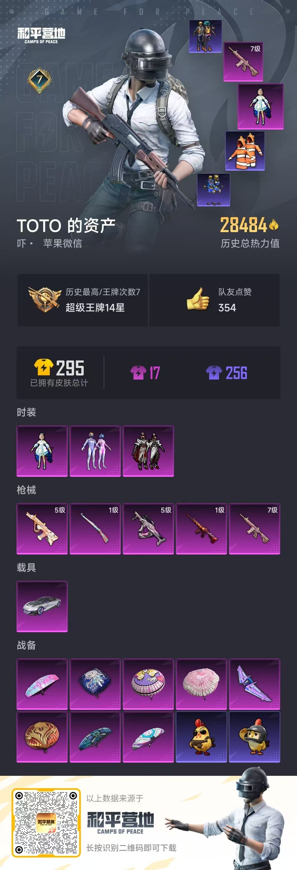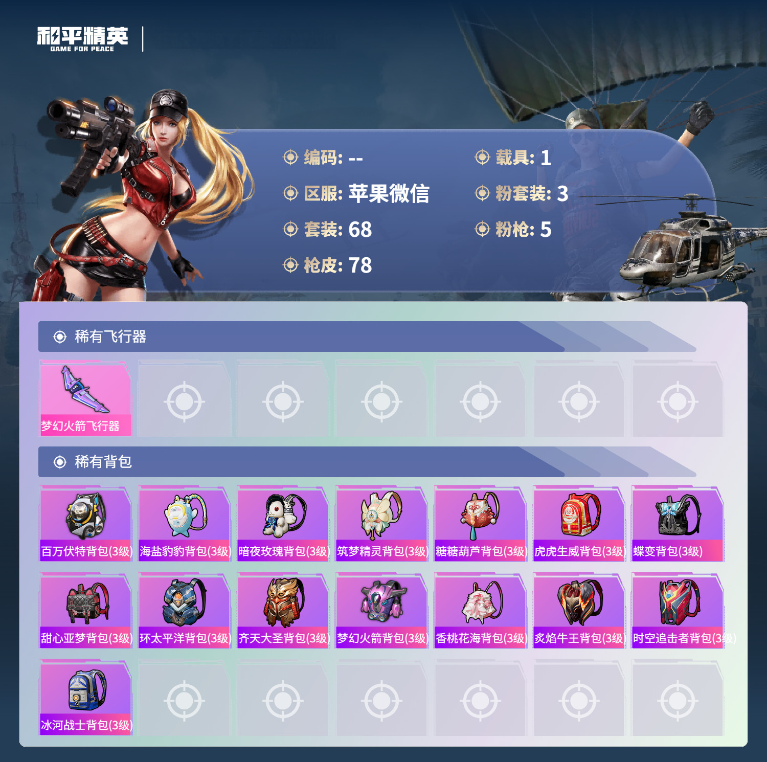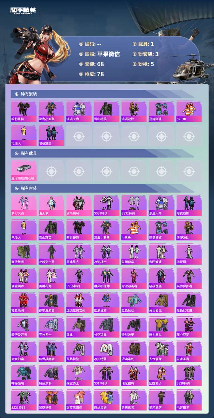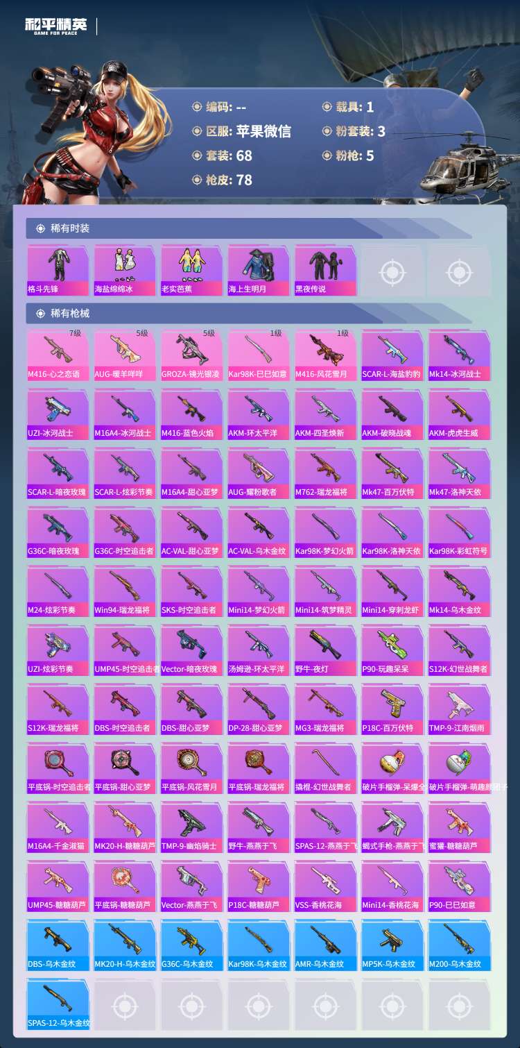 hs49677 苹果v-7王牌印记-3粉装-5特效枪-1载具-28484热力值-68套装-78枪皮