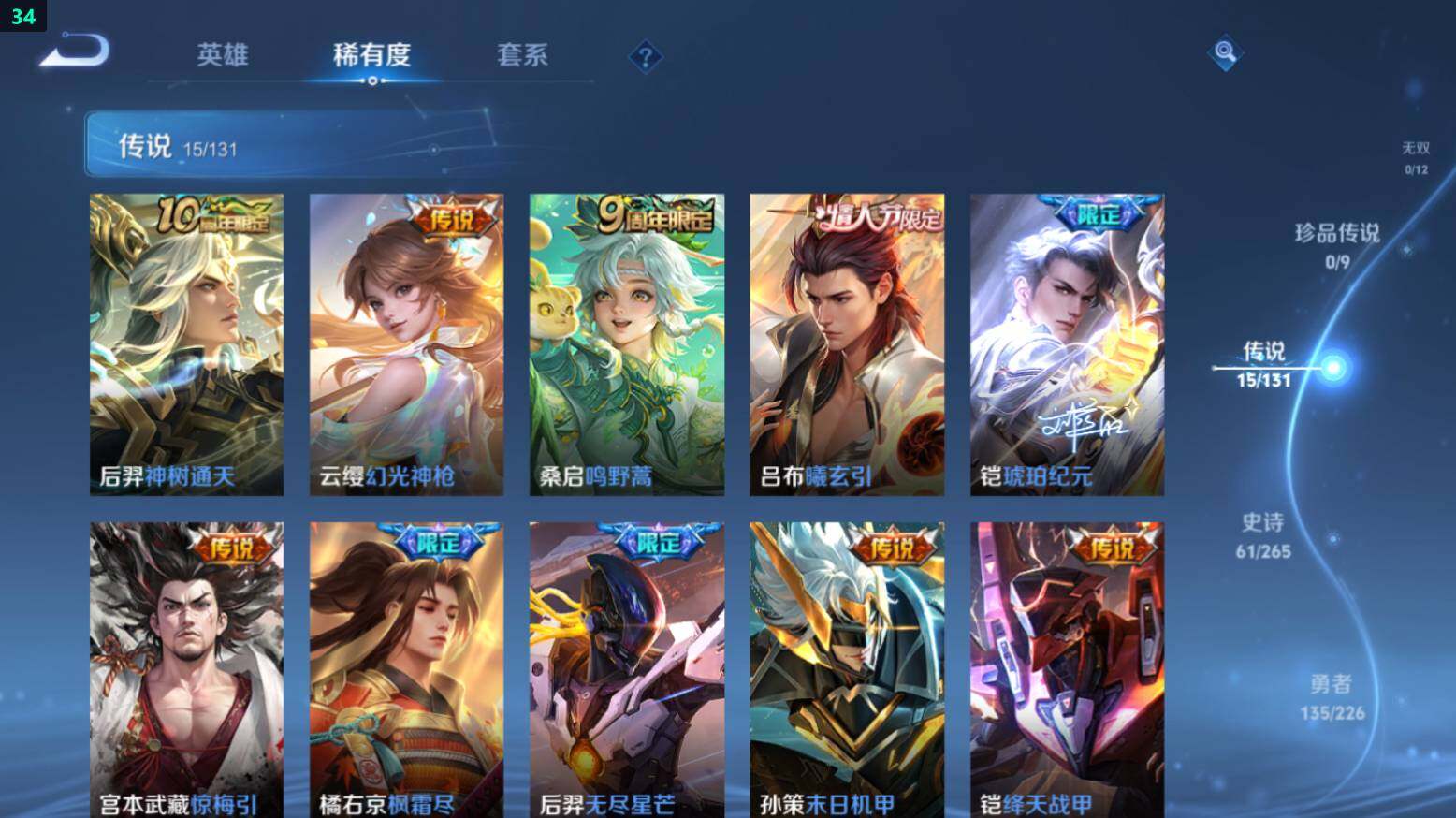 【传说】:后羿神树通天,云缨幻光神枪,桑启鸣野蒿,吕布曦玄引,铠琥珀纪元,宫本武藏惊梅引,橘右京枫霜尽,后羿无尽星芒,孙策末日机甲,铠绛天战甲,曜云鹰飞将,李信一念神魔,刘备时之恋人,干将莫邪久胜战神,孙悟空地狱火