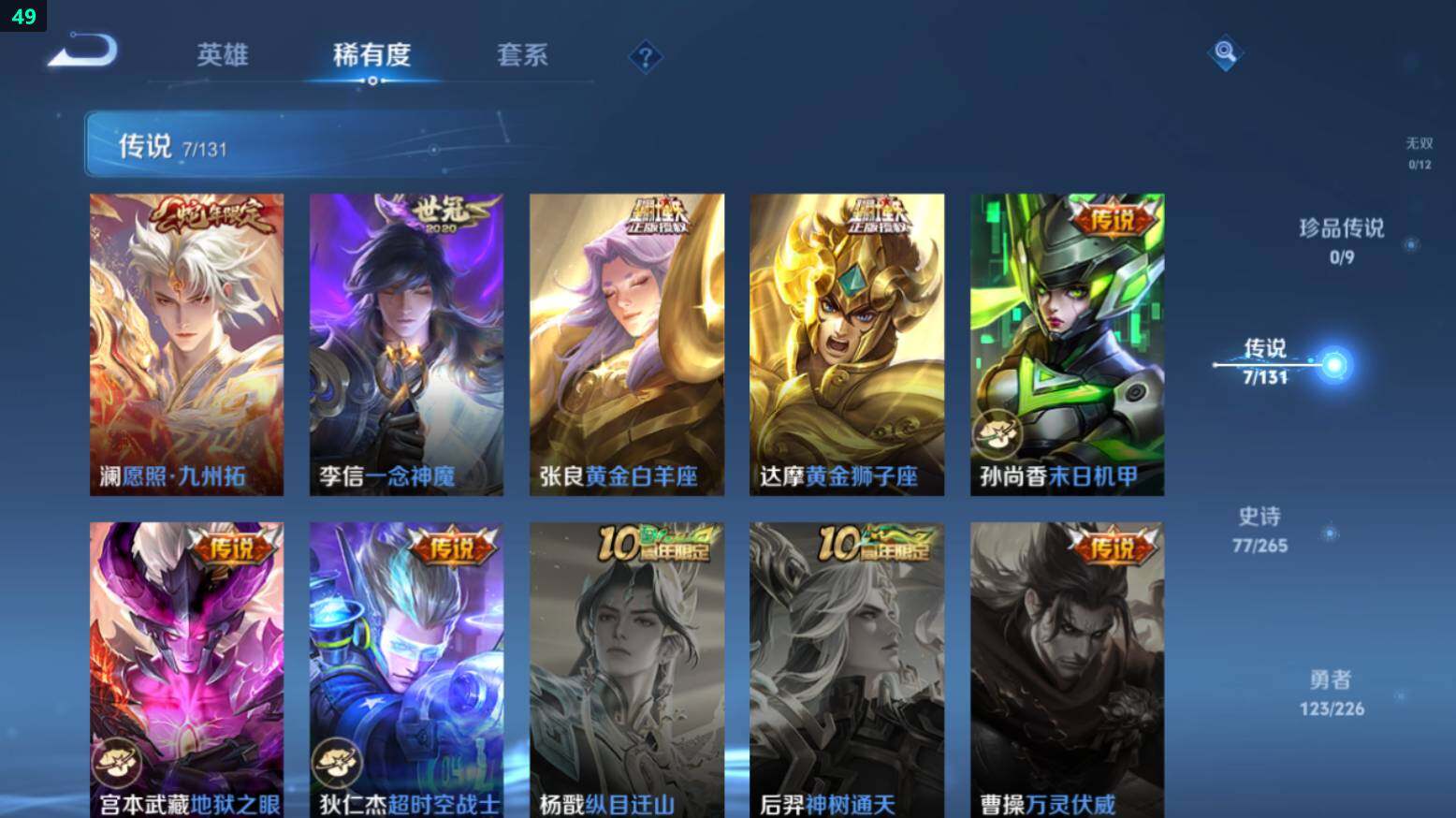【传说】:澜愿照九州拓,李信一念神魔,张良黄金白羊座,达摩黄金狮子座,孙尚香末日机甲,宫本武藏地狱之眼,狄仁杰超时空战士