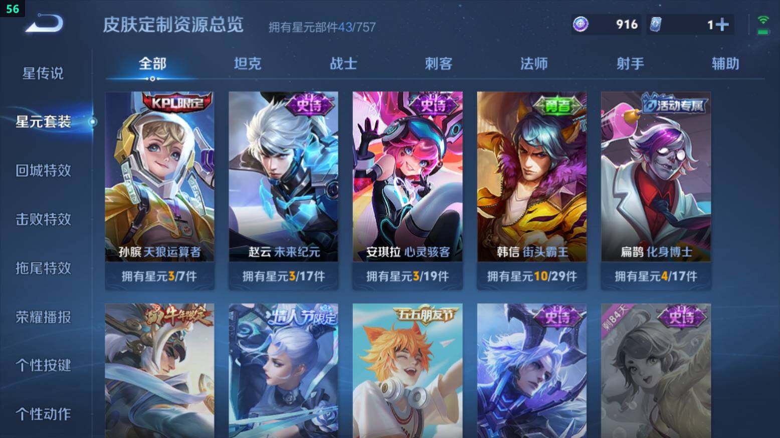【限定】:廉颇寅虎御盾,赵云皇家上将,孙膑天狼运算者,芈月白晶晶,吕布御风骁将,狄仁杰魔术师,狄仁杰万华元夜,项羽海滩派对,老夫子醍醐杖,关羽冰锋战神,程咬金演武夺筹,韩信傲雪梅枪,兰陵王默契交锋,花木兰默契交锋,亚瑟
