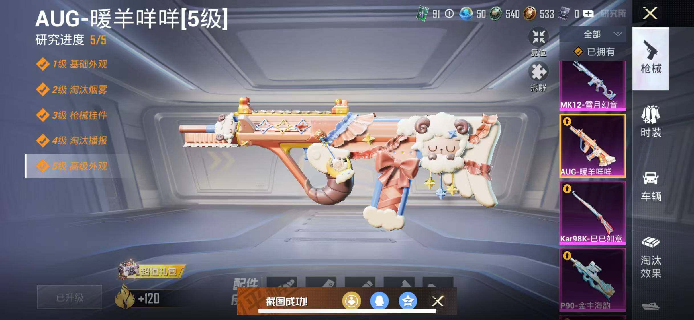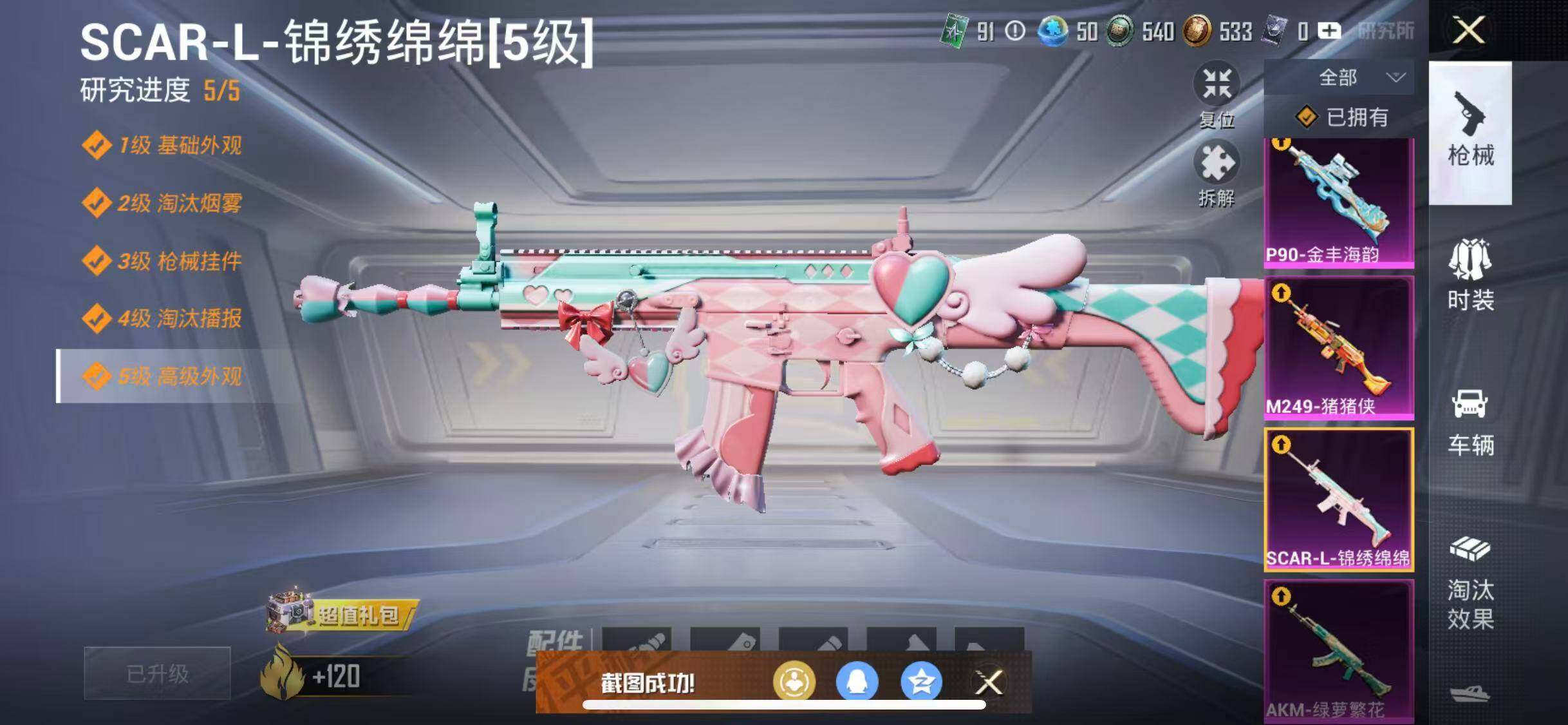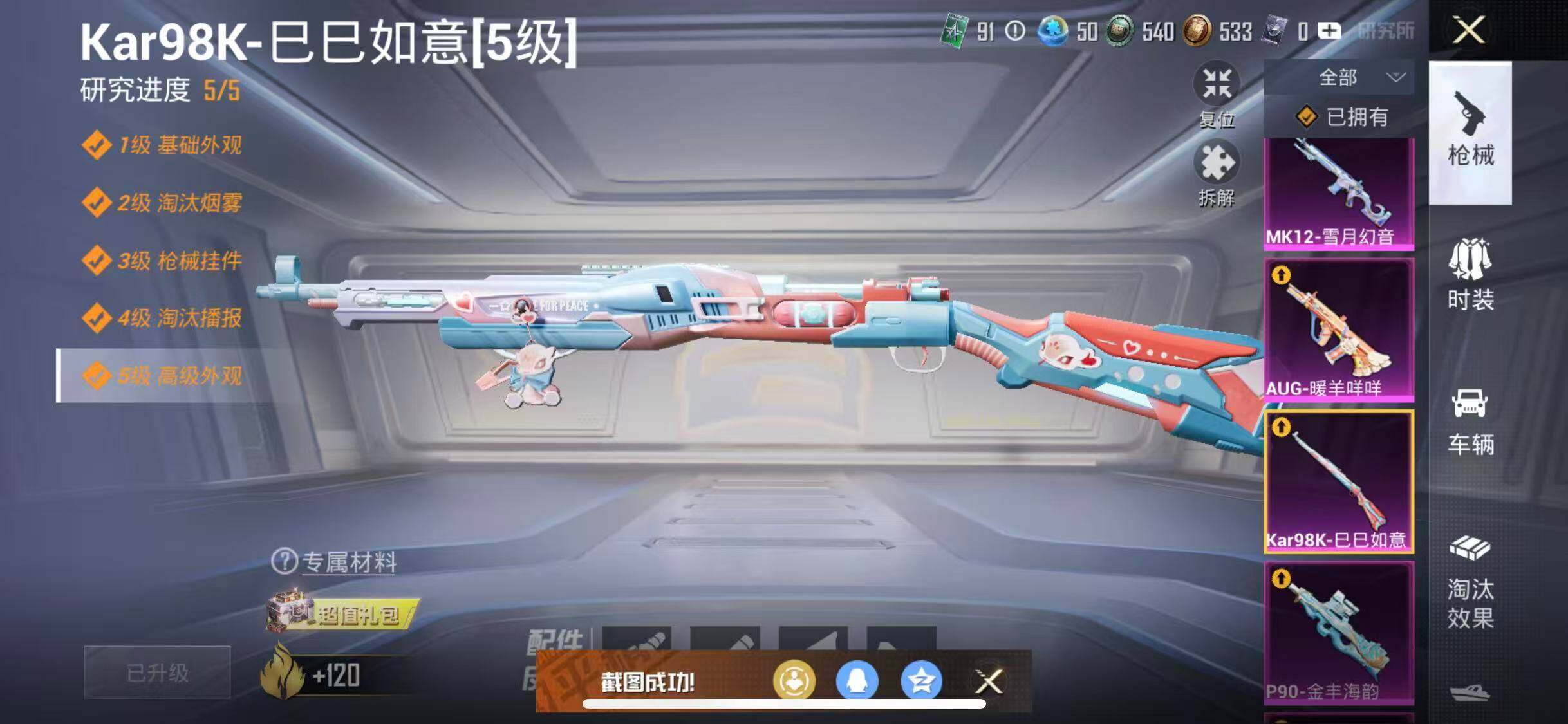【粉色枪皮等级】:AKM-绿萝繁花(五级),SCAR-L-锦绣绵绵(五级),AUG-暖羊咩咩(五级),P90-金丰海韵(七级),Kar98K-巳巳如意(五级),MK12-雪月幻音(六级),M249-猪猪侠