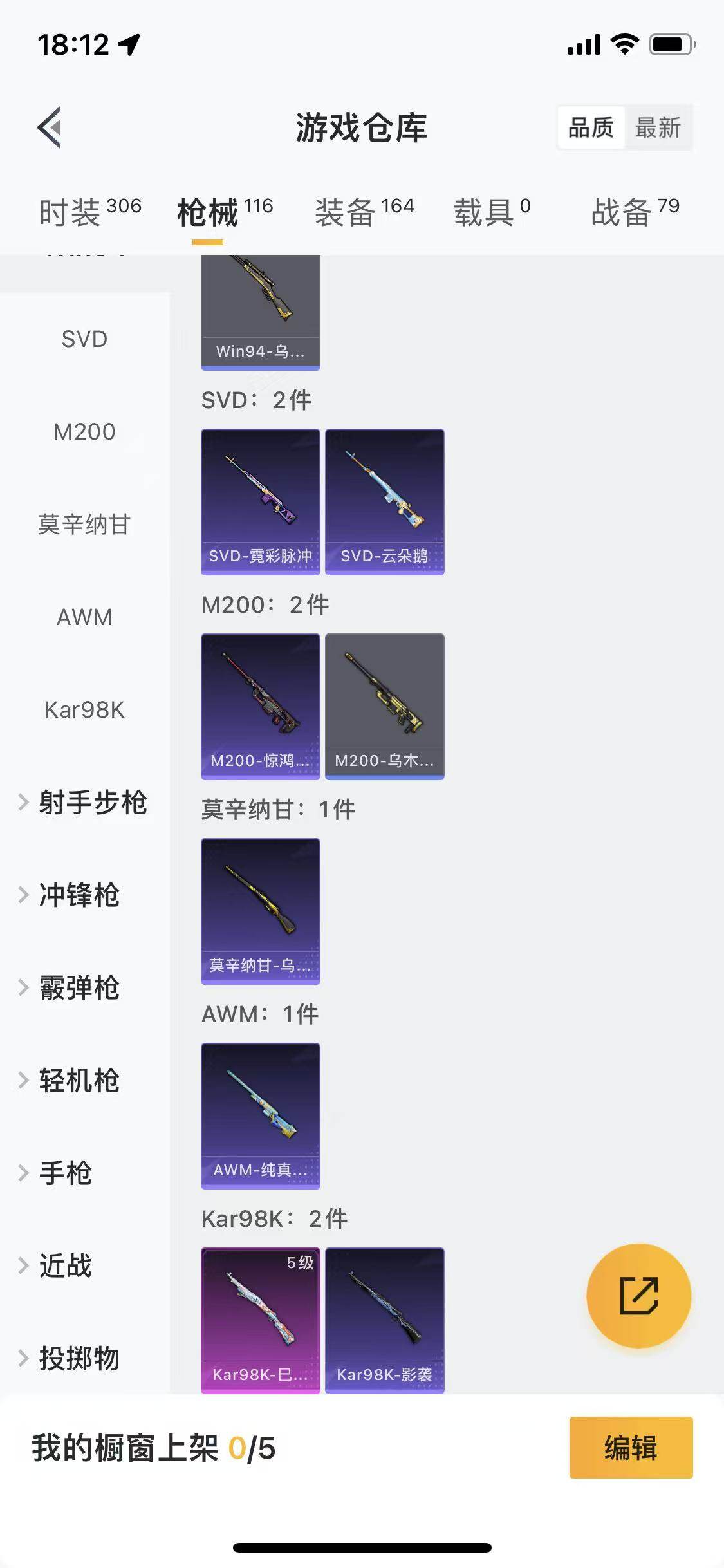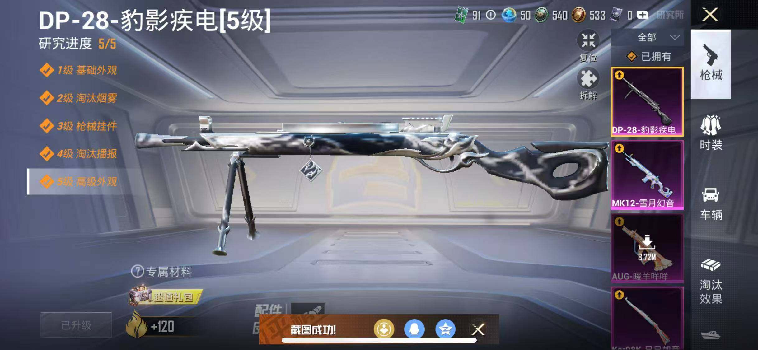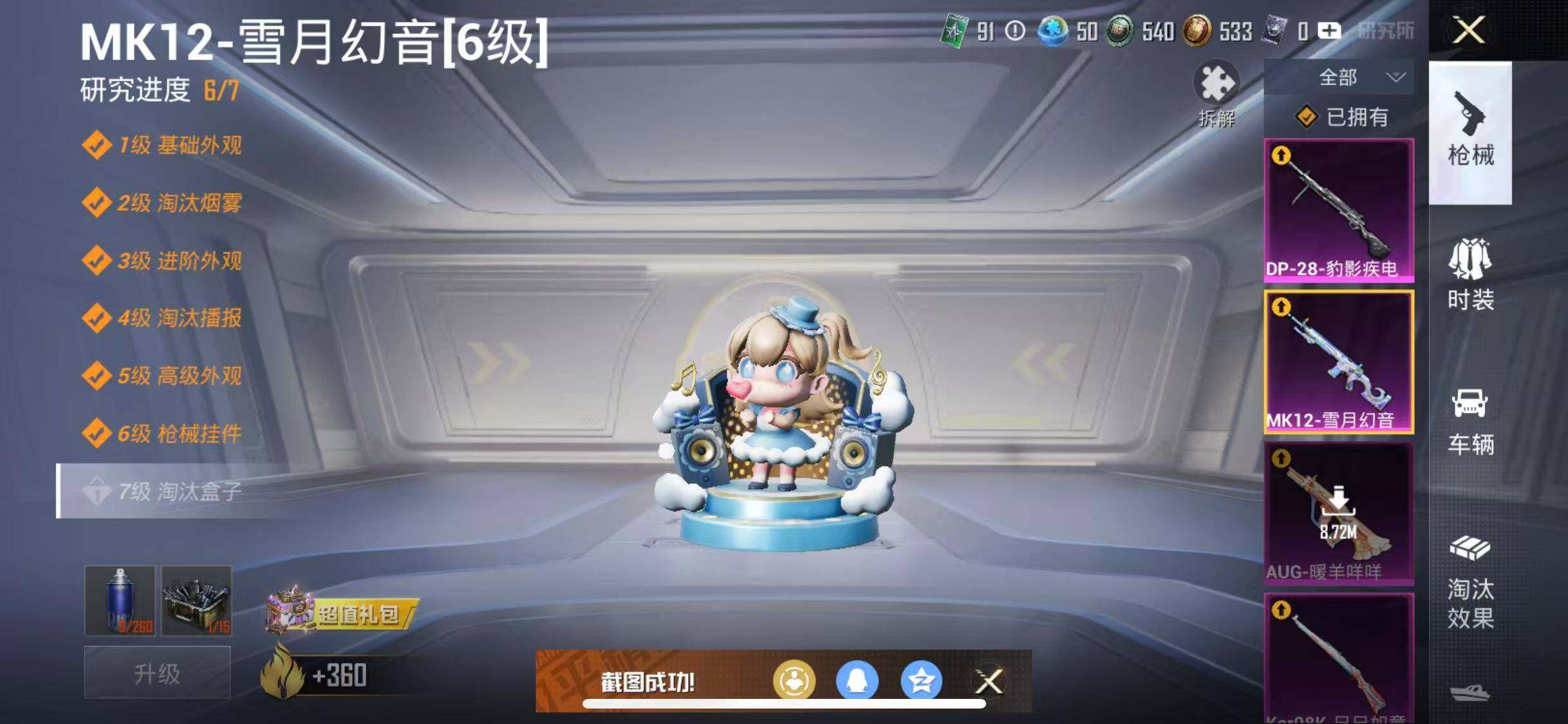 【粉色枪皮等级】:AKM-绿萝繁花(五级),SCAR-L-锦绣绵绵(五级),AUG-暖羊咩咩(五级),P90-金丰海韵(七级),Kar98K-巳巳如意(五级),MK12-雪月幻音(六级),M249-猪猪侠