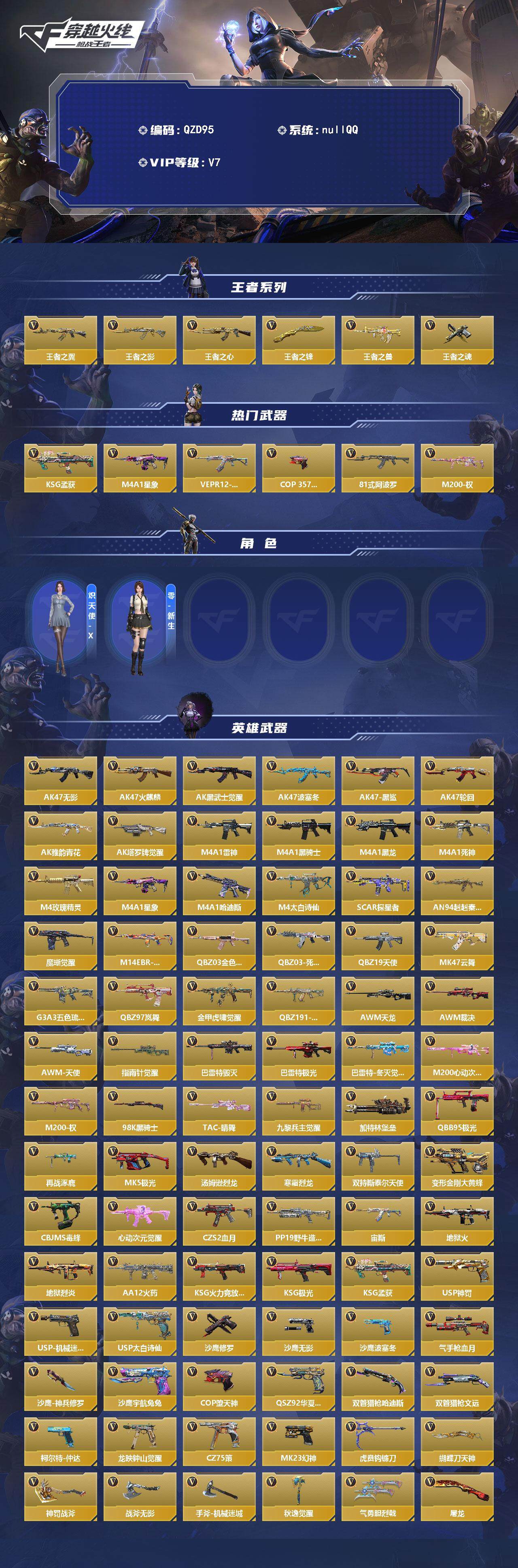【QZD95】VIP7/176V/王者之翼/王者之影/王者之心/王者之锋/王者之兽/王者之魂/KSG-孟获/M4A1-星象/VEPR12-宙斯/COP 357-堕天神/81式-阿波罗/M200-权/炽天使-X/零-新生/AK47-无影/AK47-火麒麟/AK47-黑武士觉醒/AK47-波塞冬/AK47-黑鲨/AK47-轮回/AK47-雅韵青花/AK47-塔罗牌觉醒/M4A1-雷神/M4A1-黑骑士/M4A1-黑龙/M4A1-死神/M4A1-玫瑰精灵/M4A1星象/M4A1-哈迪斯/M4A1-太白