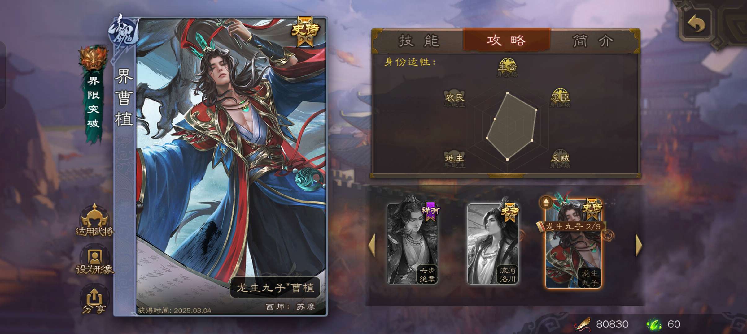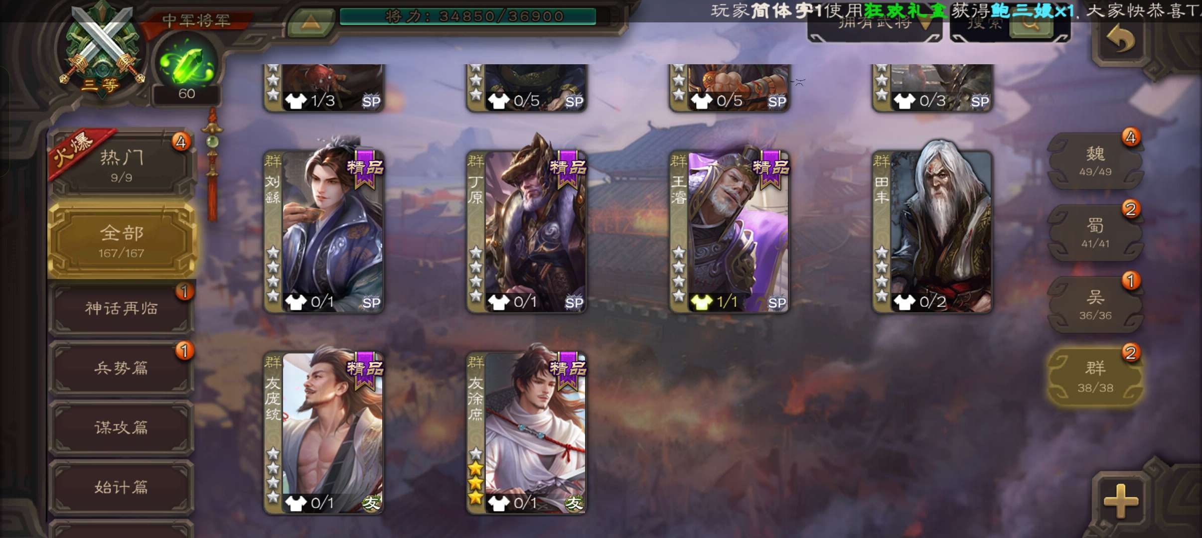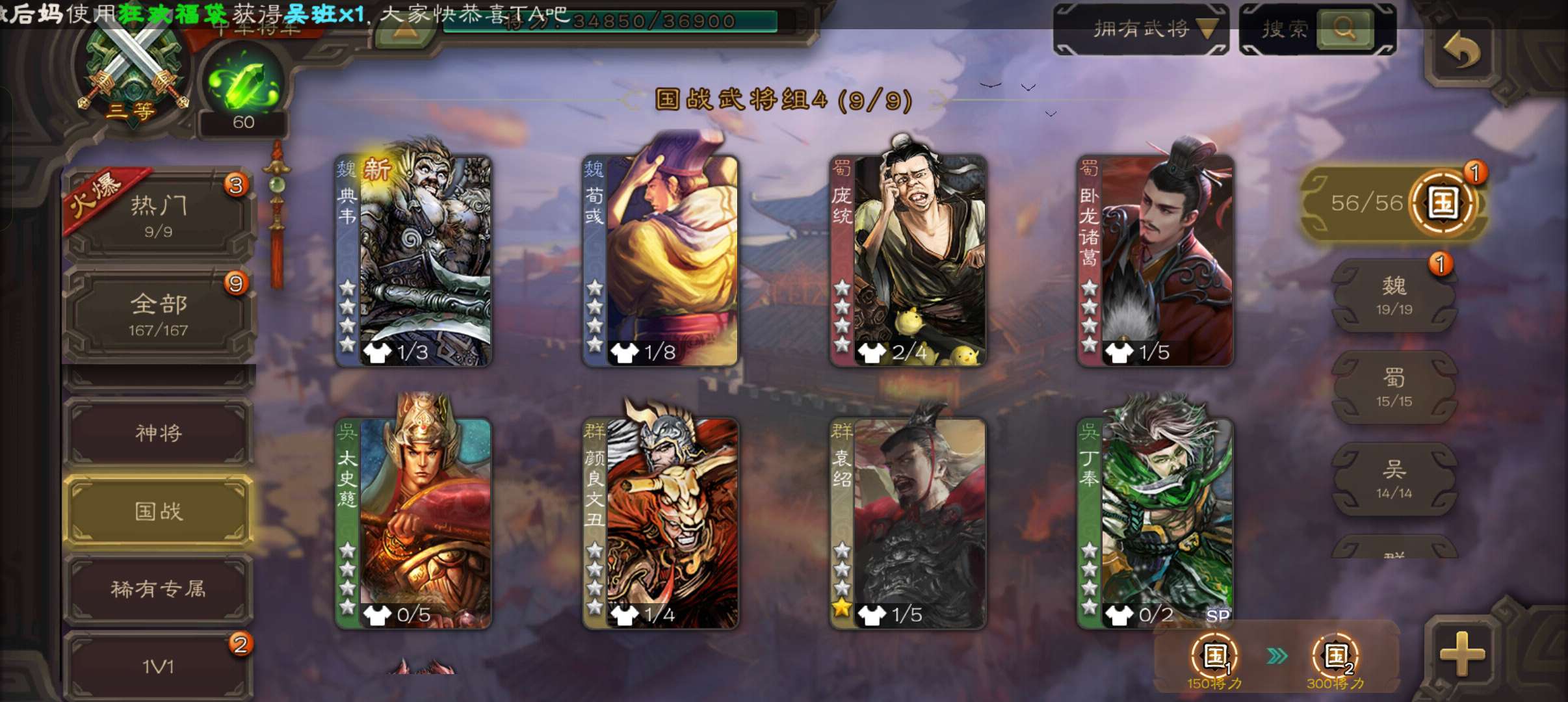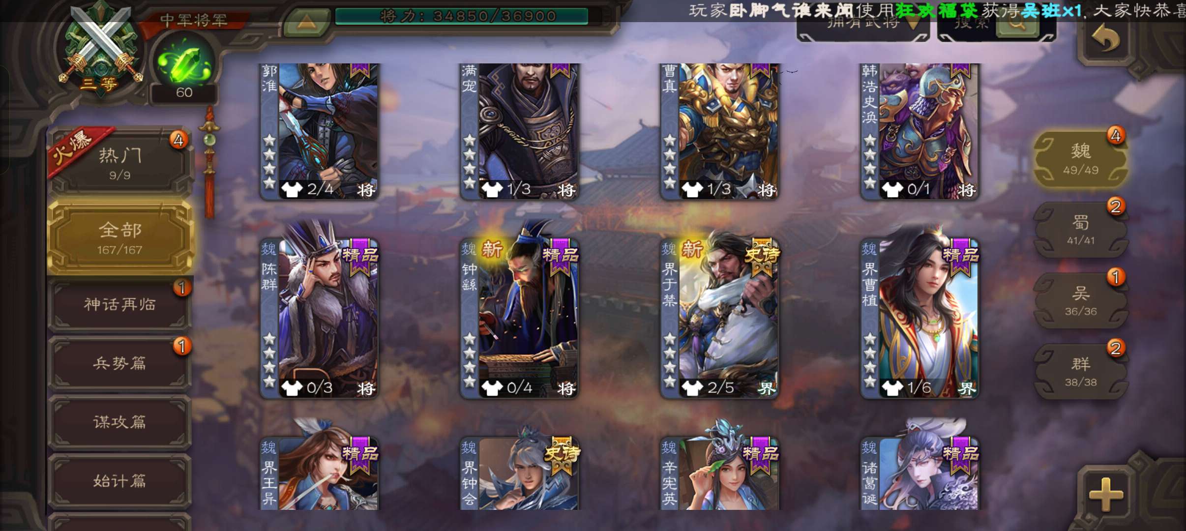 7史诗中军,8万羽毛6.5万豆,天工友徐庶,戏志才界钟会神吕布白马神刘备界于禁程昱,神吕蒙谋韩当