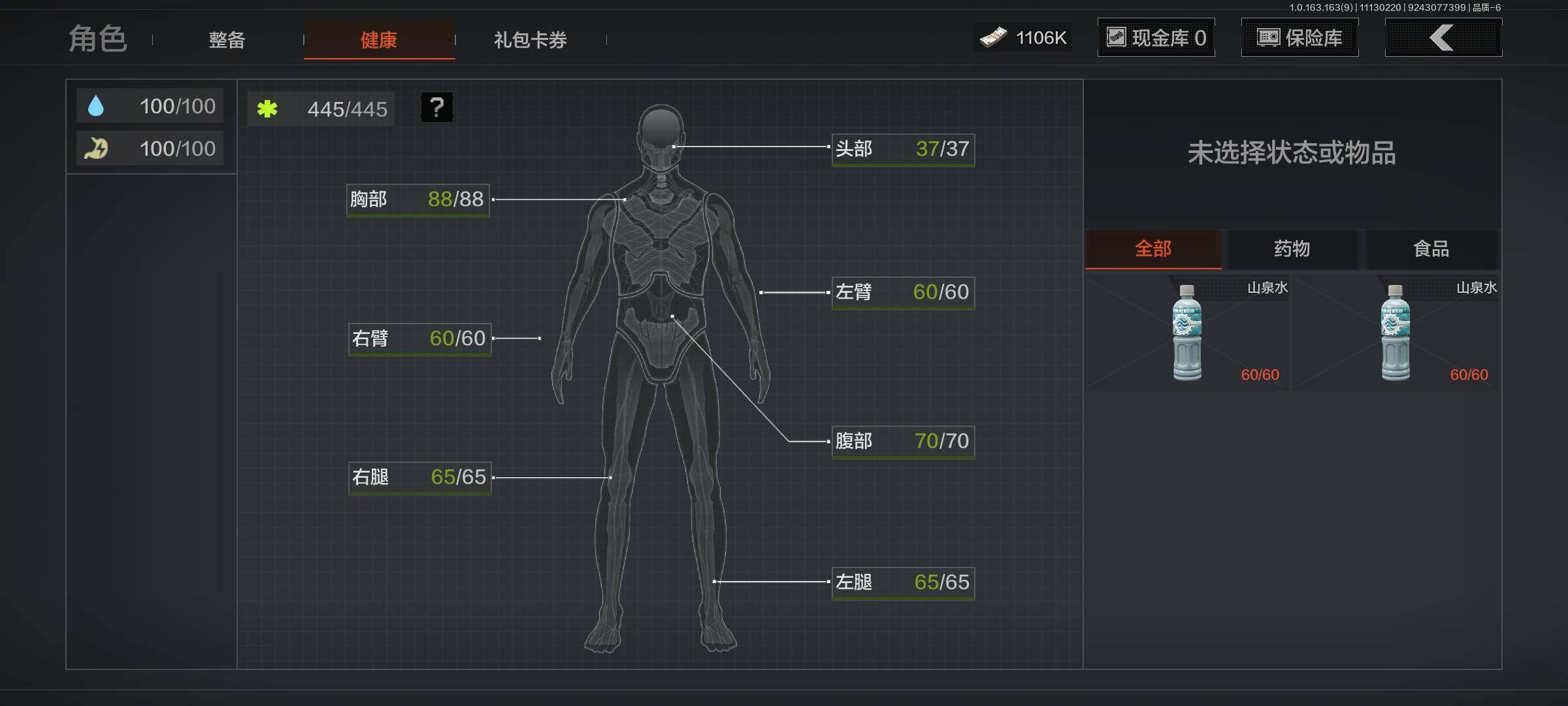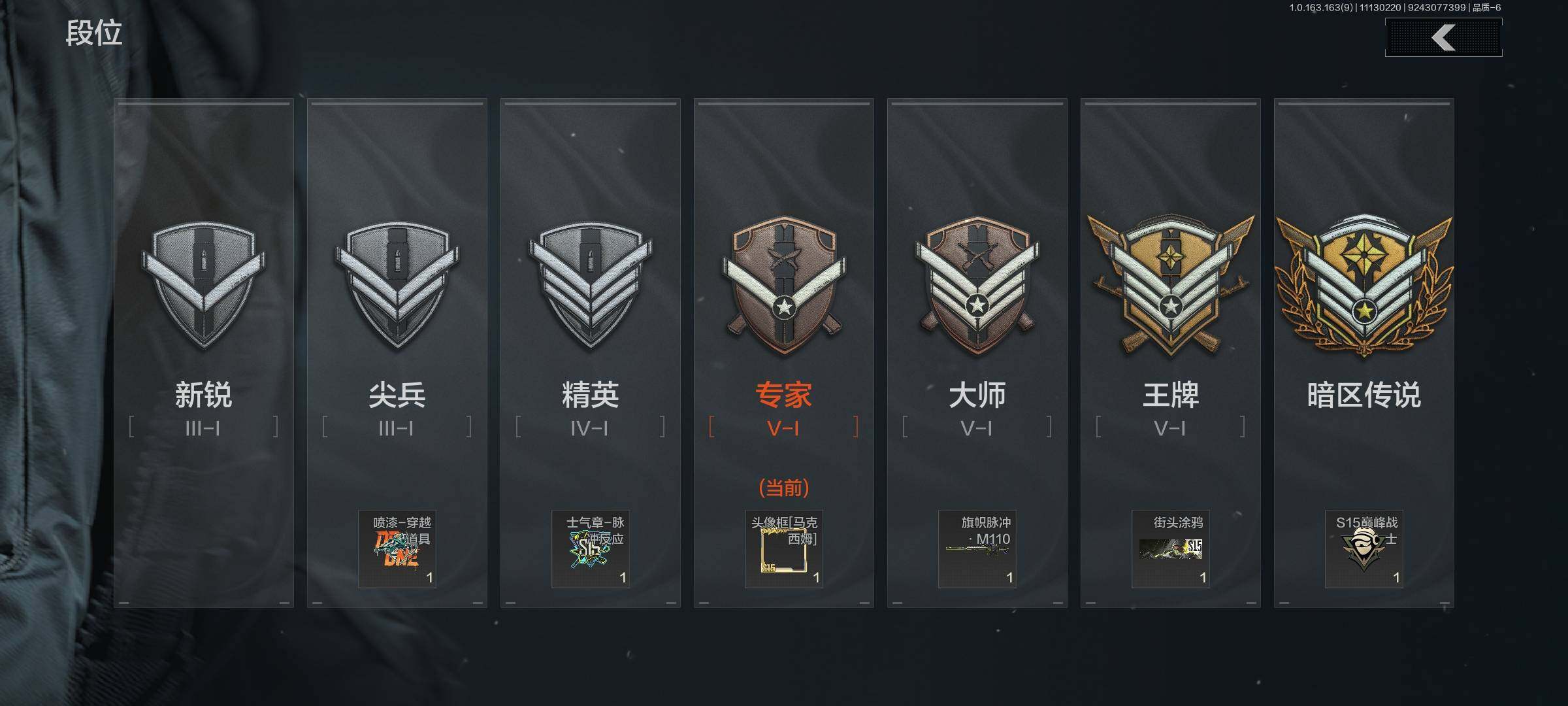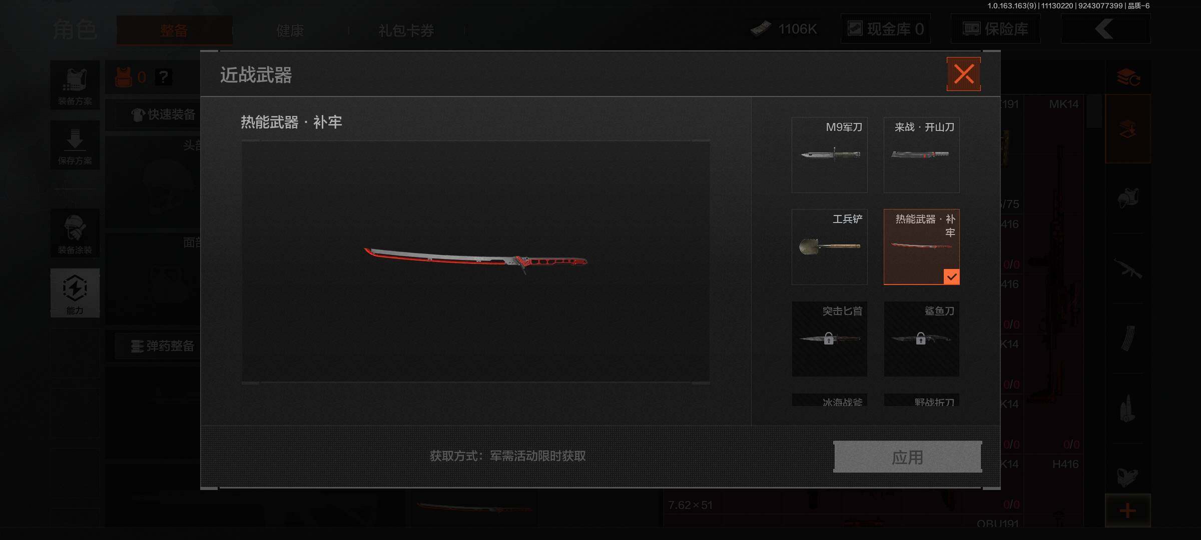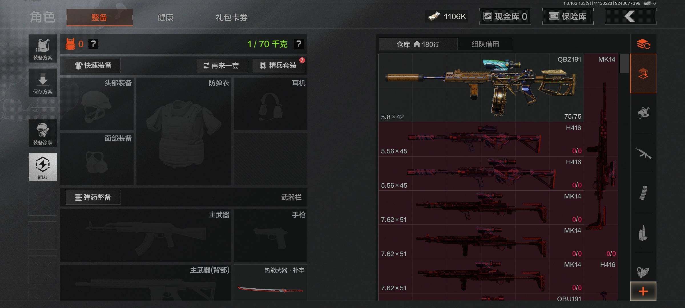 段位:专家/仓库价值(百万):104.2/柯恩币:1106/热能武器·补牢