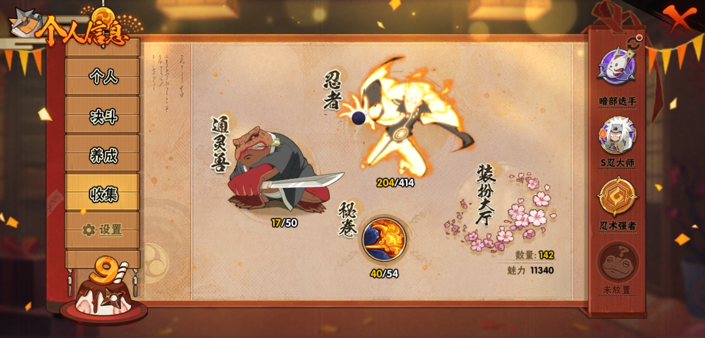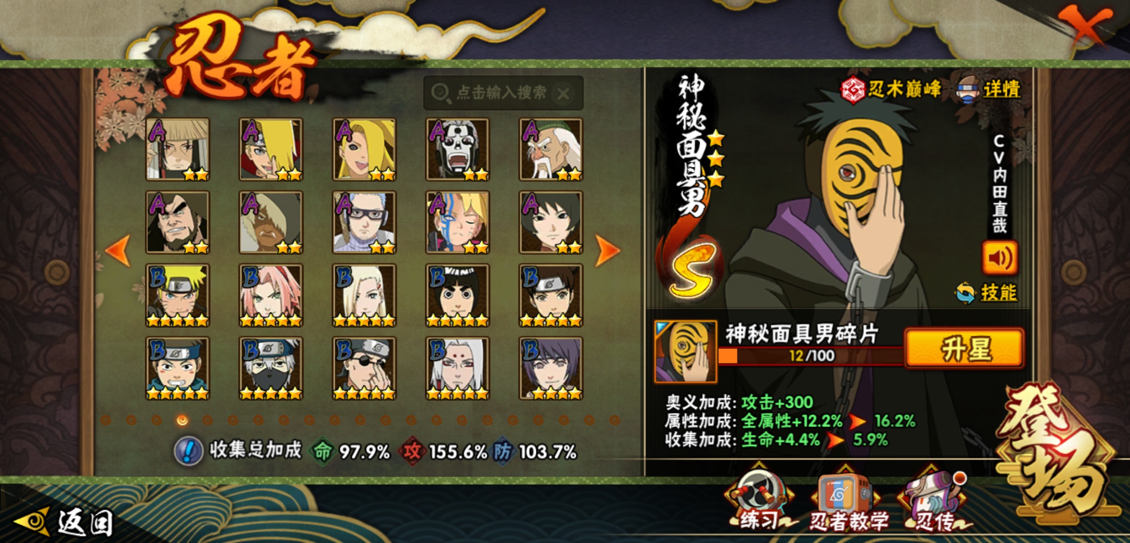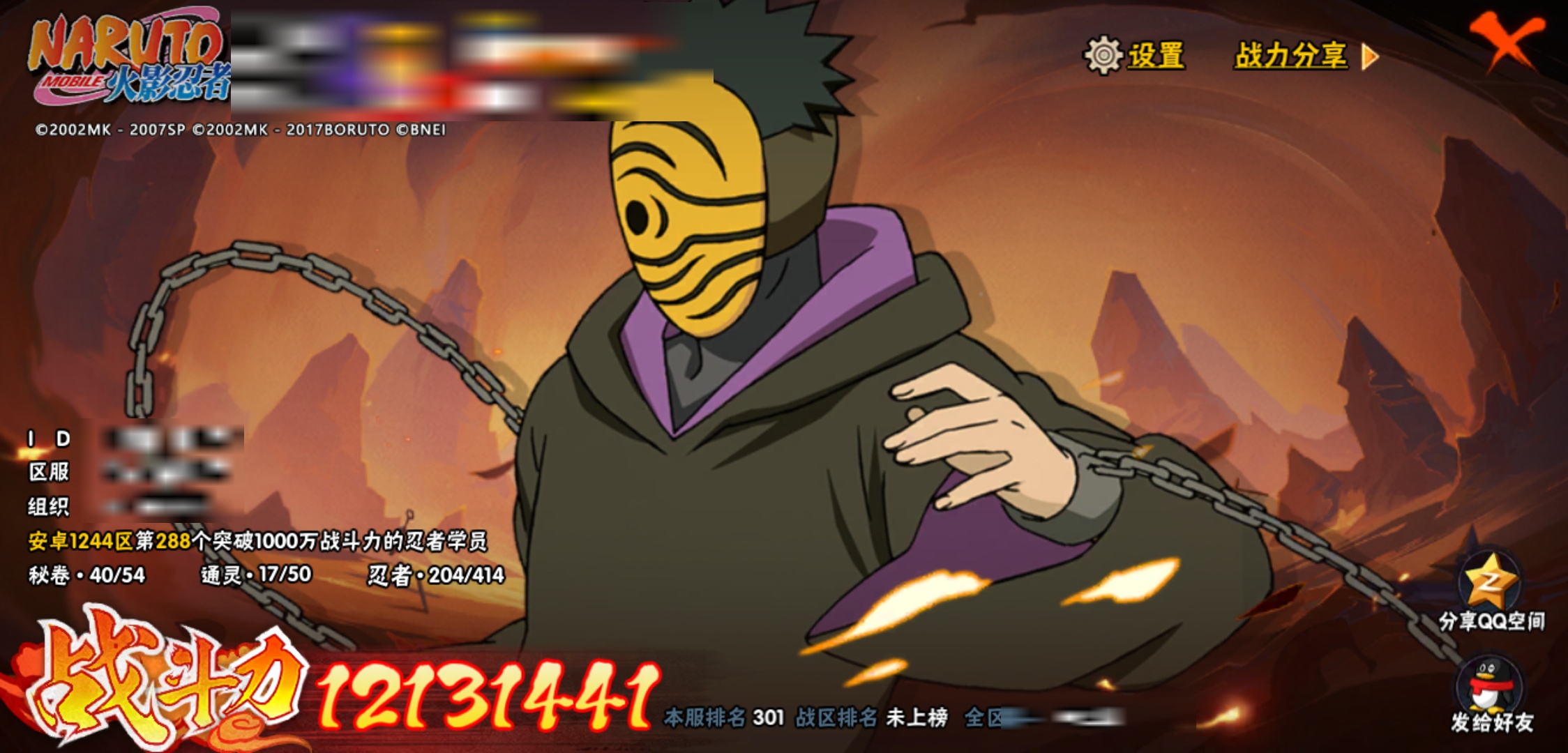 战斗力:1213W+;段位:上忍1阶;本服排名:301
