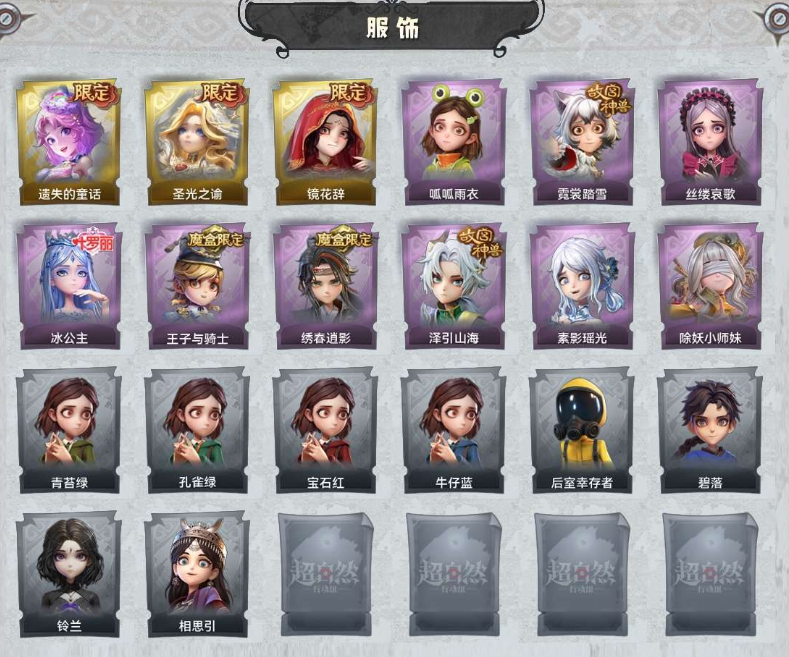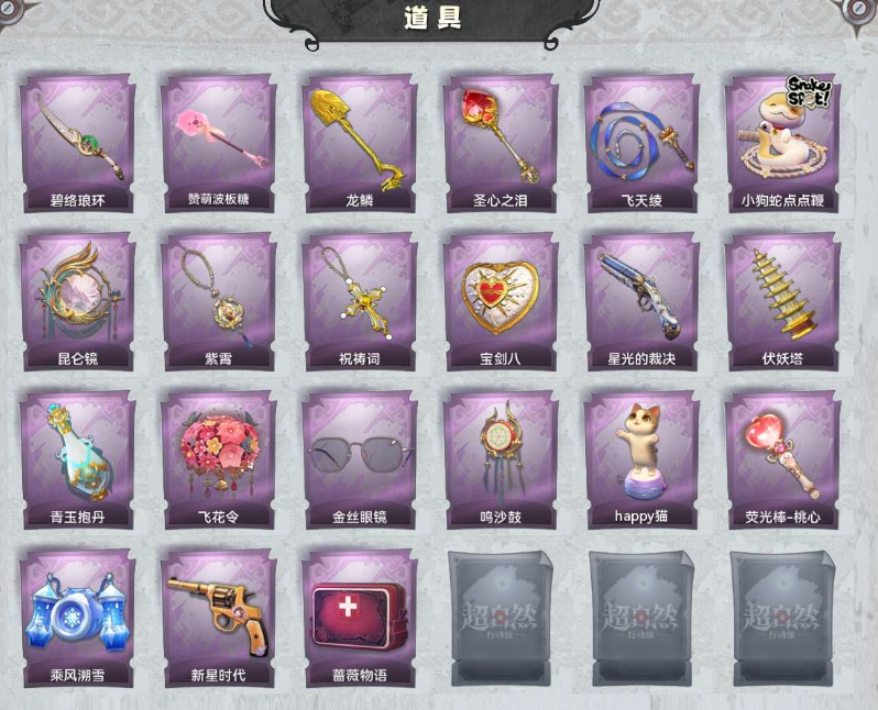 【紫色皮肤】莉莉-除妖小师妹 阿念-王子与骑士 爱丽丝-冰公主 逍遥-泽引山海 小黄-霓裳踏雪 巫铃儿-素影瑶光 爱丽丝-丝缕哀歌 逍遥-绣春逍影 小黄-呱呱雨衣
