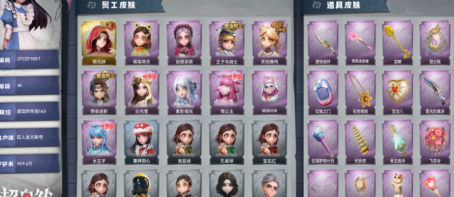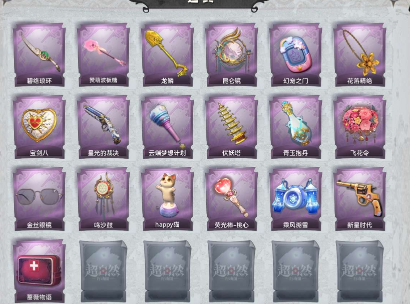 1金10紫镜花辞/绒绒对决/王子与骑士/情公主/水王子/白光莹/灵昭鹿鸣/素影瑶光/绣春逍影【道具皮肤】刺刀-碧络琅环、摸金符-花落精绝、铲子-龙鳞、夜视仪-金丝眼镜、传送按钮-幻宠之门、传送按钮-昆仑镜、黄牛能量饮料-青玉抱丹、腰包-宝剑八、急救包-蔷薇物语、铲子-赞萌波板糖、额外的背包-飞花令、音响-happy猫、音响-鸣沙鼓、转轮手枪-新星时代、专业手电-云端梦想计划、喷气背包-乘风溯雪、葫
