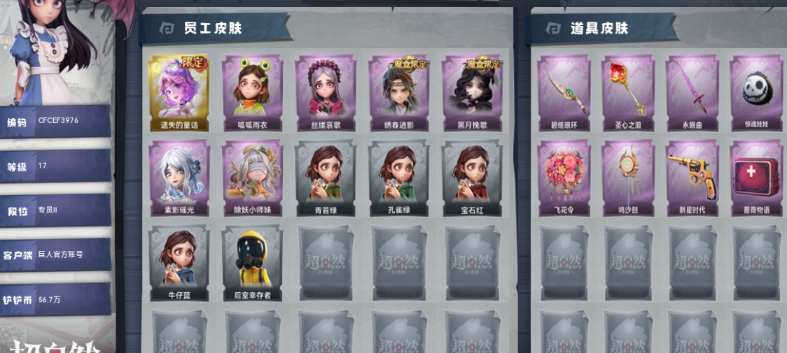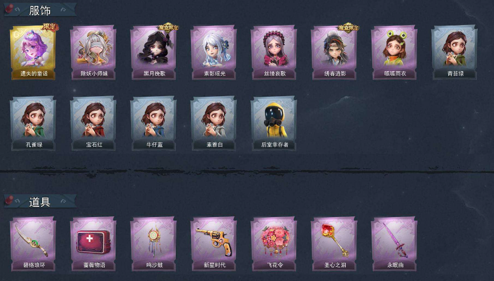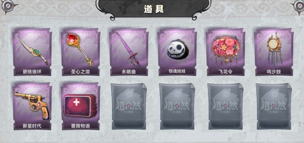 1金6紫遗失的童话/除妖小师妹/黑月挽歌/素影瑶光/绣春逍影【道具皮肤】刺刀-碧络琅环、急救包-蔷薇物语、音响-鸣沙鼓、转轮手枪-新星时代、额外的背包-飞花令、铲子-圣心之泪、桃木剑-永眠曲
