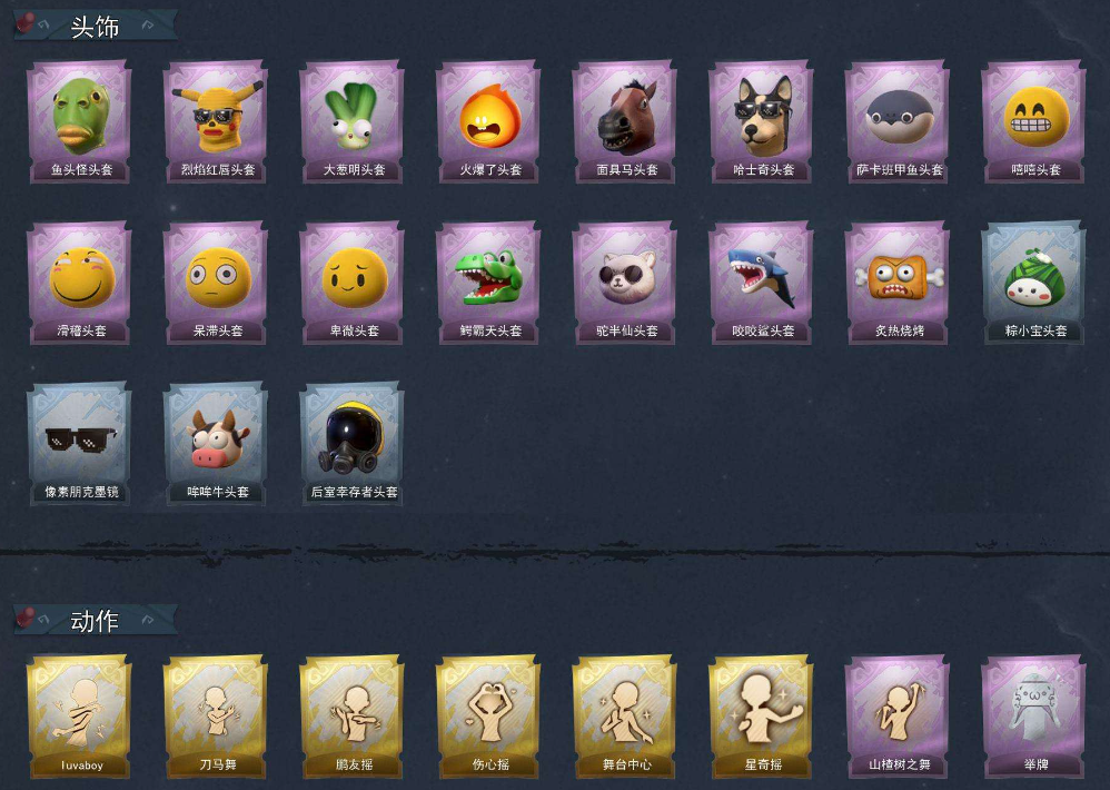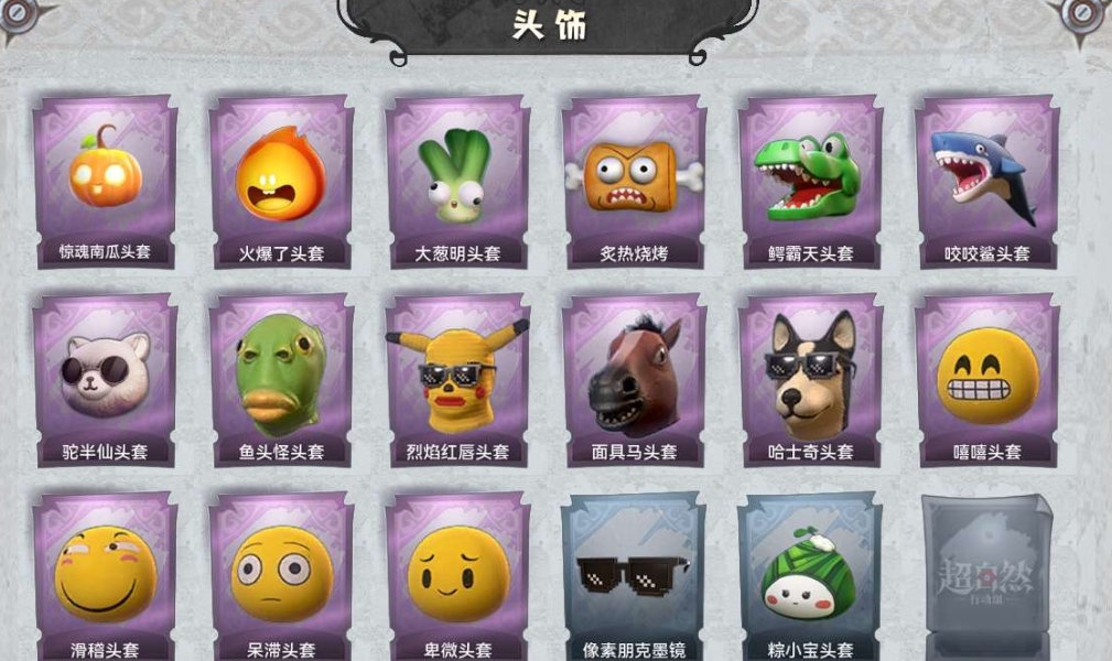 【头饰】鱼头怪头套、烈焰红唇头套、大葱明头套、火爆了头套、面具马头套、哈士奇头套、萨卡班甲鱼头套、嘻嘻头套、滑稽头套、呆滞头套、卑微头套、鳄霸天头套、驼半仙头套、咬咬鲨头套、炙热烧烤、粽小宝头套、像素朋克墨镜