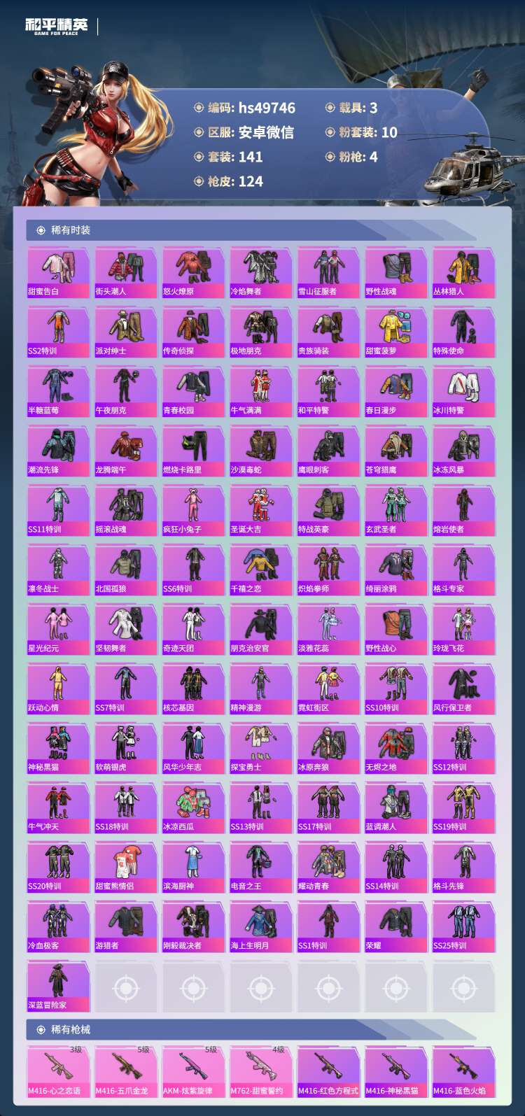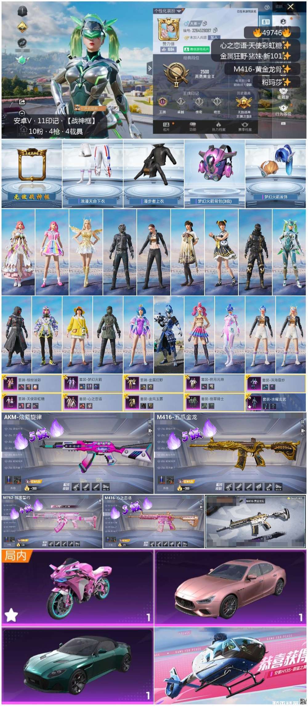 hs49746 安卓微-11王牌印记-有战神框-10粉装-4特效枪-3载具-53644热力值-14