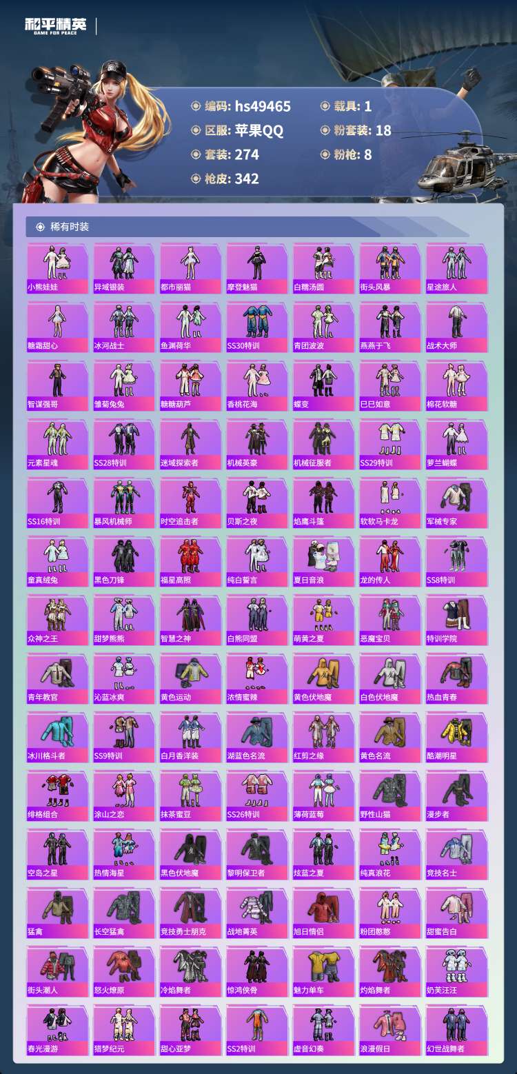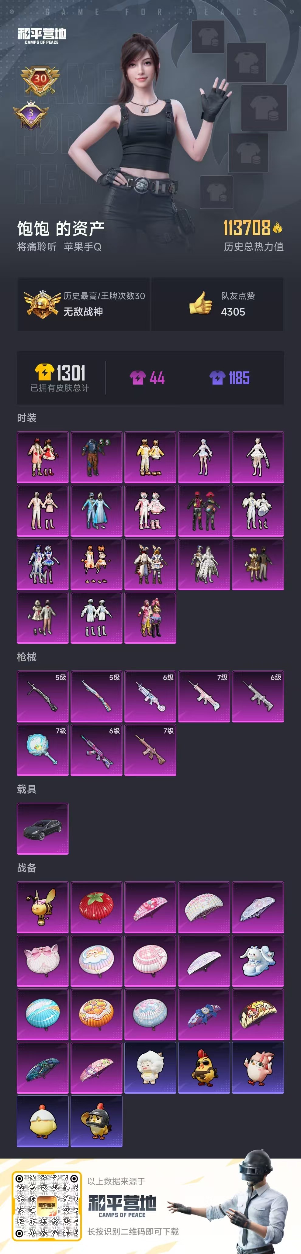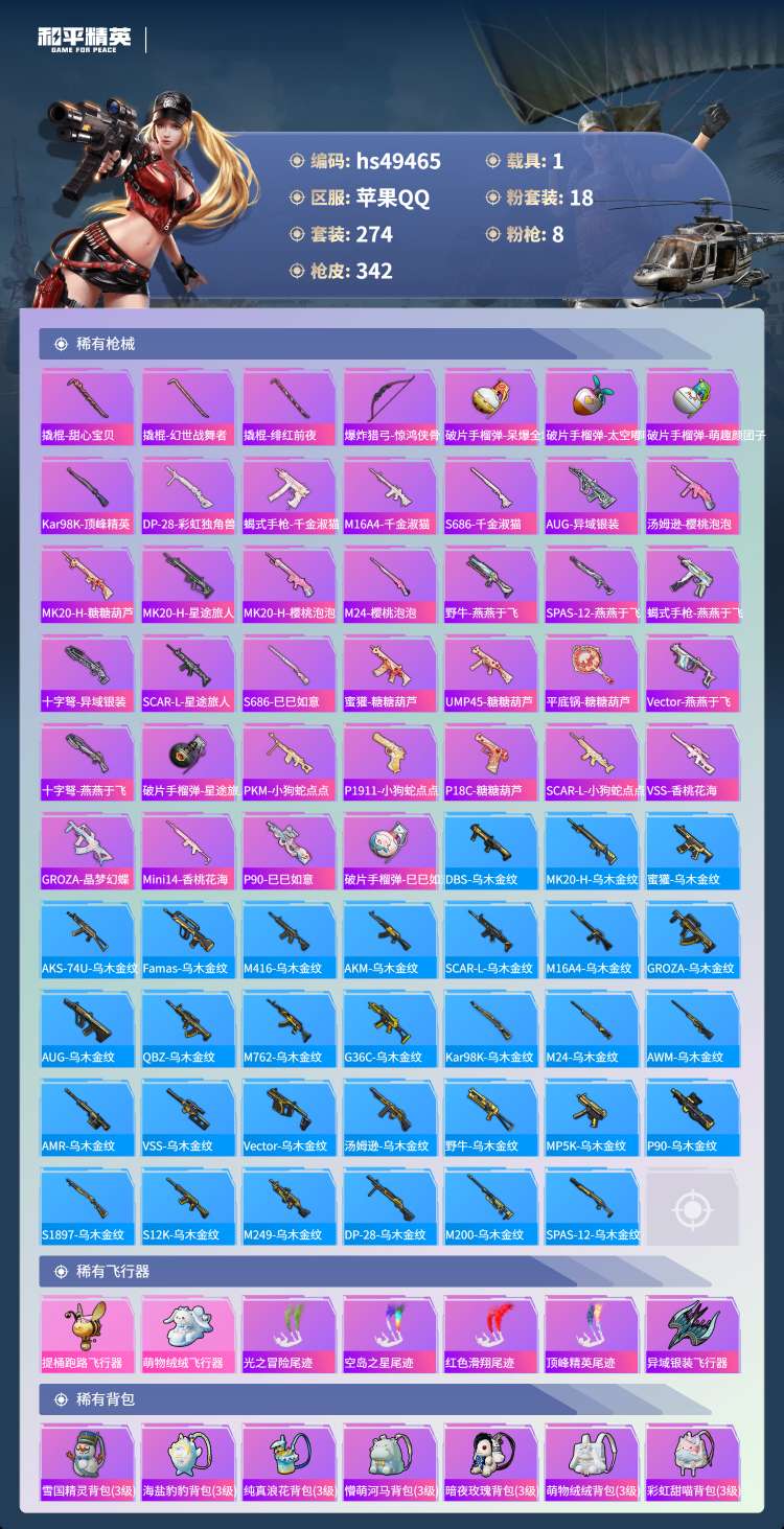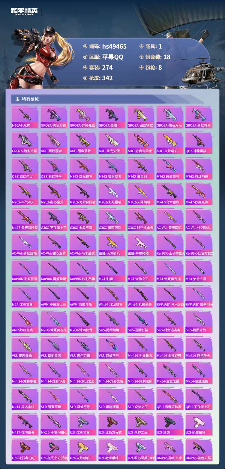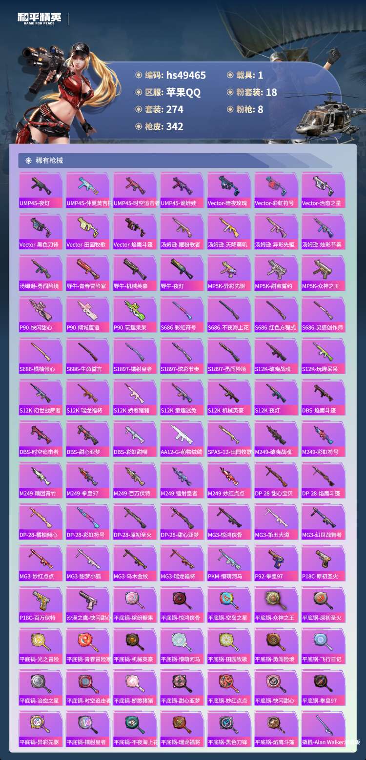 hs49465 苹果手Q-30王牌印记-有战神框-18粉装-8特效枪-1载具-113718热力值-2