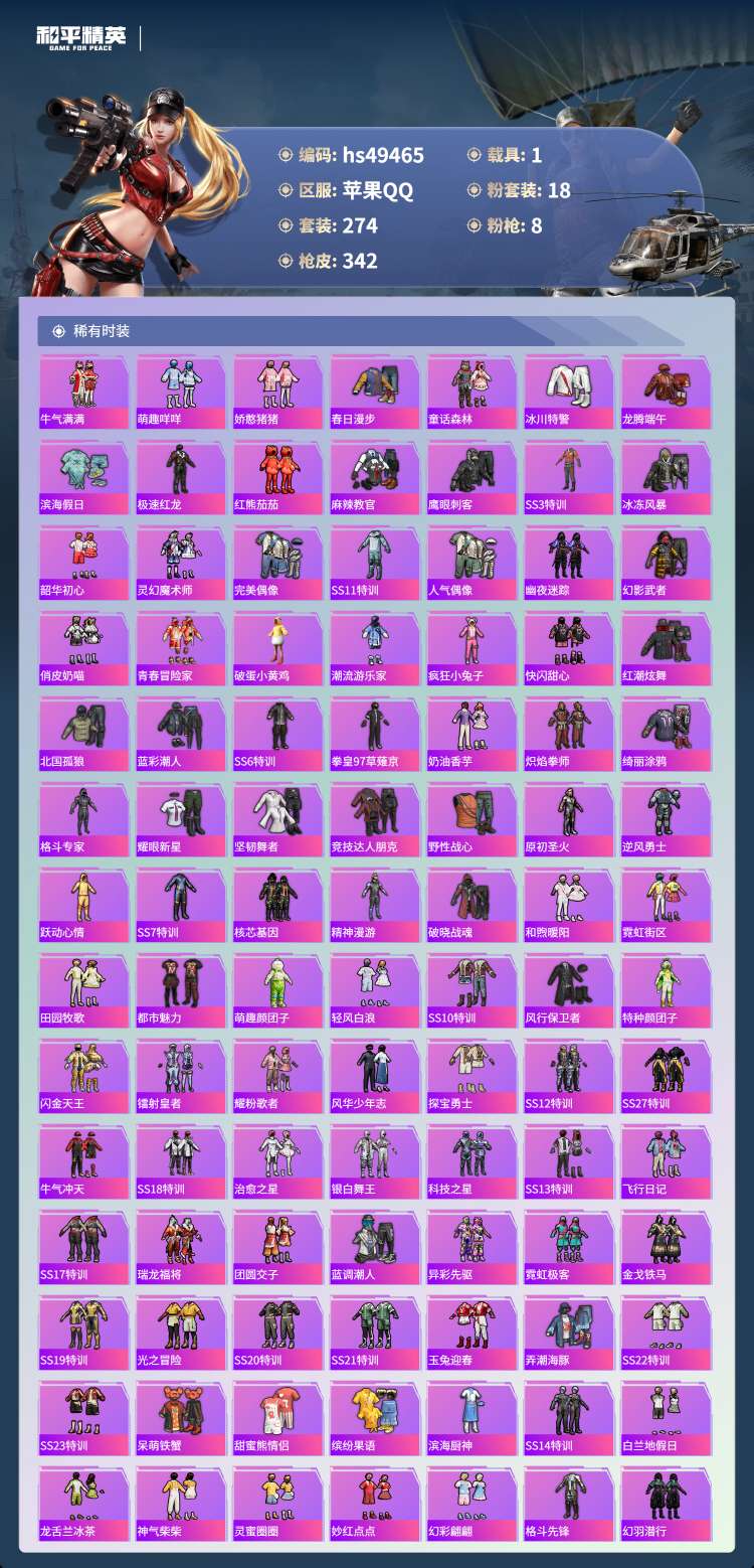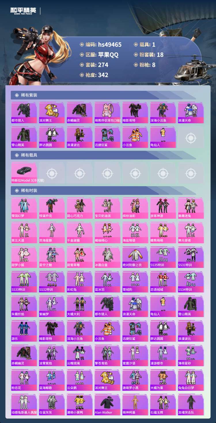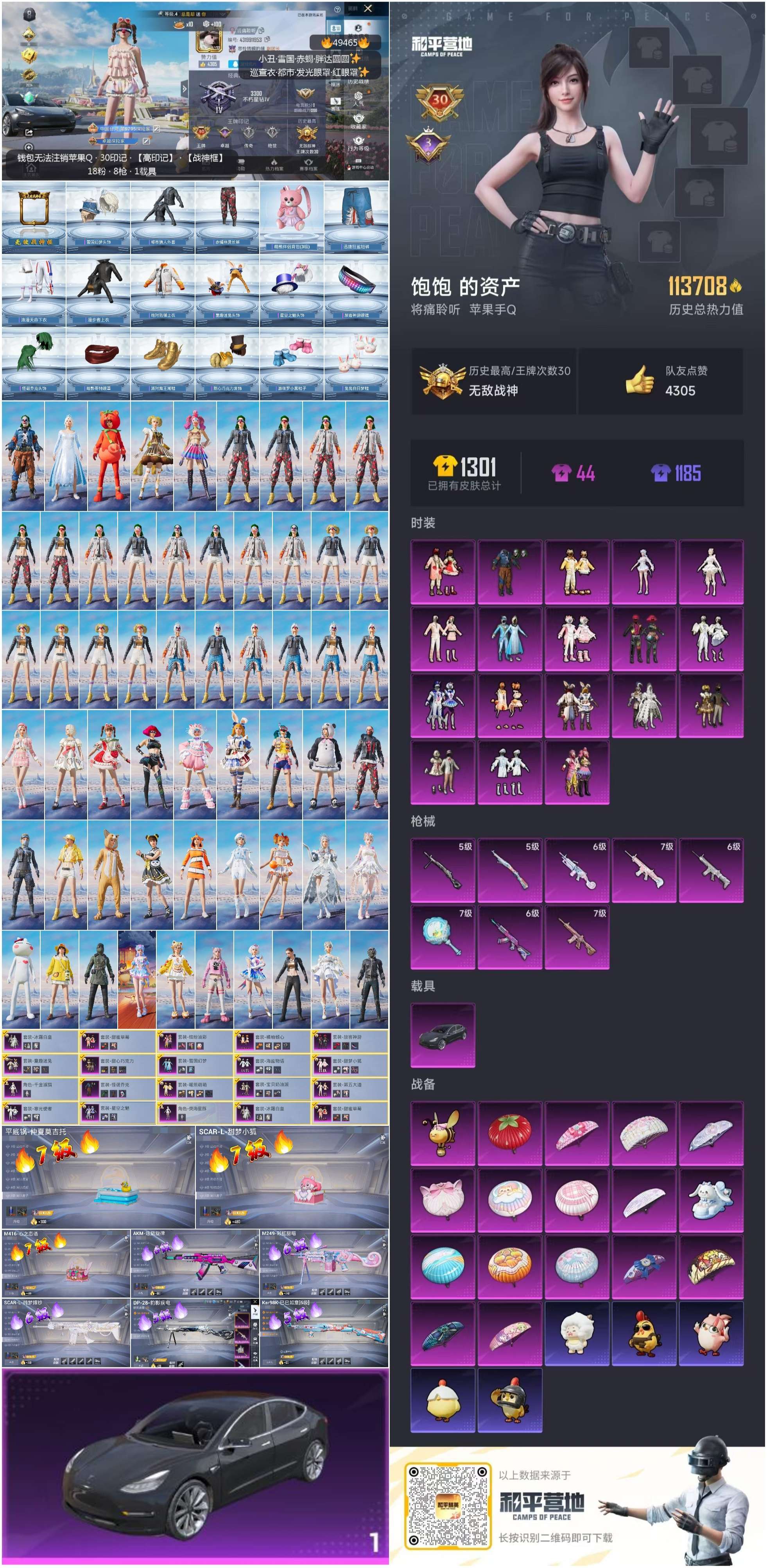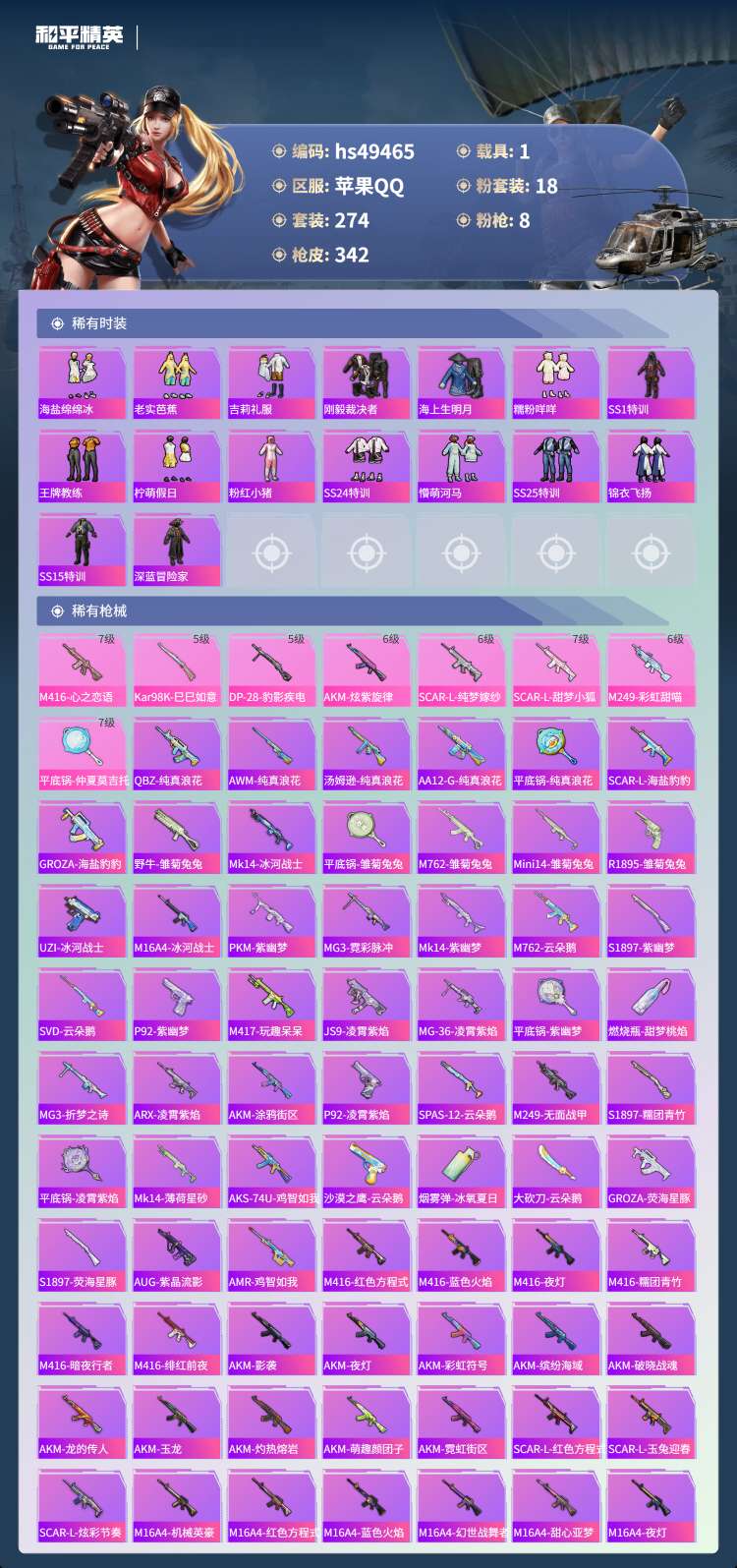 hs49465 苹果手Q-30王牌印记-有战神框-18粉装-8特效枪-1载具-113718热力值-2