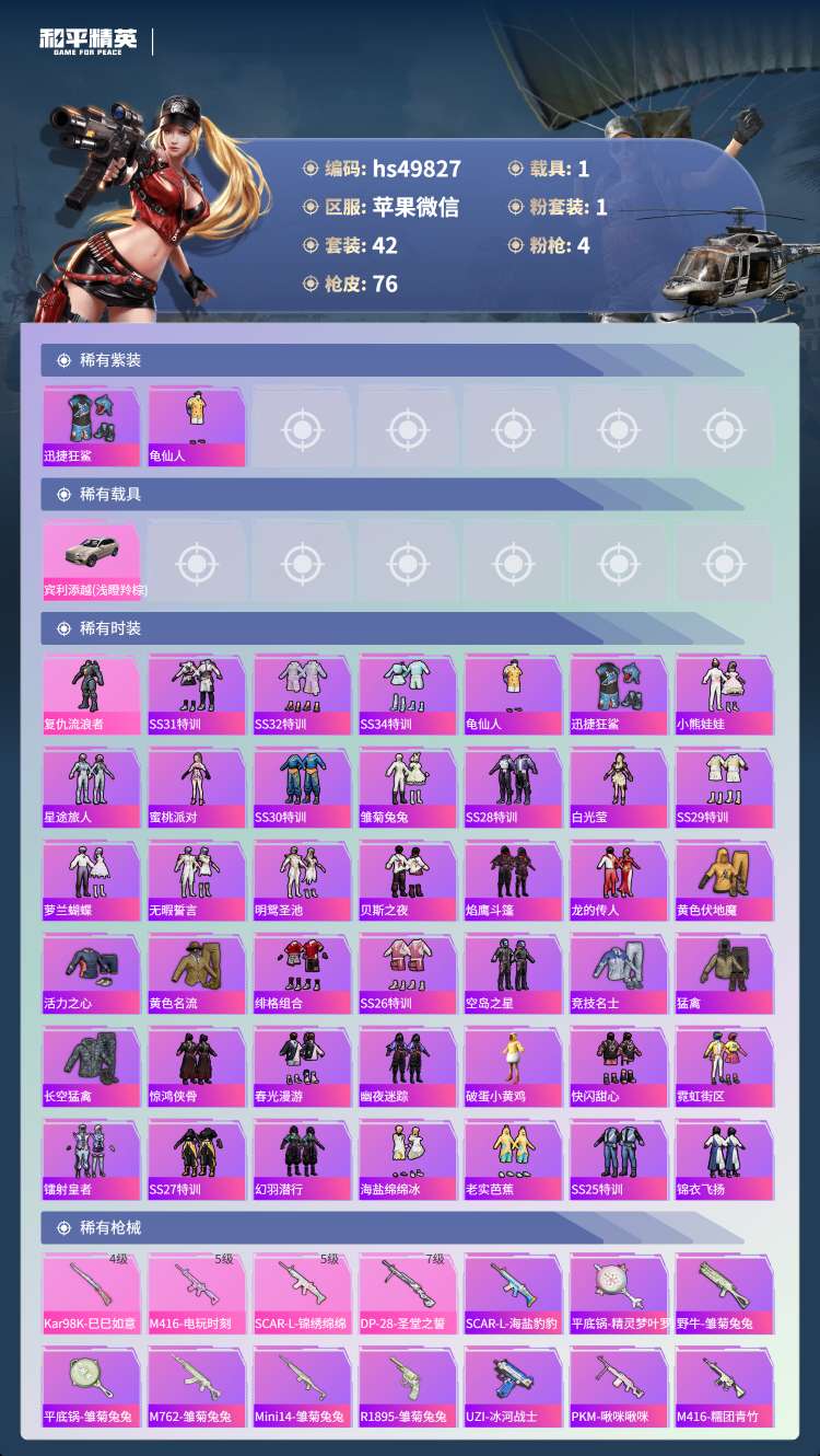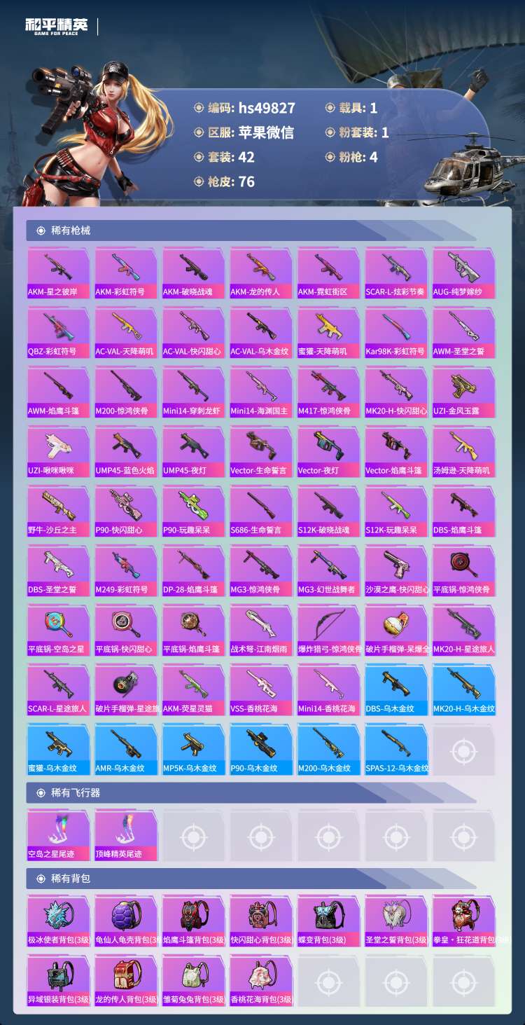 hs49827 苹果微-6王牌印记-1粉装-4特效枪-1载具-22433热力值-42套装-76枪皮