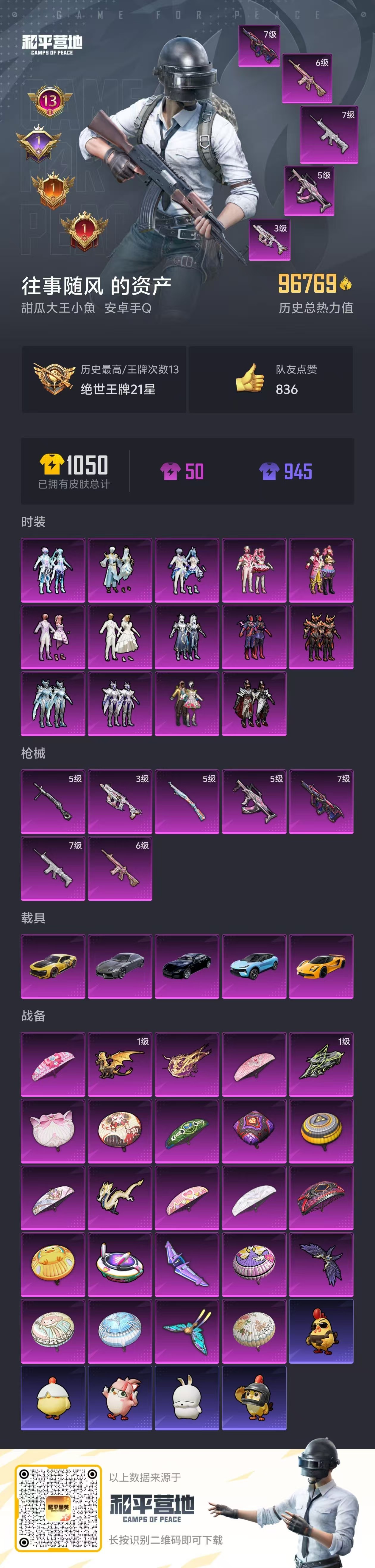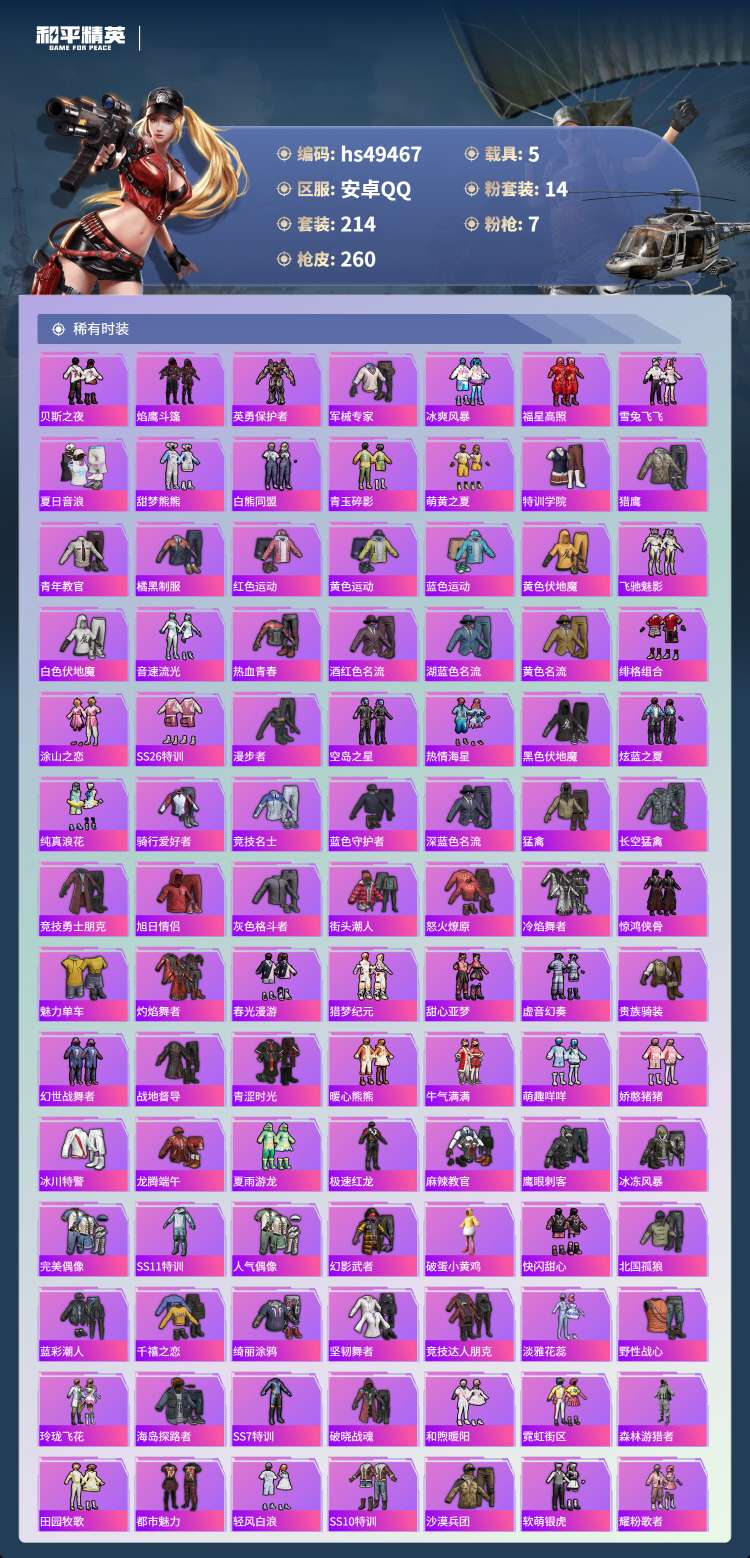 hs49467 安卓手Q-13王牌印记-14粉装-7特效枪-5载具-96769热力值-214套装-2