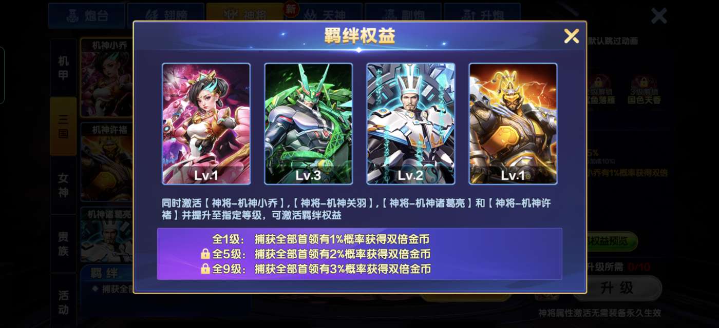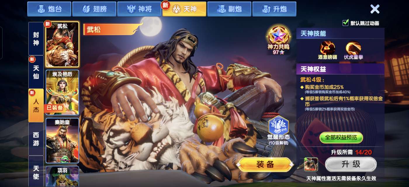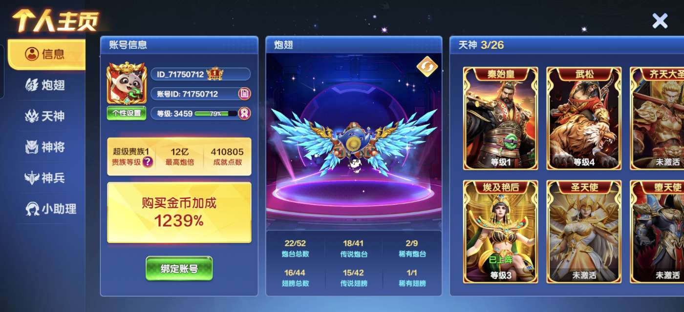 高爆版超级贵族1,实炮12万亿马上满13万亿,金币加成1239,4级天神武松,三级天神埃及艳后